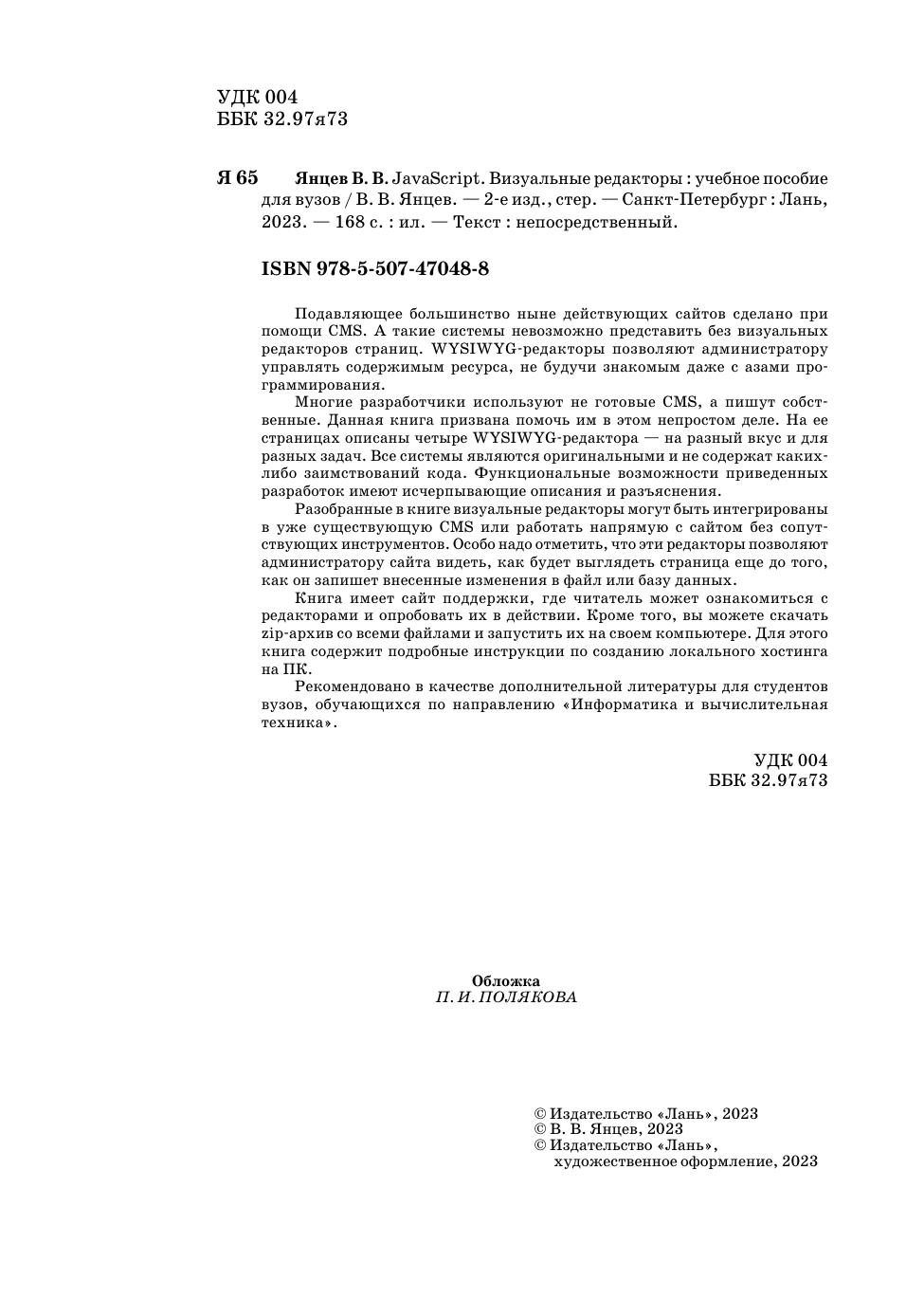 Подавляющее большинство ныне действующих сайтов сделано при помощи CMS. А такие системы невозможно представить без визуальных редакторов страниц. WYSIWYG редакторы позволяют администратору управлять содержимым ресурса, не будучи знакомым даже с азами про-граммирования. Многие разработчики используют не готовые CMS, а пишут собст-венные. Данная книга призвана помочь им в этом непростом деле. На ее страницах описаны четыре WYSIWYG редактора – на разный вкус и для разных задач. Все системы являются оригинальными и не содержат каких-либо заимствований кода. Функциональные возможности приведенных разработок имеют исчерпывающие описания и разъяснения. Разобранные в книге визуальные редакторы могут быть интегрированы в уже существующую CMS или работать напрямую с сайтом без сопут-ствующих инструментов. Особо надо отметить, что эти редакторы позволяют администратору сайта видеть, как будет выглядеть страница еще до того, как он запишет внесенные изменения в файл или базу данных. Книга имеет сайт поддержки, где читатель может ознакомиться с редакторами и опробовать их в действии. Кроме того, вы можете скачать zip-архив со всеми файлами и запустить их на своем компьютере. Для этого книга содержит подробные инструкции по созданию локального хостинга на ПК. Рекомендовано в качестве дополнительной литературы для студентов вузов, обучающихся по направлению «Информатика и вычислительная техника».