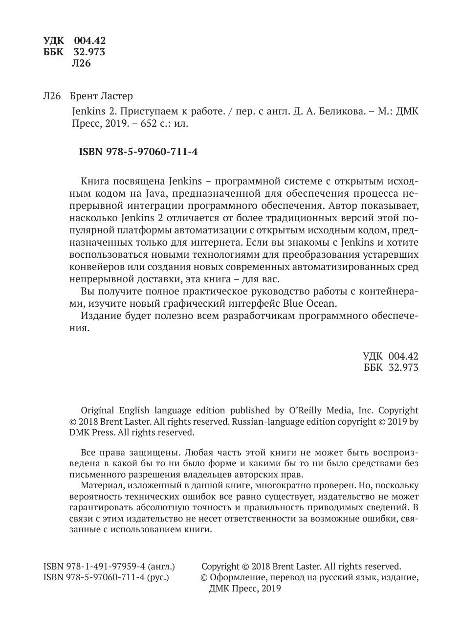 Книга посвящена Jenkins – программной системе с открытым исходным кодом на Java, предназначенной для обеспечения процесса непрерывной интеграции программного обеспечения. Автор показывает, насколько Jenkins 2 отличается от более традиционных версий этой популярной платформы автоматизации с открытым исходным кодом, предназначенных только для интернета. Если вы знакомы с Jenkins и хотите воспользоваться новыми технологиями для преобразования устаревших конвейеров или создания новых современных автоматизированных сред непрерывной доставки, эта книга – для вас.