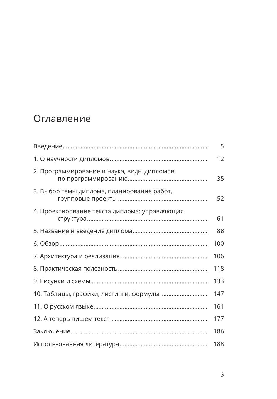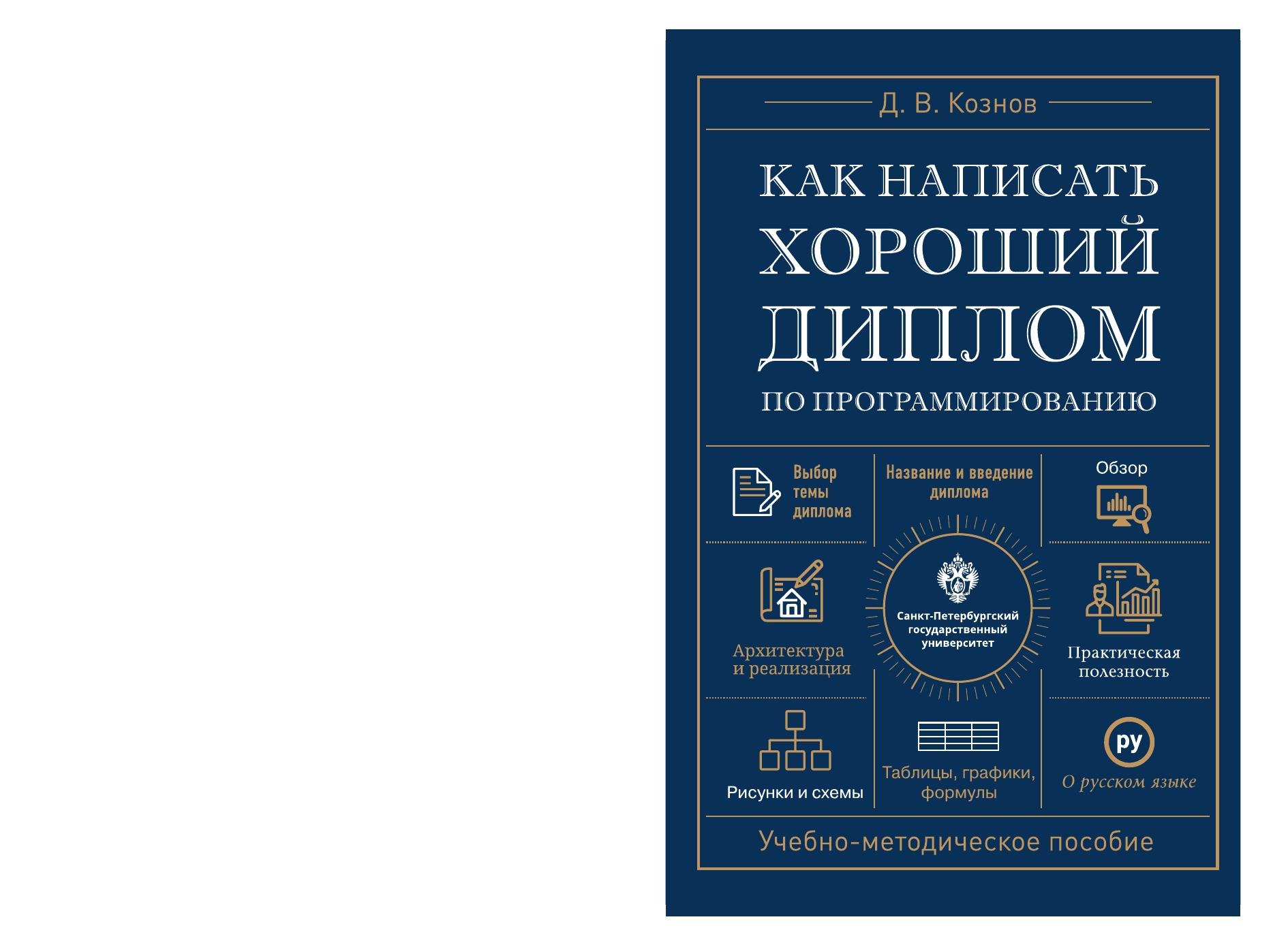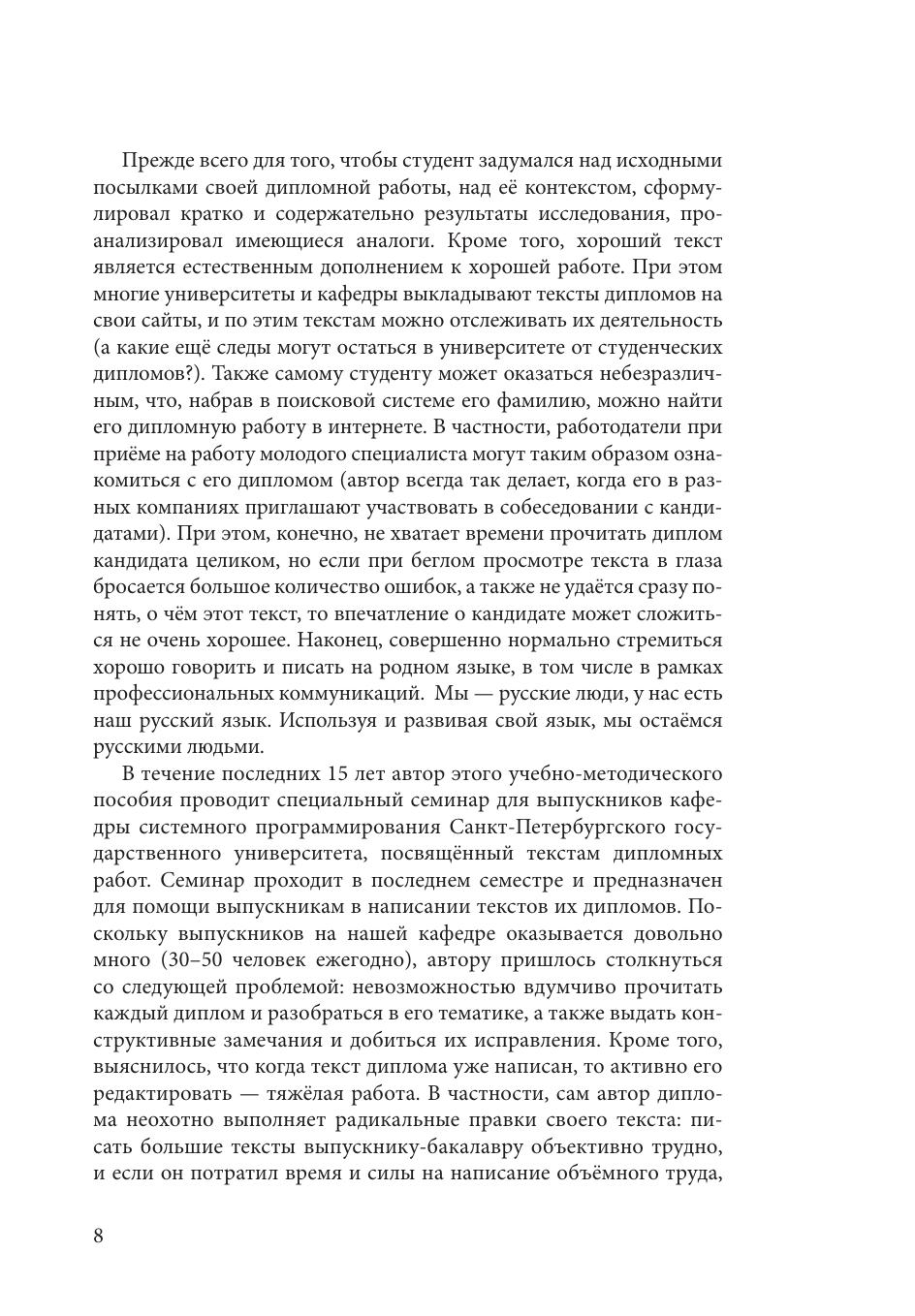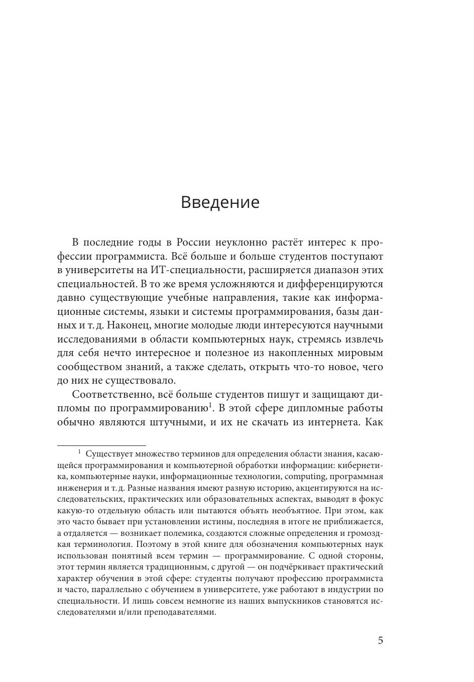 Программирование становится все более популярной профессией в России, все больше студентов учатся и получают эту специальность в наших университетах, и все больше создаётся выпускных дипломных работ по этой дисциплине. Однако подготовка дипломов и написание текстов оказывается для студентов непростой задачей. Изложен подход к написанию текстов дипломных работ по программированию, уделено внимание выбору темы диплома, сбору материалов для дипломной работы для студентов, работающих в компании, а также планированию расписания и трудозатрат при подготовке диплома. Учебно-методическое пособие адресовано бакалаврам, магистрантам и аспирантам компьютерных дисциплин.