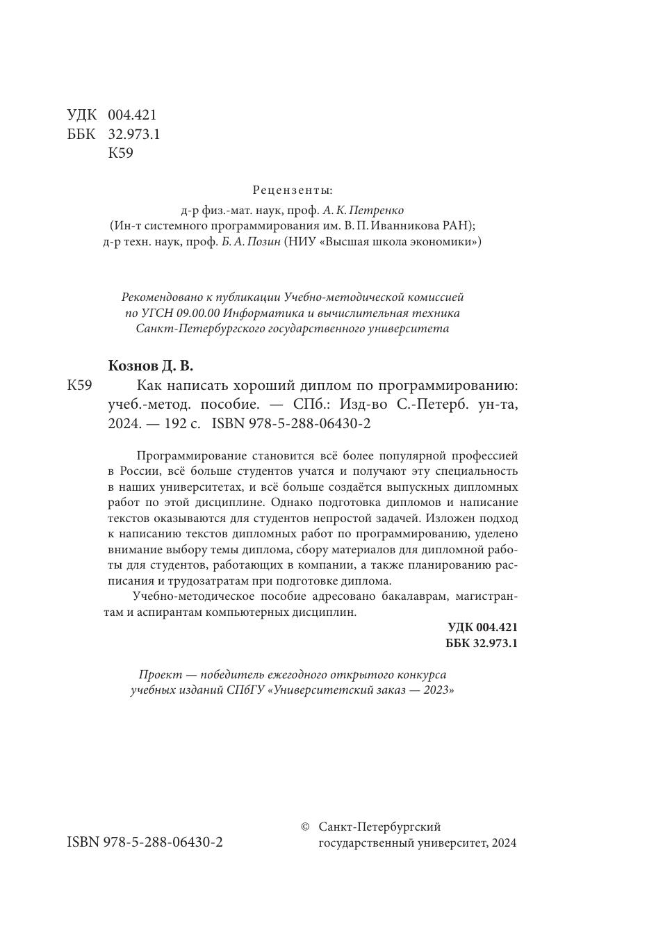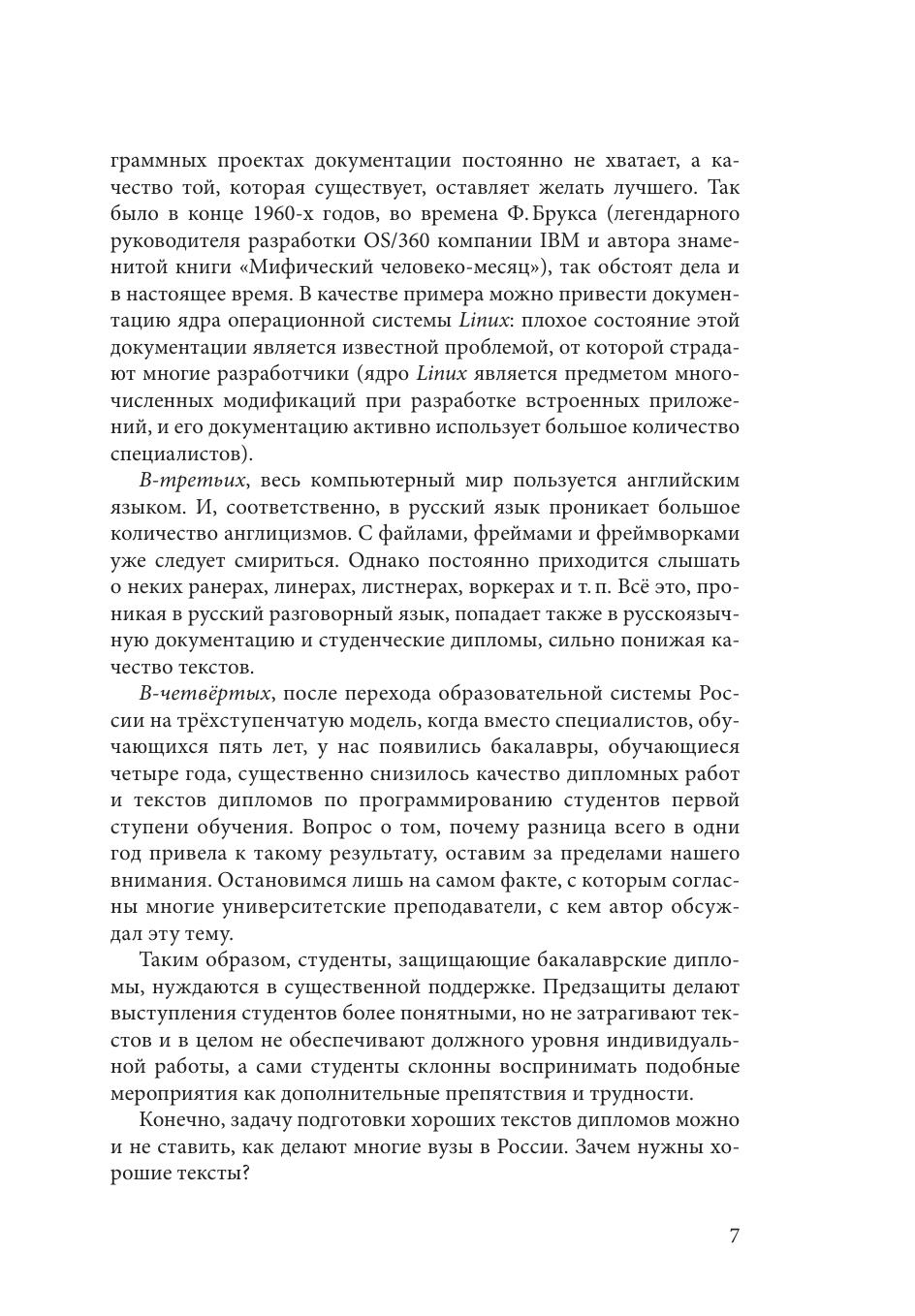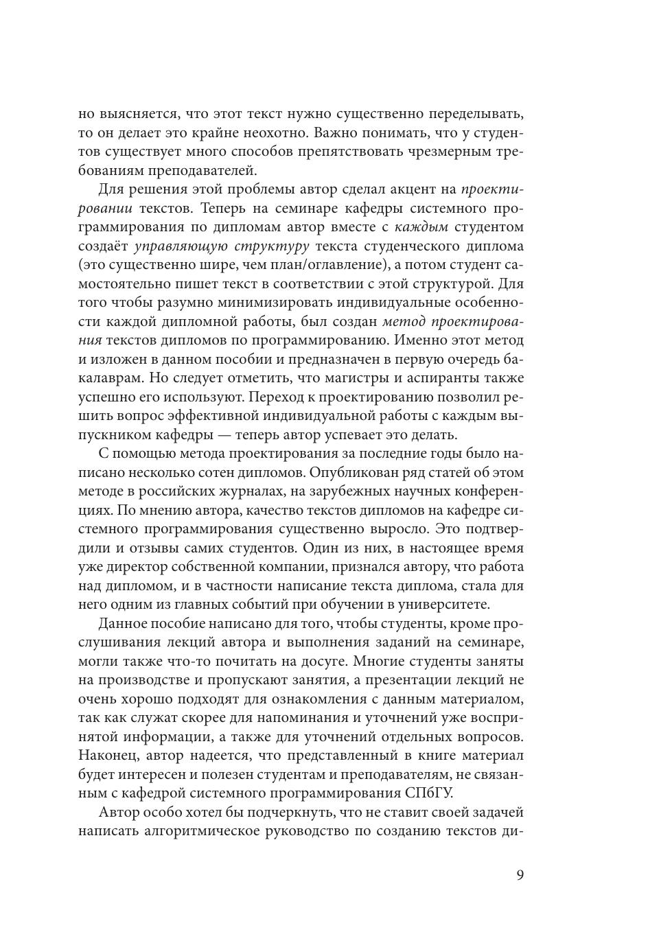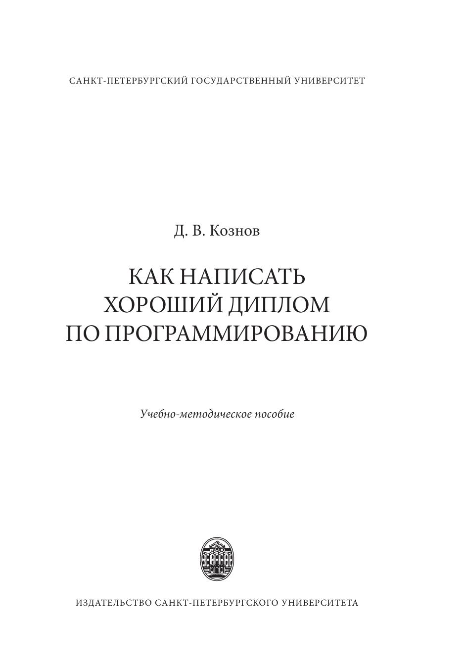 Программирование становится все более популярной профессией в России, все больше студентов учатся и получают эту специальность в наших университетах, и все больше создаётся выпускных дипломных работ по этой дисциплине. Однако подготовка дипломов и написание текстов оказывается для студентов непростой задачей. Изложен подход к написанию текстов дипломных работ по программированию, уделено внимание выбору темы диплома, сбору материалов для дипломной работы для студентов, работающих в компании, а также планированию расписания и трудозатрат при подготовке диплома. Учебно-методическое пособие адресовано бакалаврам, магистрантам и аспирантам компьютерных дисциплин.
