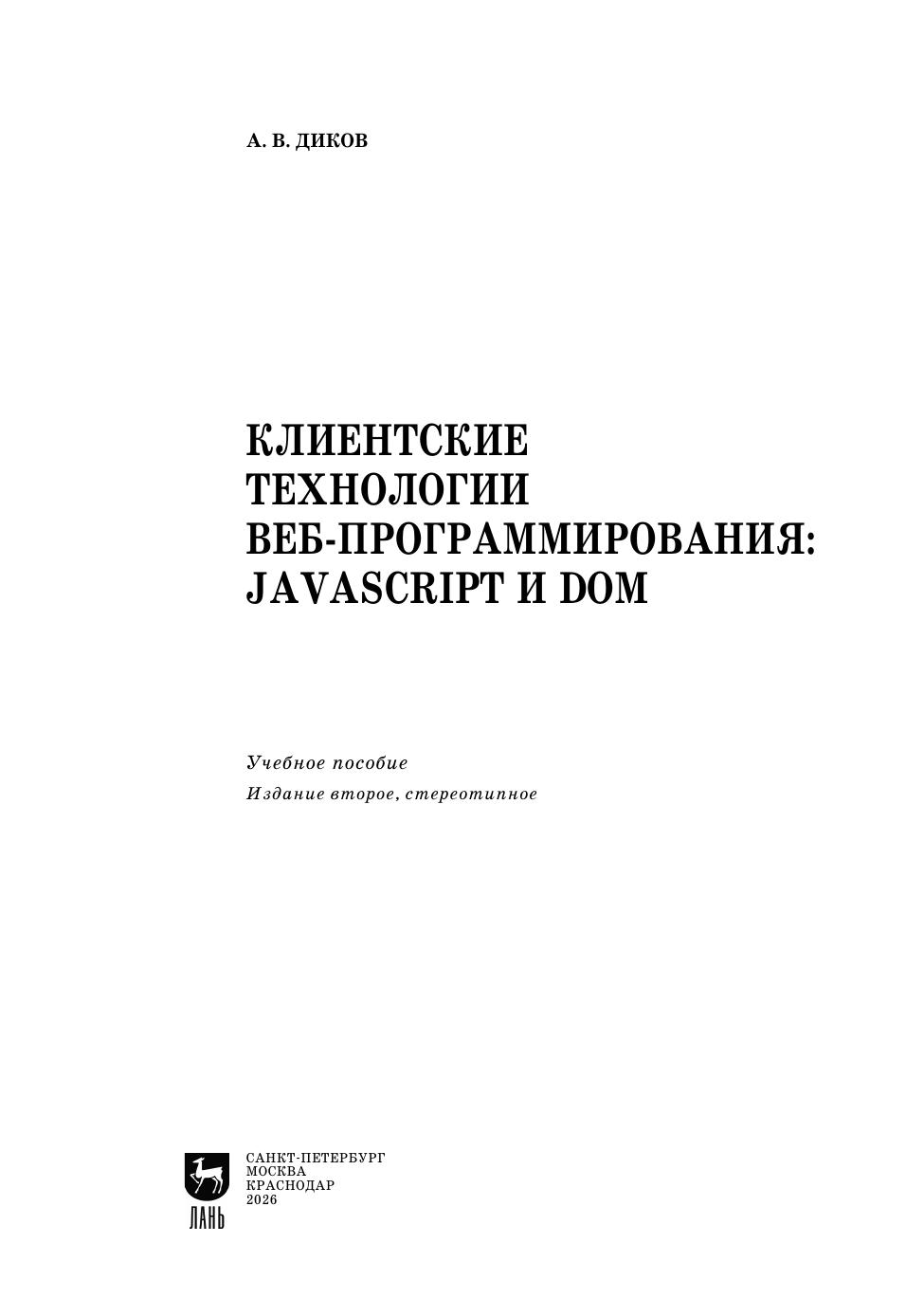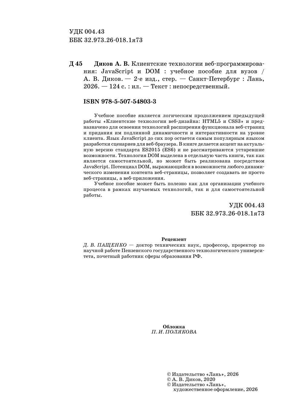 Учебное пособие является логическим продолжением предыдущей работы «Клиентские технологии веб-дизайна: HTML5 и CSS3» и предназначено для освоения технологий расширения функционала веб-страниц и придания им подлинной динамичности и интерактивности на уровне клиента. Язык JavaScript до сих пор остается самым популярным языком разработки сценариев для веб-браузера. В книге делается акцент на актуальную версию стандарта ES2015 (ES6) и не рассматриваются устаревшие возможности. Технология DOM выделена в отдельную часть книги, так как является самостоятельной, но может быть реализована посредством JavaScript. Потенциал DOM, выражающийся в возможности любого динамического изменения контента веб-страницы, позволяет создавать не просто веб-страницы, а веб-приложения. Учебное пособие может быть полезно как для организации учебного процесса в рамках изучаемых технологий, так и для самостоятельной работы.