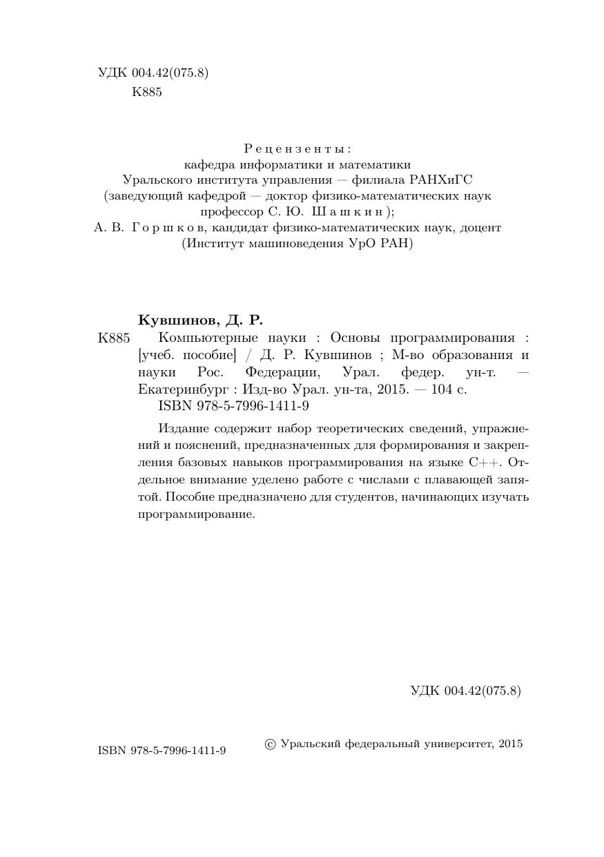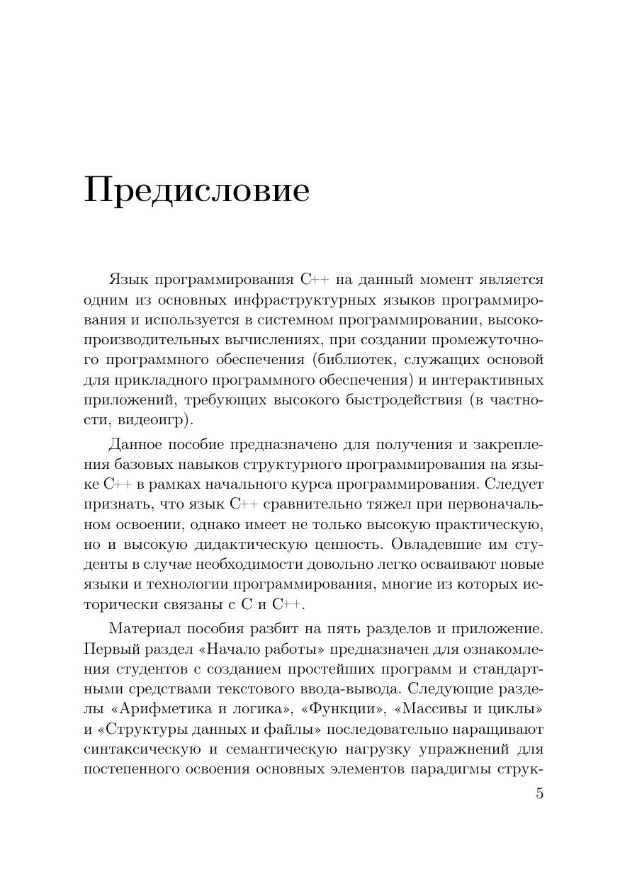 Издание содержит набор теоретических сведений, упражнений и пояснений, предназначенных для формирования и закрепления базовых навыков программирования на языке C++. Отдельное внимание уделено работе с числами с плавающей запятой. Пособие предназначено для студентов, начинающих изучать программирование.