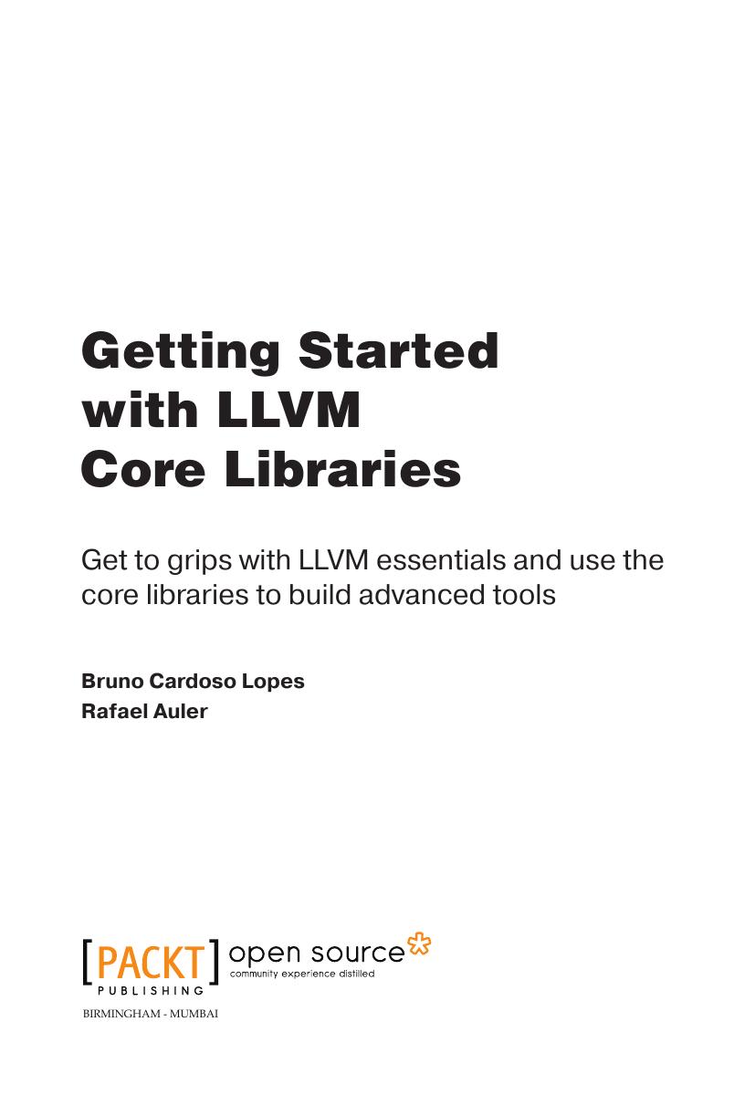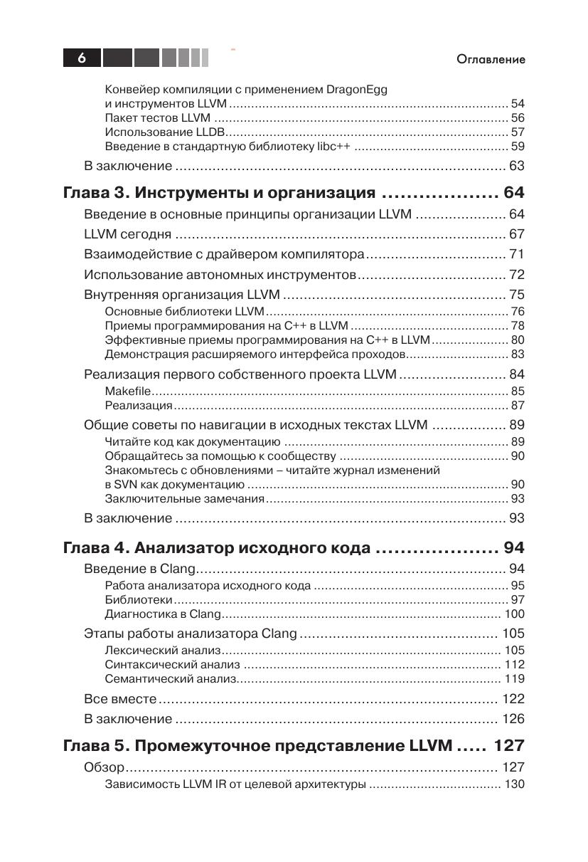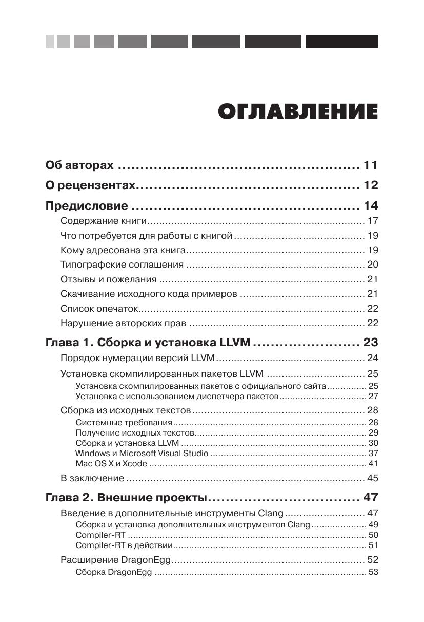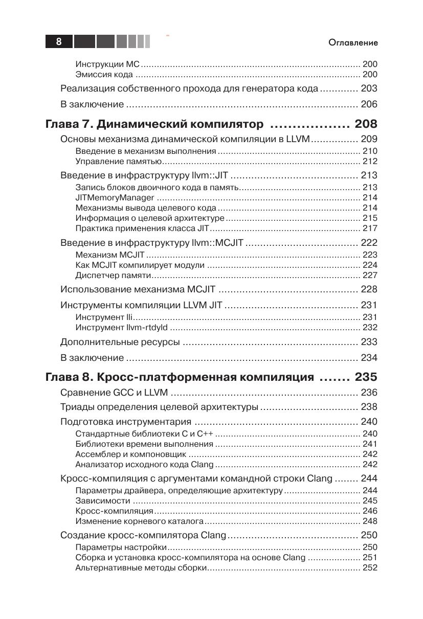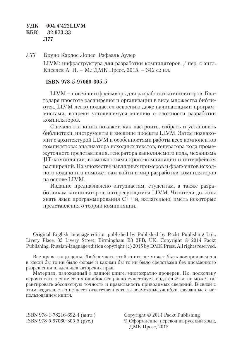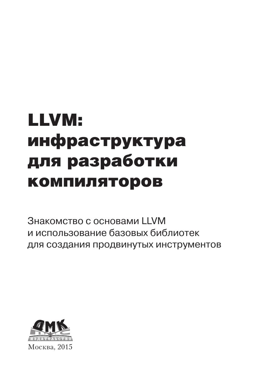 LLVM – новейший фреймворк для разработки компиляторов. Благодаря простоте расширения и организации в виде множества библиотек, LLVM легко поддается освоению даже начинающими программистами, вопреки устоявшемуся мнению о сложности разработки компиляторов. Сначала эта книга покажет, как настроить, собрать и установить библиотеки, инструменты и внешние проекты LLVM. Затем познакомит с архитектурой LLVM и особенностями работы всех компонентов компилятора: анализатора исходных текстов, генератора кода промежуточного представления, генератора выполняемого кода, механизма JIT-компиляции, возможностями кросскомпиляции и интерфейсом расширений. На множестве наглядных примеров и фрагментов исходного кода книга поможет вам войти в мир разработки компиляторов на основе LLVM. Издание предназначено энтузиастам, студентам, а также разработчикам компиляторов, интересующимся LLVM. Читатели должны знать язык программирования C++ и, желательно, иметь некоторые представления о теории компиляции.