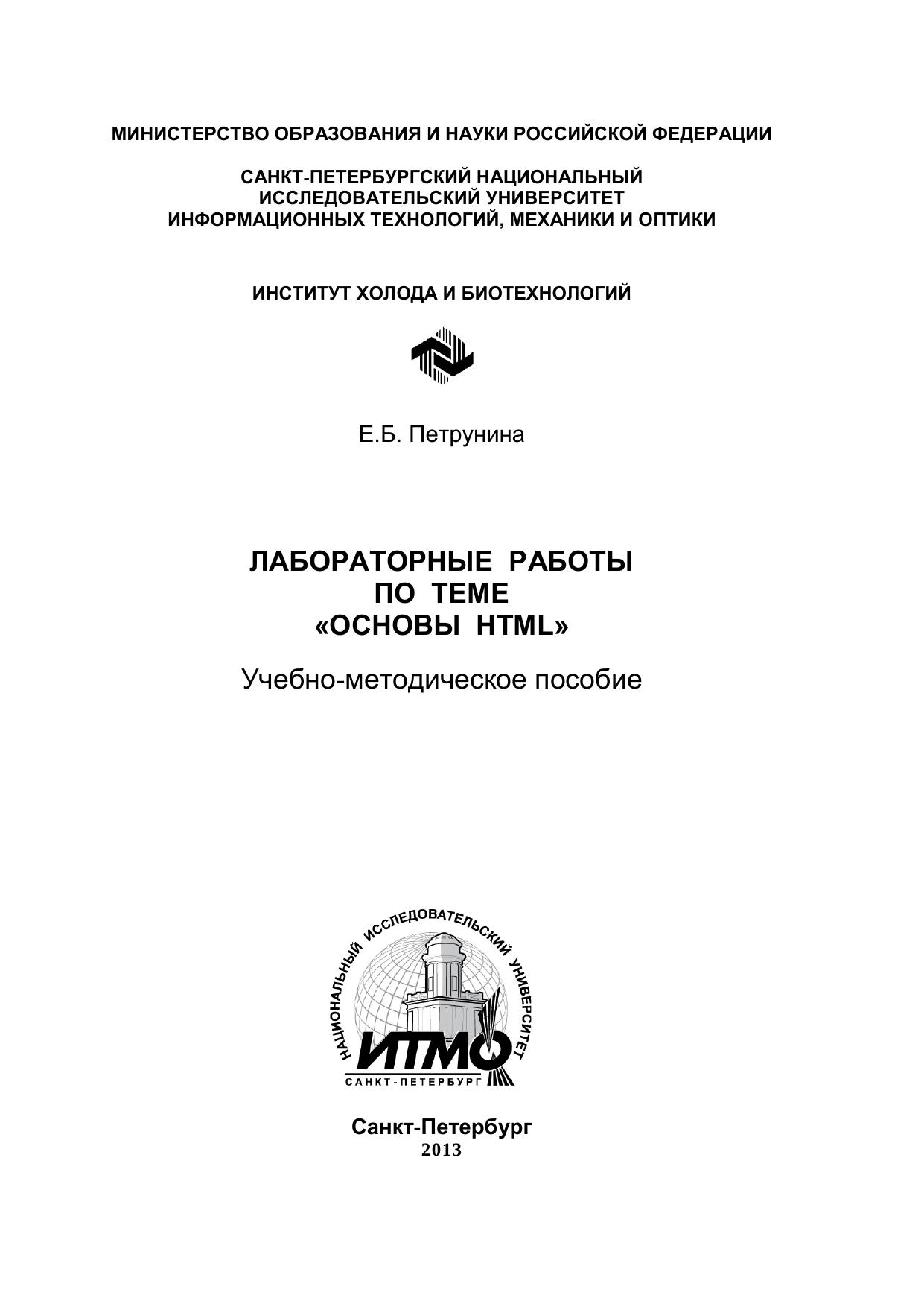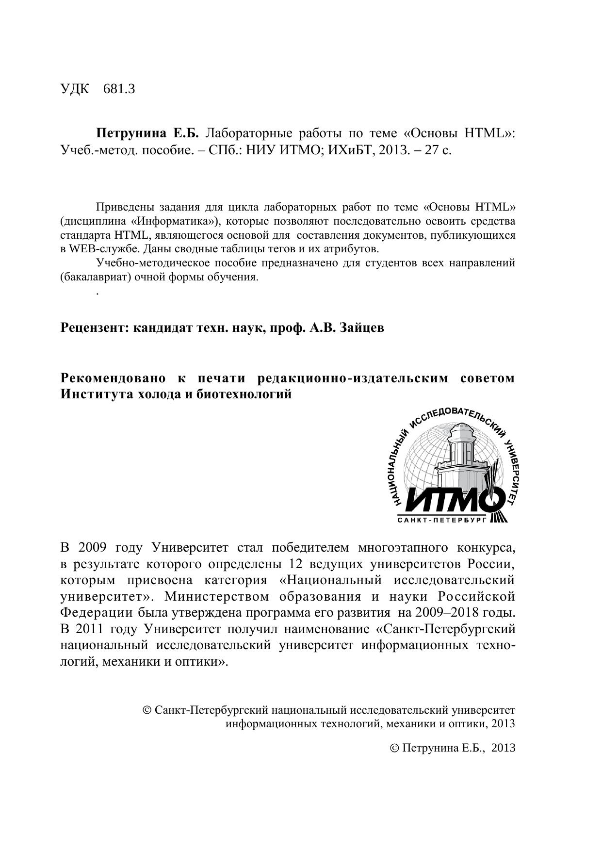 Приведены задания для цикла лабораторных работ по теме «Основы HTML» (дисциплина «Информатика»), которые позволяют последовательно освоить средства стандарта HTML, являющегося основой для составления документов, публикующихсяв WEB-службе. Даны сводные таблицы тегов и их атрибутов. Учебно-методическое пособие предназначено для студентов всех направлений (бакалавриат) очной формы обучения.