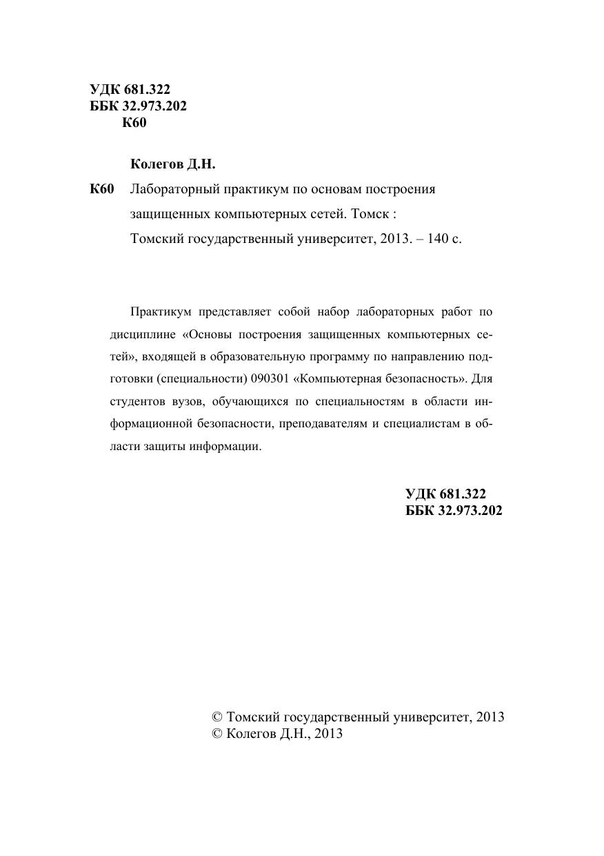Практикум представляет собой набор лабораторных работ по дисциплине «Основы построения защищенных компьютерных сетей», входящей в образовательную программу по направлению подготовки (специальности) 090301 «Компьютерная безопасность». Для студентов вузов, обучающихся по специальностям в области информационной безопасности, преподавателям и специалистам в области защиты информации.