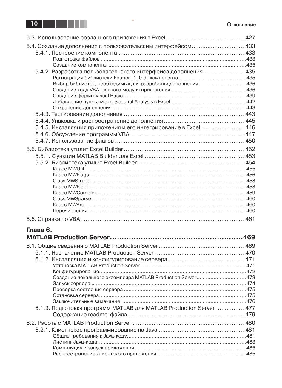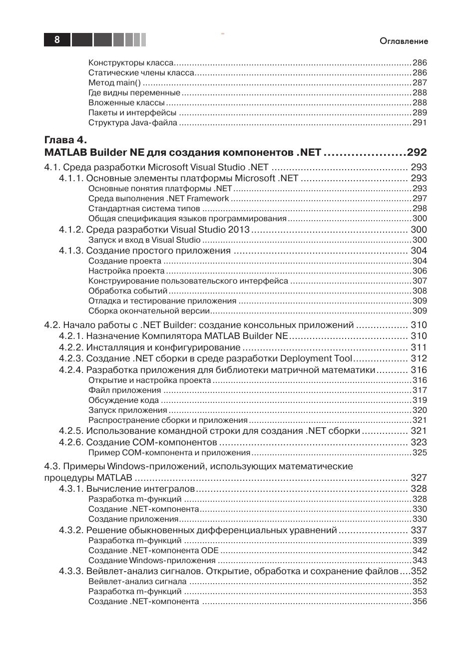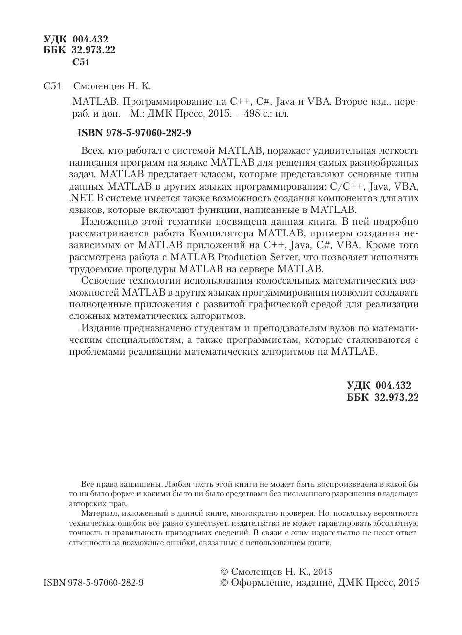Всех, кто работал с системой MATLAB, поражает удивительная легкость написания программ на языке MATLAB для решения самых разнообразных задач. MATLAB предлагает классы, которые представляют основные типы данных MATLAB в других языках программирования: С/С++, Java, VBA, .NET. В системе имеется также возможность создания компонентов для этих языков, которые включают функции, написанные в MATLAB. Изложению этой тематики посвящена данная книга. В ней подробно рассматривается работа Компилятора MATLAB, примеры создания независимых от MATLAB приложений на C++, Java, C#, VBA. Кроме того рассмотрена работа с MATLAB Production Server, что позволяет исполнять трудоемкие процедуры MATLAB на сервере MATLAB. Освоение технологии использования колоссальных математических возможностей MATLAB в других языках программирования позволит создавать полноценные приложения с развитой графической средой для реализации сложных математических алгоритмов. Издание предназначено студентам и преподавателям вузов по математическим специальностям, а также программистам, которые сталкиваются с проблемами реализации математических алгоритмов на MATLAB.