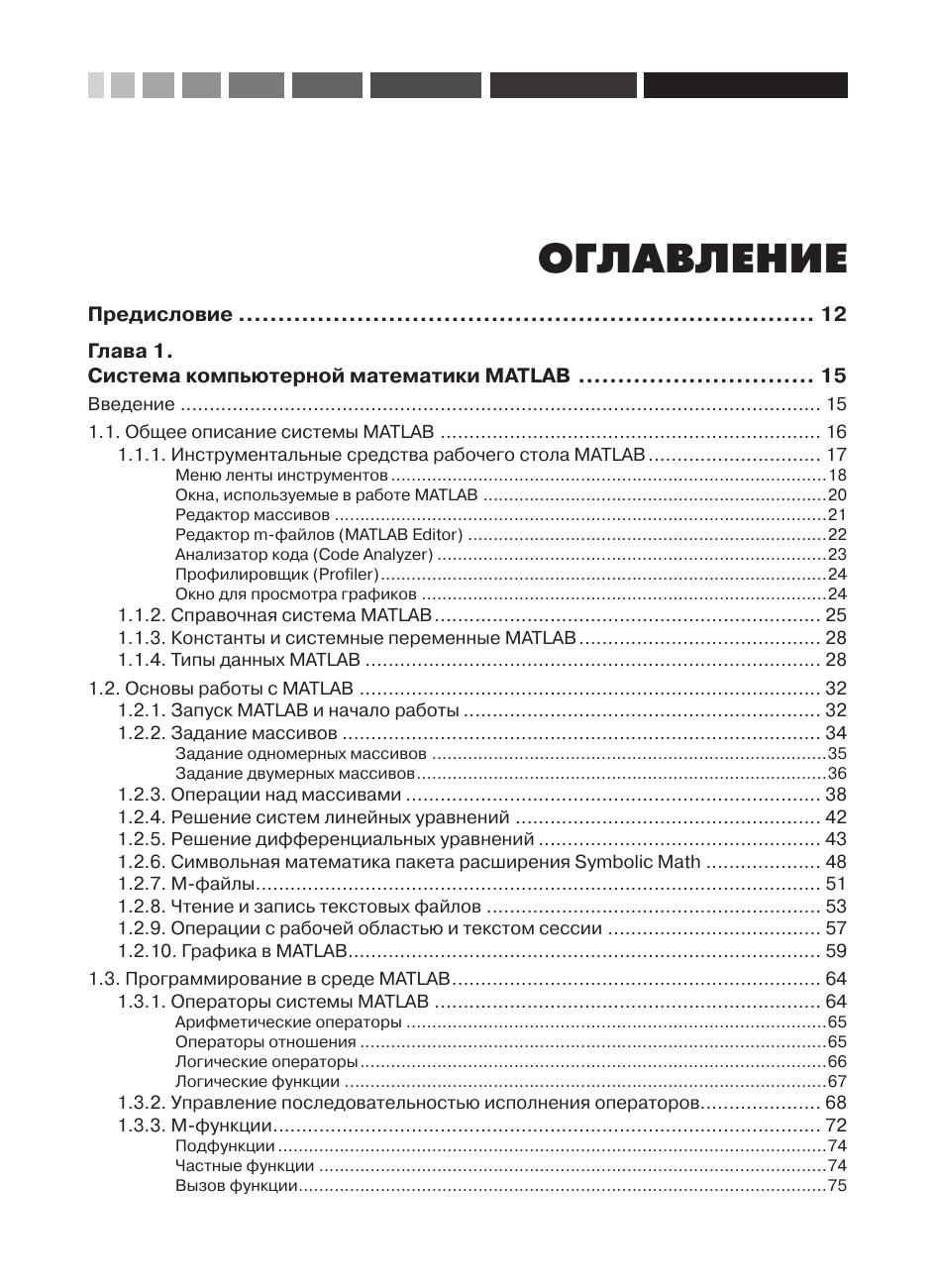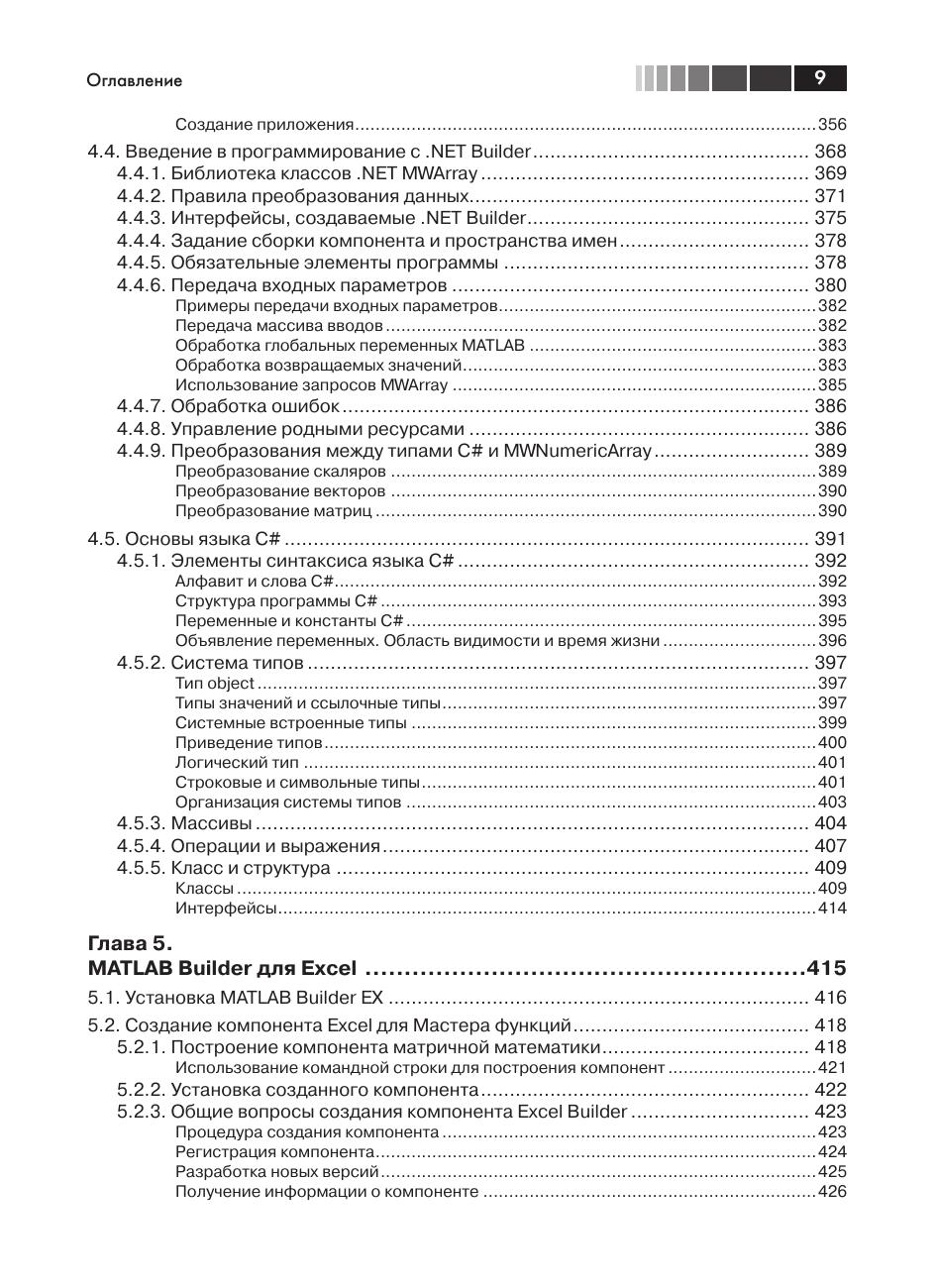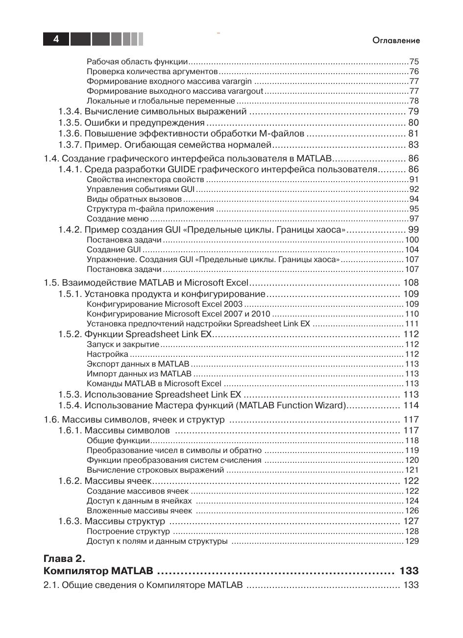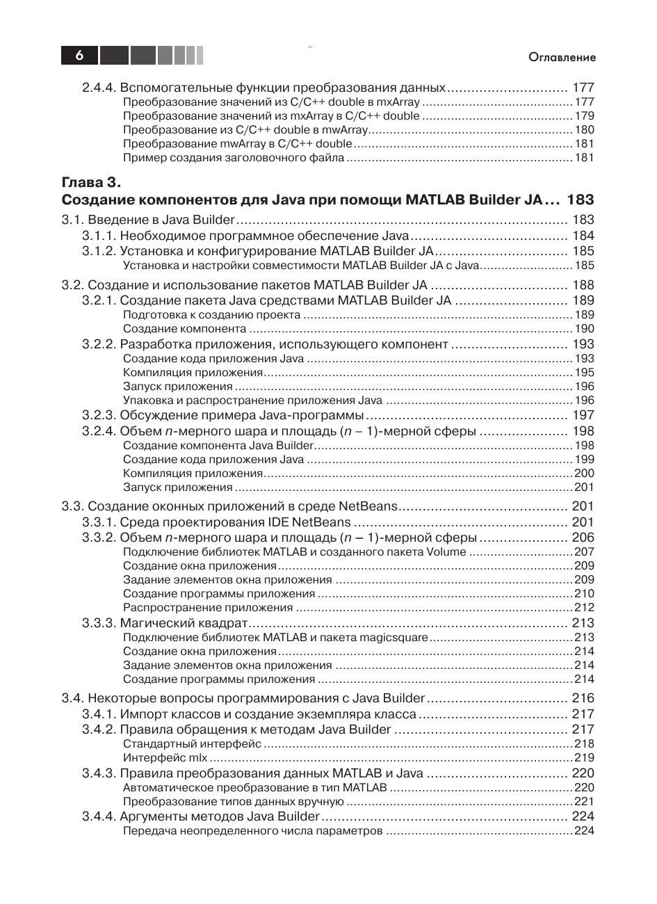 Всех, кто работал с системой MATLAB, поражает удивительная легкость написания программ на языке MATLAB для решения самых разнообразных задач. MATLAB предлагает классы, которые представляют основные типы данных MATLAB в других языках программирования: С/С++, Java, VBA, .NET. В системе имеется также возможность создания компонентов для этих языков, которые включают функции, написанные в MATLAB. Изложению этой тематики посвящена данная книга. В ней подробно рассматривается работа Компилятора MATLAB, примеры создания независимых от MATLAB приложений на C++, Java, C#, VBA. Кроме того рассмотрена работа с MATLAB Production Server, что позволяет исполнять трудоемкие процедуры MATLAB на сервере MATLAB. Освоение технологии использования колоссальных математических возможностей MATLAB в других языках программирования позволит создавать полноценные приложения с развитой графической средой для реализации сложных математических алгоритмов. Издание предназначено студентам и преподавателям вузов по математическим специальностям, а также программистам, которые сталкиваются с проблемами реализации математических алгоритмов на MATLAB.