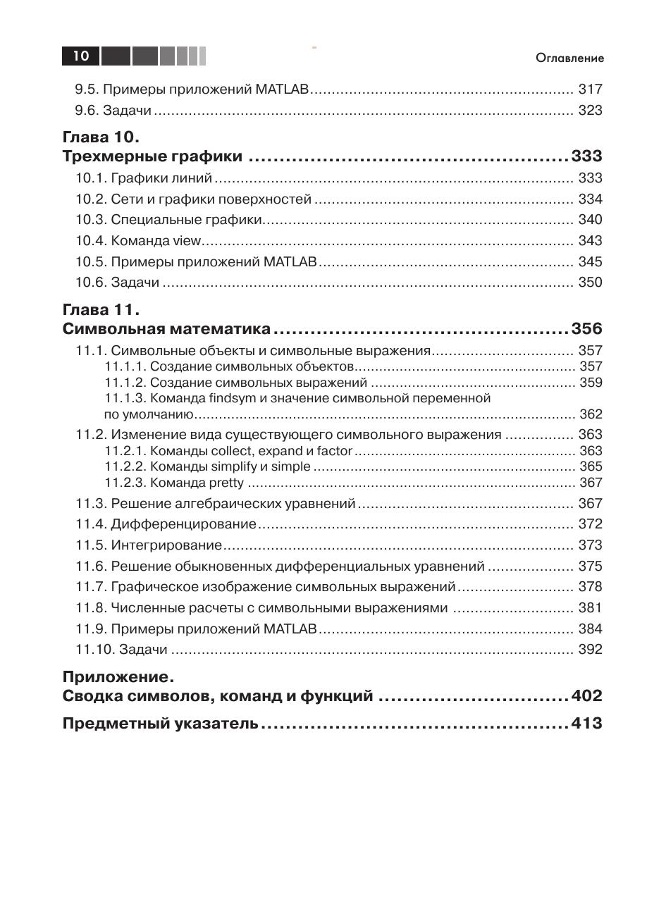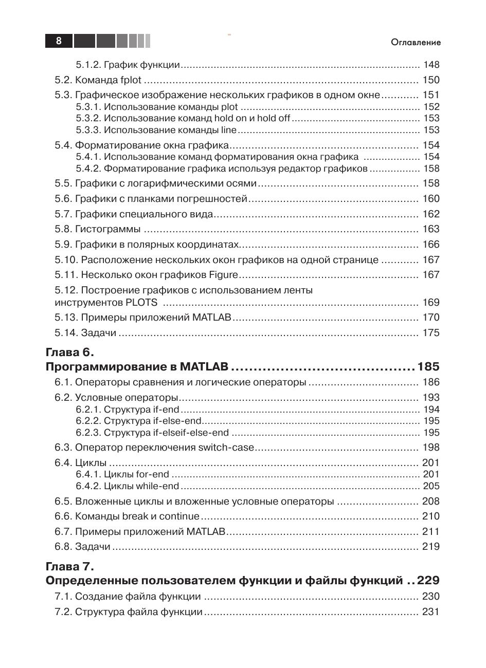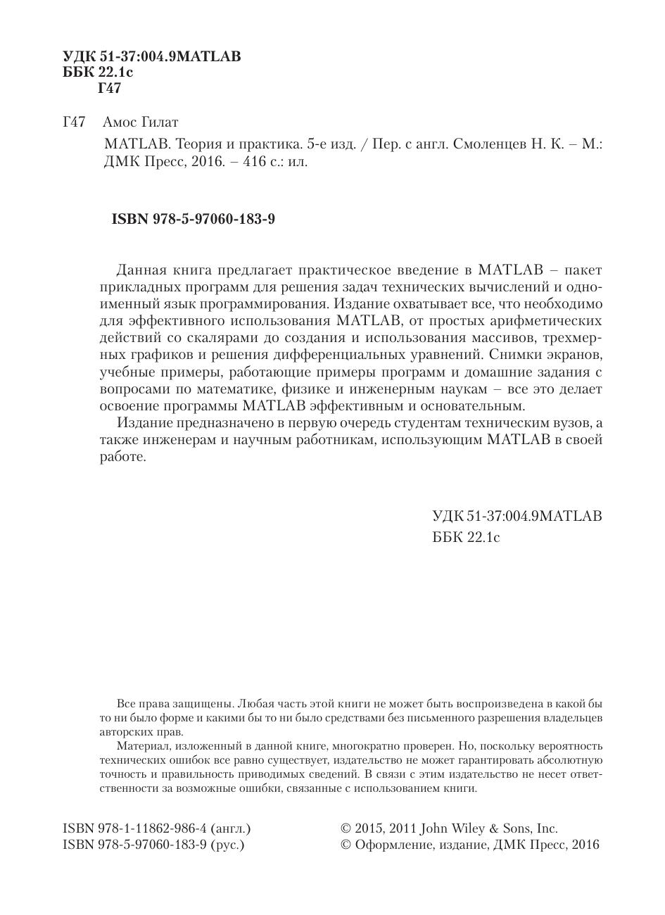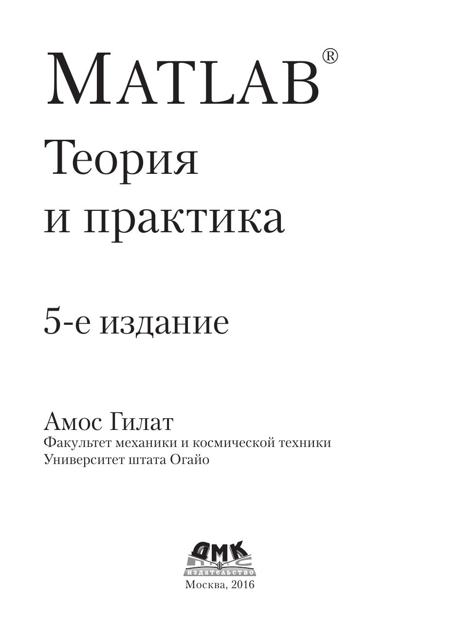 Данная книга предлагает практическое введение в MATLAB – пакет прикладных программ для решения задач технических вычислений и одноименный язык программирования. Издание охватывает все, что необходимо для эффективного использования MATLAB, от простых арифметических действий со скалярами до создания и использования массивов, трехмерных графиков и решения дифференциальных уравнений. Снимки экранов, учебные примеры, работающие примеры программ и домашние задания с вопросами по математике, физике и инженерным наукам – все это делает освоение программы MATLAB эффективным и основательным. Издание предназначено в первую очередь студентам техническим вузов, а также инженерам и научным работникам, использующим MATLAB в своей работе.