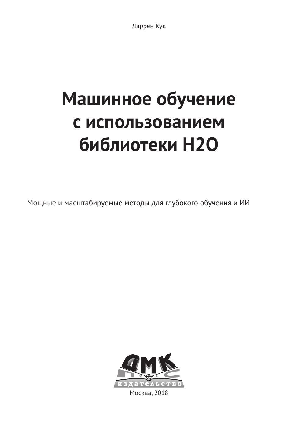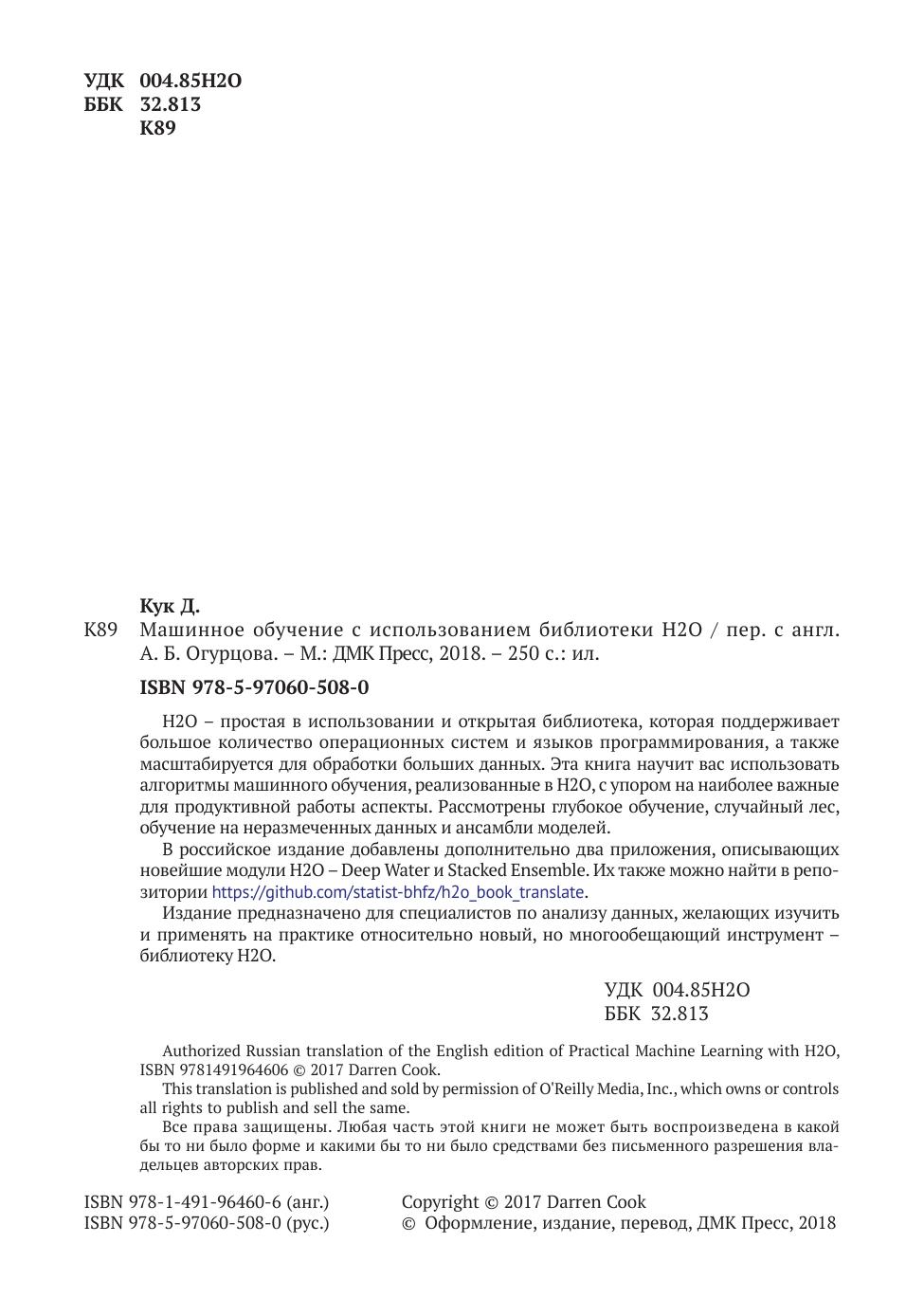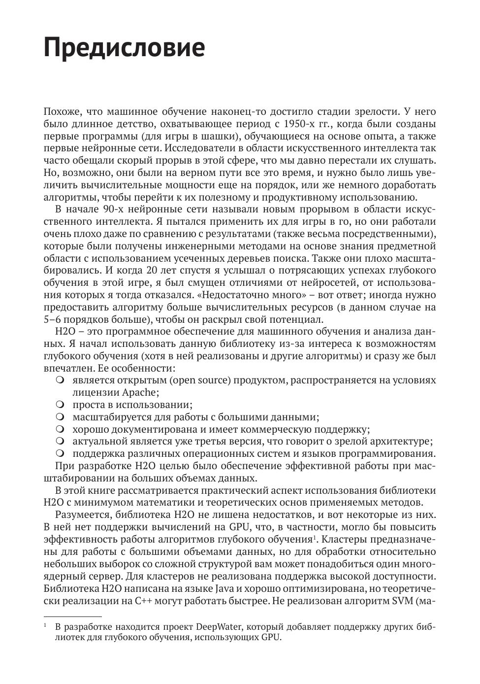 Н2О – простая в использовании и открытая библиотека, которая поддерживает большое количество операционных систем и языков программирования, а также масштабируется для обработки больших данных. Эта книга научит вас использовать алгоритмы машинного обучения, реализованные в Н2О, с упором на наиболее важные для продуктивной работы аспекты. Рассмотрены глубокое обучение, случайный лес, обучение на неразмеченных данных и ансамбли моделей. В российское издание добавлены дополнительно два приложения, описывающих новейшие модули Н2О – Deep Water и Stacked Ensemble. Их также можно найти в репозитории https://github.com/statist-bhfz/h2o_book_translate. Издание предназначено для специалистов по анализу данных, желающих изучить и применять на практике относительно новый, но многообещающий инструмент – библиотеку Н2О.