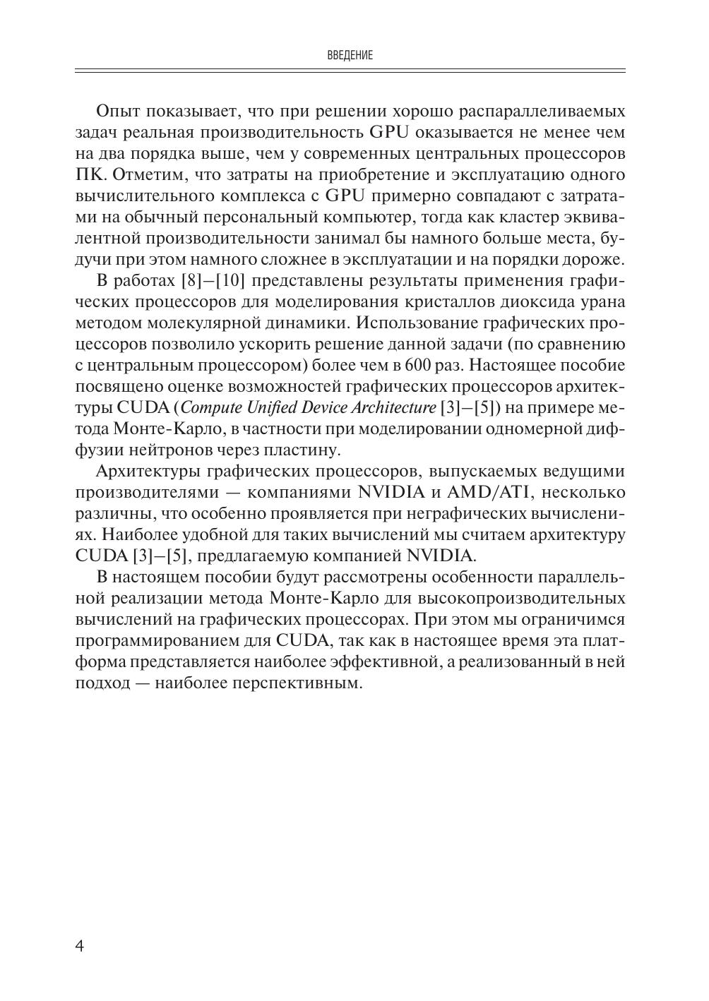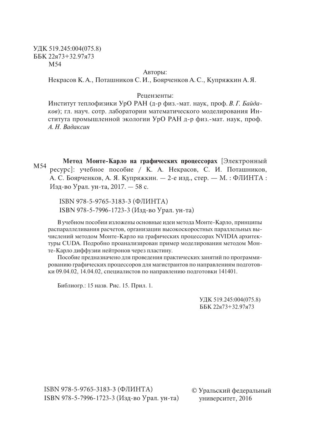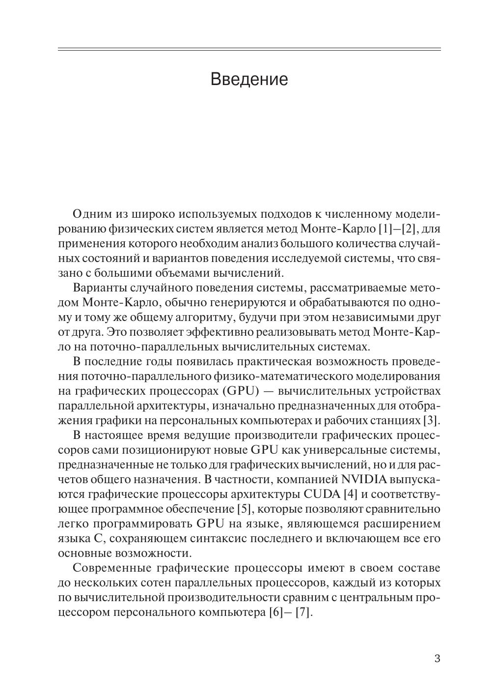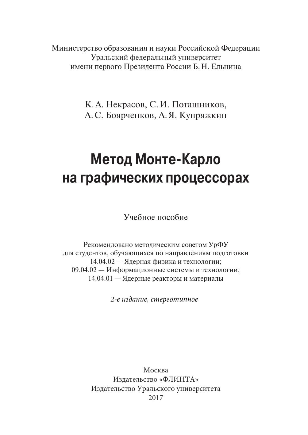 В учебном пособии изложены основные идеи метода Монте-Карло, принципы распараллеливания расчетов, организации высокоскоростных параллельных вычислений методом Монте-Карло на графических процессорах NVIDIA архитектуры CUDA. Подробно проанализирован пример моделирования методом Монте-Карло диффузии нейтронов через пластину. Пособие предназначено для проведения практических занятий по программированию графических процессоров для магистрантов по направлениям подготовки 09.04.02, 14.04.02, специалистов по направлению подготовки 141401.
