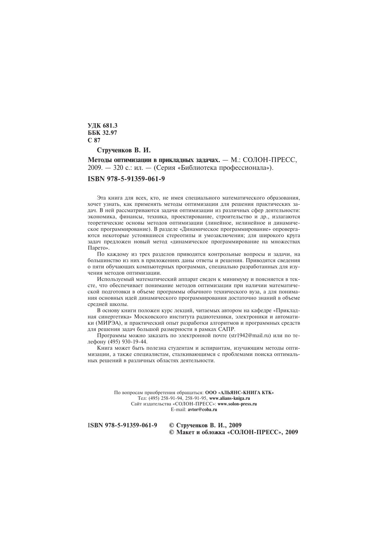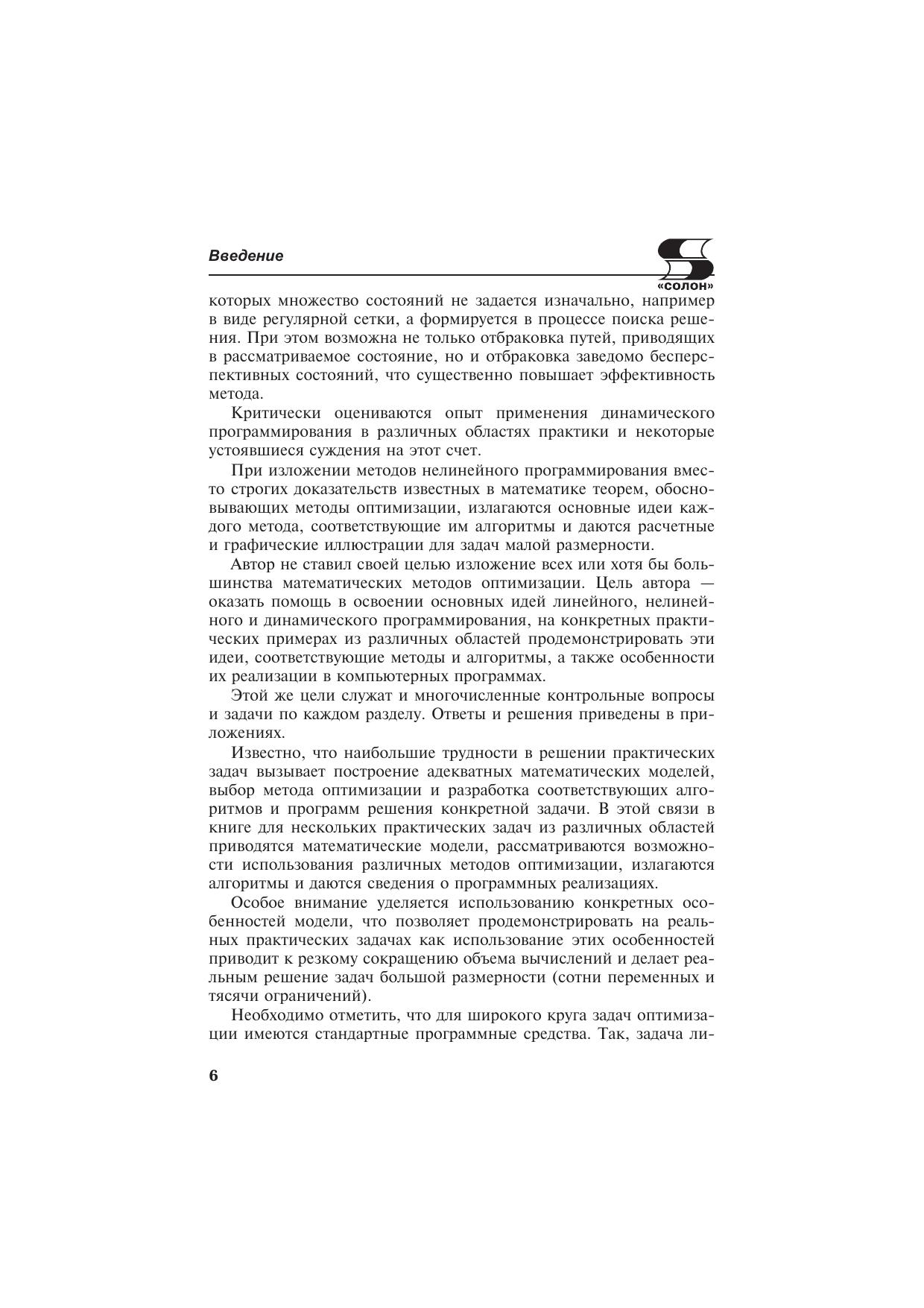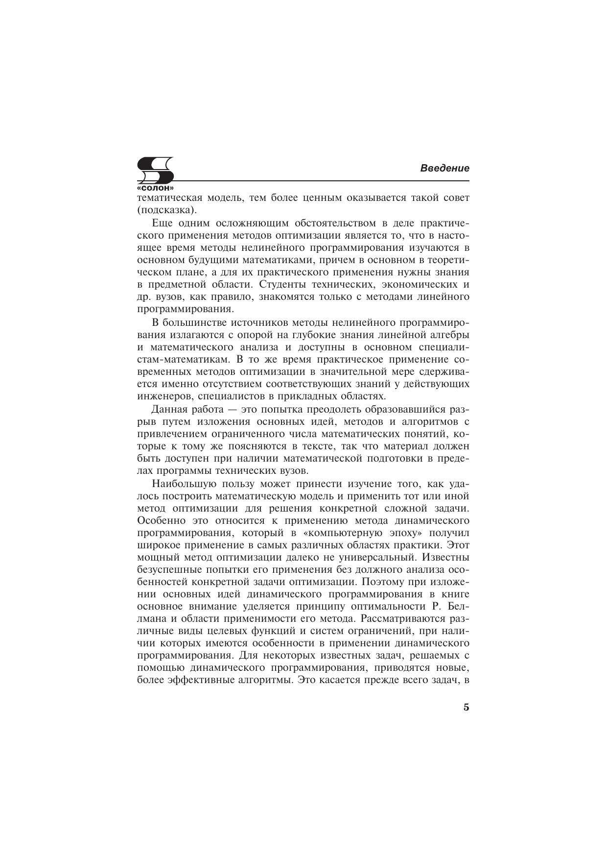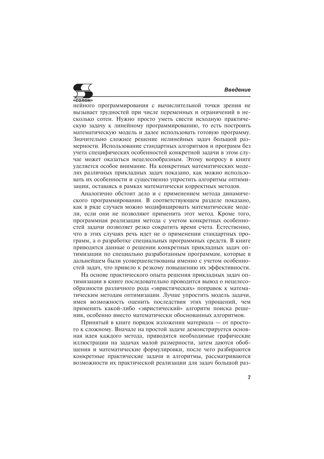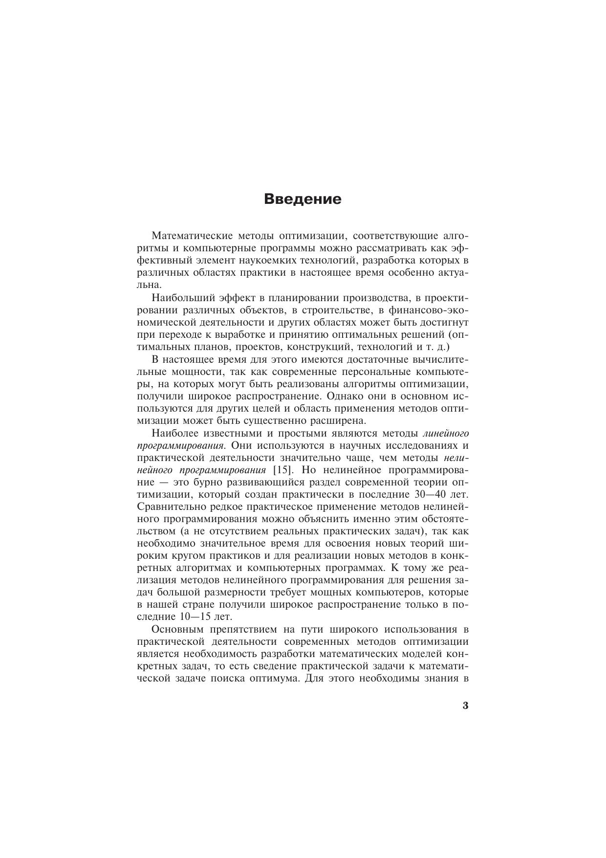 Эта книга для всех, кто, не имея специального математического образования, хочет узнать, как применять методы оптимизации для решения практических задач. В ней рассматриваются задачи оптимизации из различных сфер деятельности: экономика, финансы, техника, проектирование, строительство и др., излагаются теоретические основы методов оптимизации (линейное, нелинейное и динамическое программирование). В разделе «Динамическое программирование» опровергаются некоторые устоявшиеся стереотипы и умозаключения для широкого круга задач предложен новый метод «динамическое программирование на множествах Парето».По каждому из трех разделов приводятся контрольные вопросы и задачи, на большинство из них в приложениях даны ответы и решения. Приводятся сведения о пяти обучающих компьютерных программах, специально разработанных для изучения методов оптимизации.Используемый математический аппарат сведен к минимуму и поясняется в тексте, что обеспечивает понимание методов оптимизации при наличии математической подготовки в объеме программы обычного технического вуза, а для понимания основных идей динамического программирования достаточно знаний в объеме средней школы.В основу книги положен курс лекций, читаемых автором на кафедре «Прикладная синергетика» Московского института радиотехники, электроники и автоматики (МИРЭА), и практический опыт разработки алгоритмов и программных средств для решения задач большой размерности в рамках САПР.