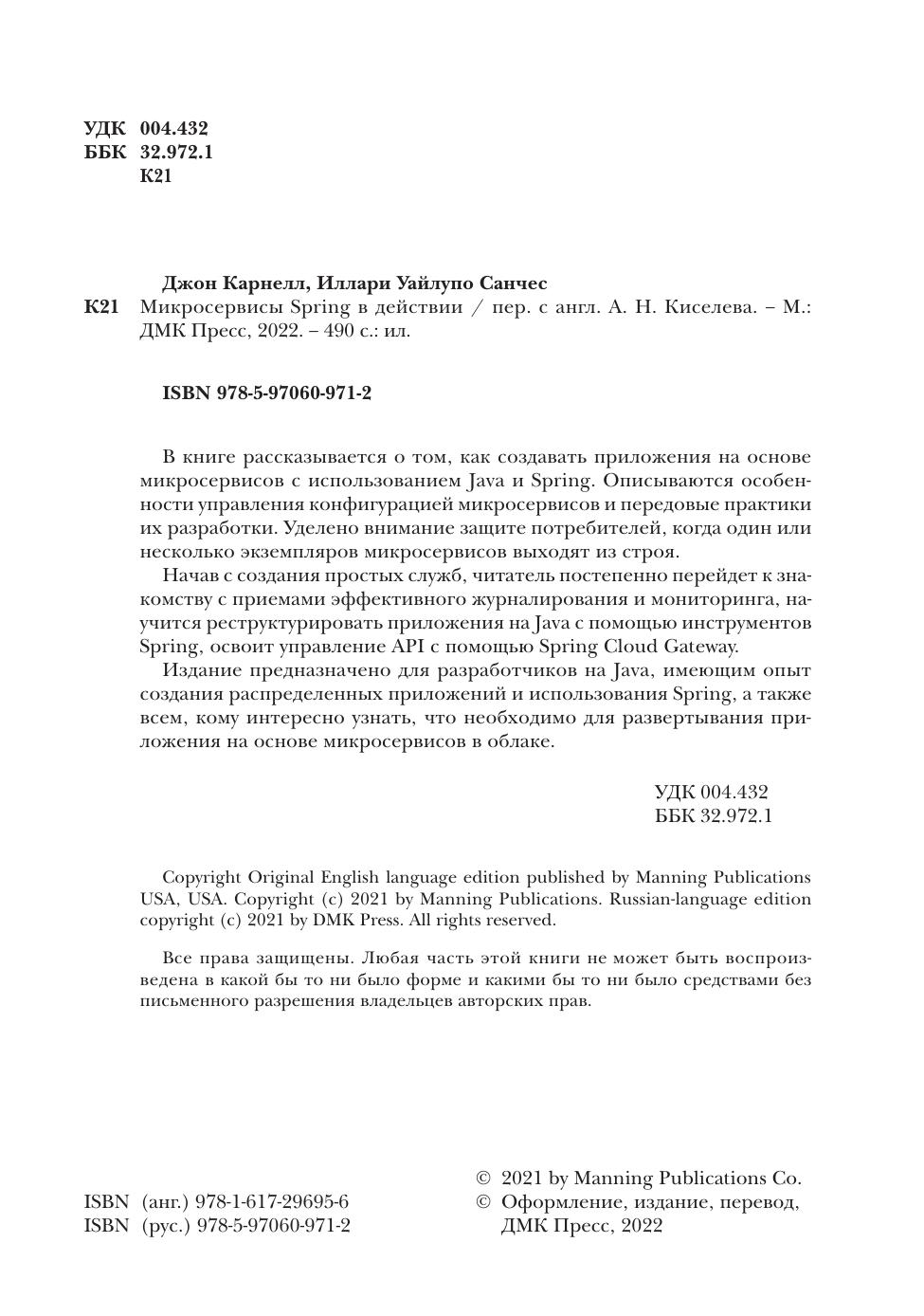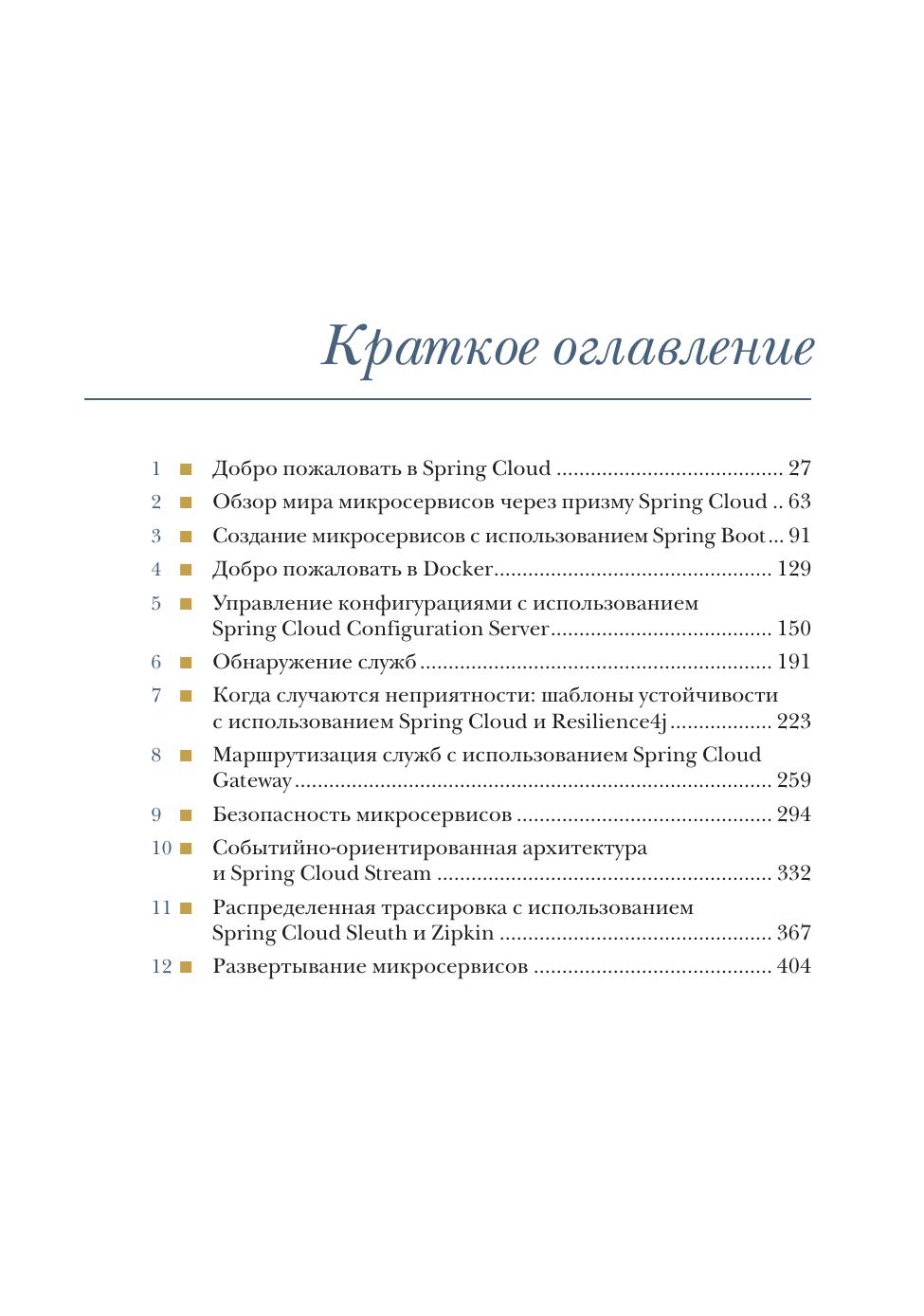 Книга учит создавать приложения на основе микросервисов с использованием Java и Spring. Начав с создания простых служб, вы постепенно перейдете к знакомству с приемами эффективного журналирования и мониторинга. Научитесь реструктурировать приложения на Java с помощью интуитивно понятных инструментов Spring и освоите управление API с помощью Spring Cloud Gateway. Также вы будете учиться развертывать приложения Spring Cloud в AWS и Kubernetes.