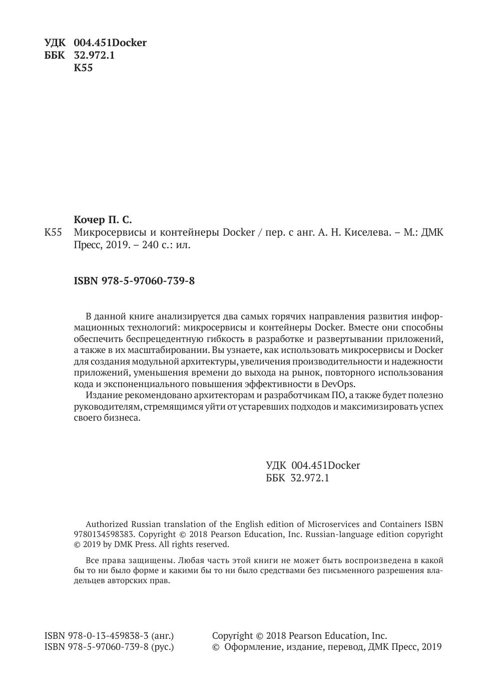 В данной книге анализируется два самых горячих направления развития информационных технологий: микросервисы и контейнеры Docker. Вместе они способны обеспечить беспрецедентную гибкость в разработке и развертывании приложений, а также в их масштабировании. Вы узнаете, как использовать микросервисы и Docker для создания модульной архитектуры, увеличения производительности и надежности приложений, уменьшения времени до выхода на рынок, повторного использования кода и экспоненциального повышения эффективности в DevOps. Издание рекомендовано архитекторам и разработчикам ПО, а также будет полезно руководителям, стремящимся уйти от устаревших подходов и максимизировать успех своего бизнеса.