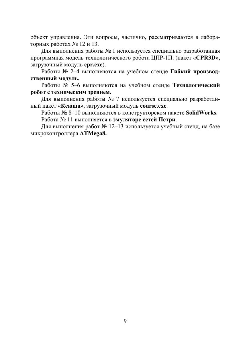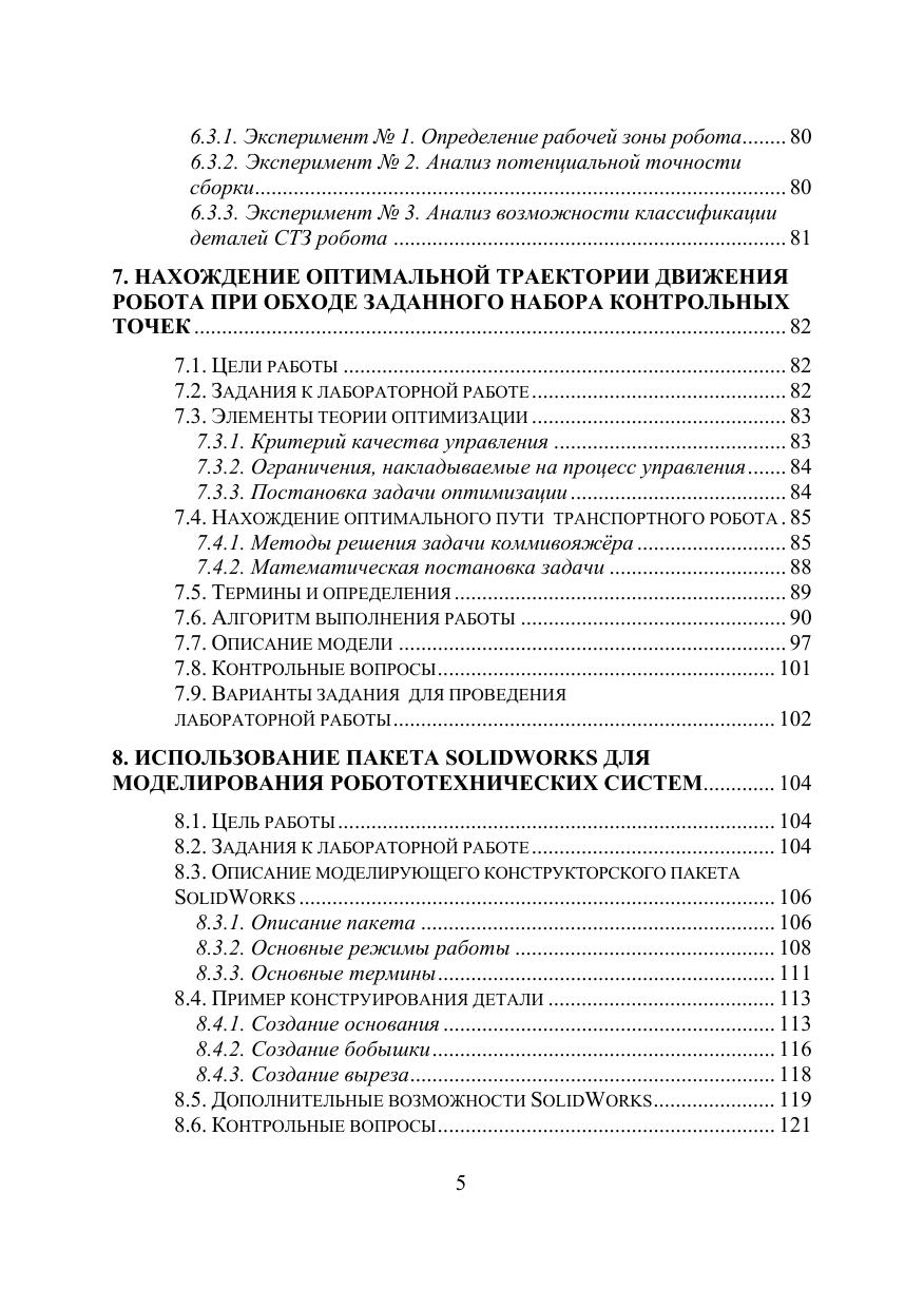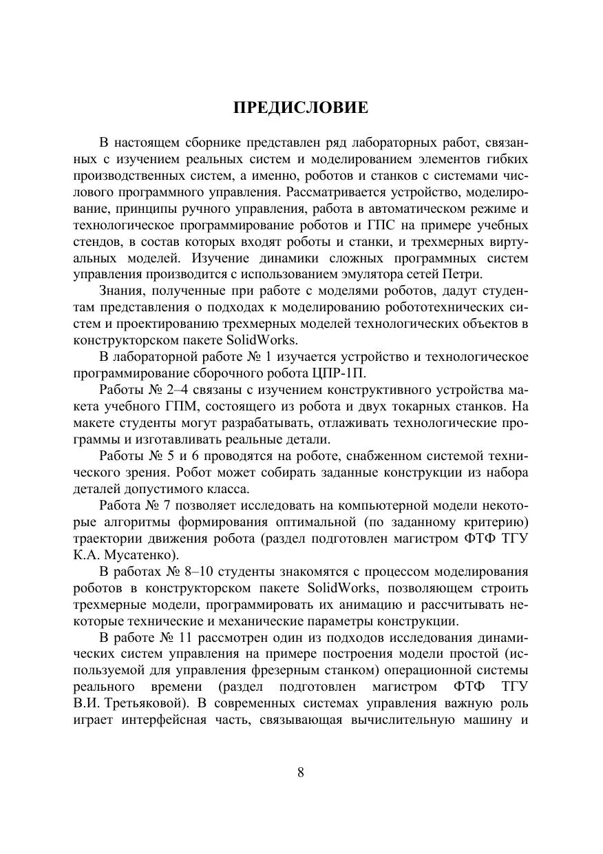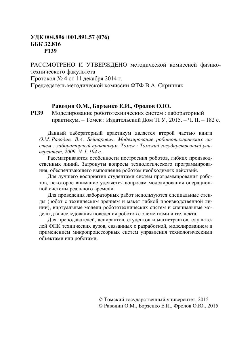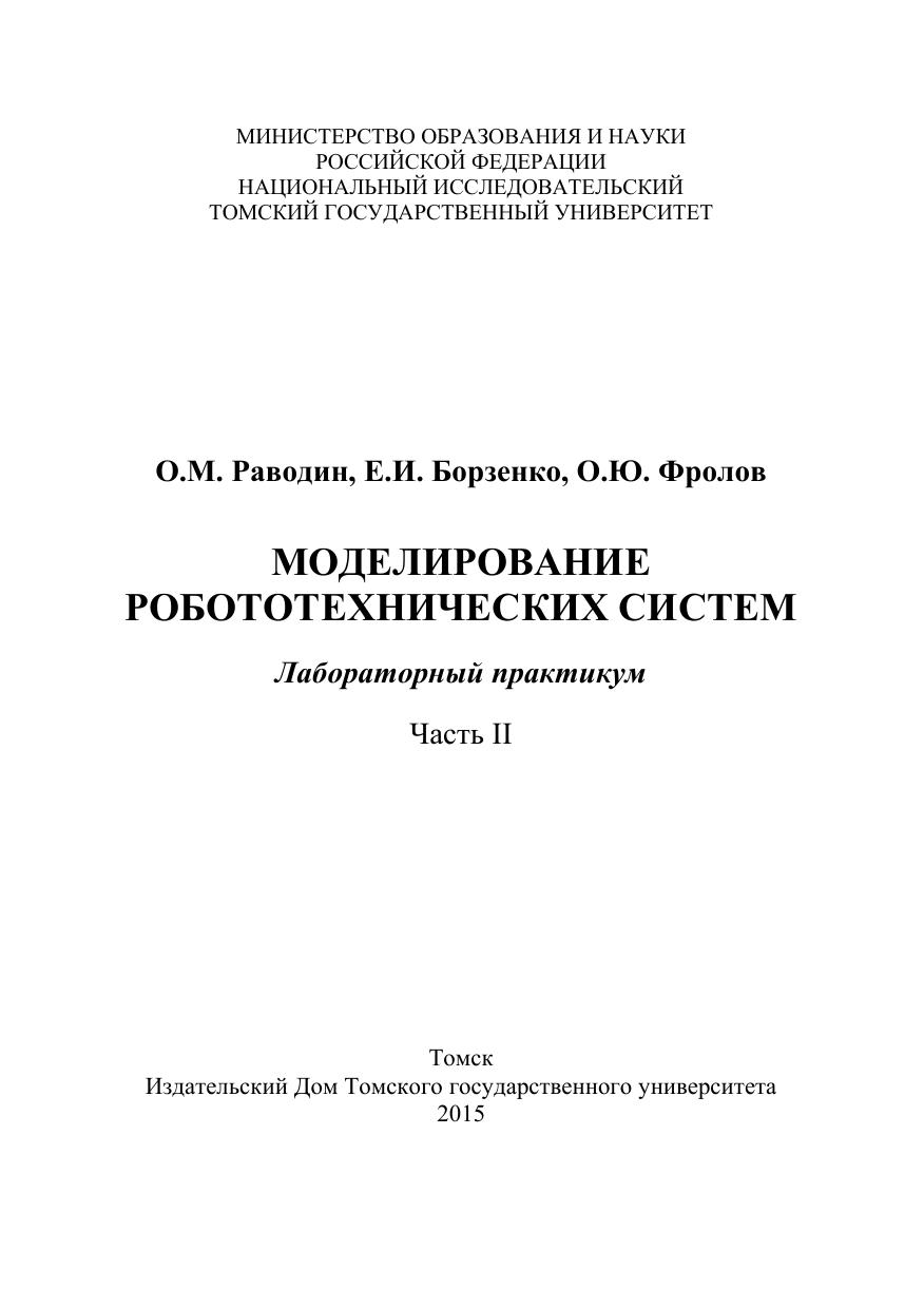 Данный лабораторный практикум является второй частью книги О.М. Раводин, В.А. Бейнарович. Моделирование робототехнических систем : лабораторный практикум. Томск: Томский государственный университет, 2009. Ч. I. 104 с. Рассматриваются особенности построения роботов, гибких производственных линий. Затронуты вопросы технологического программирования, обеспечивающего выполнение роботом необходимых действий. Для лучшего восприятия студентами систем программирования роботов, некоторое внимание уделяется вопросам моделирования операционной системы реального времени. Для проведения лабораторных работ используются специальные стенды (робот с техническим зрением и макет гибкой производственной линии), виртуальные модели робототехнических систем и специальные модели для исследования поведения роботов с элементами интеллекта. Для преподавателей, аспирантов, студентов и магистрантов, слушателей ФПК технических вузов, связанных с разработкой, моделированием и применением микропроцессорных систем управления технологическими объектами или роботами.