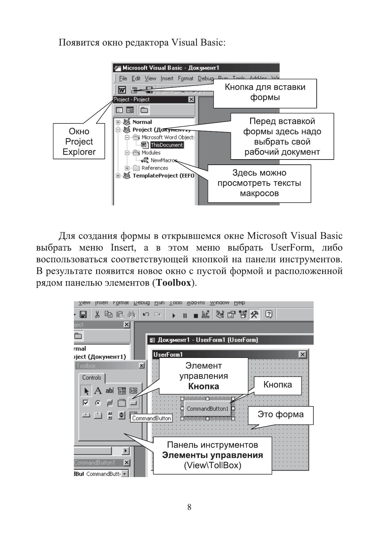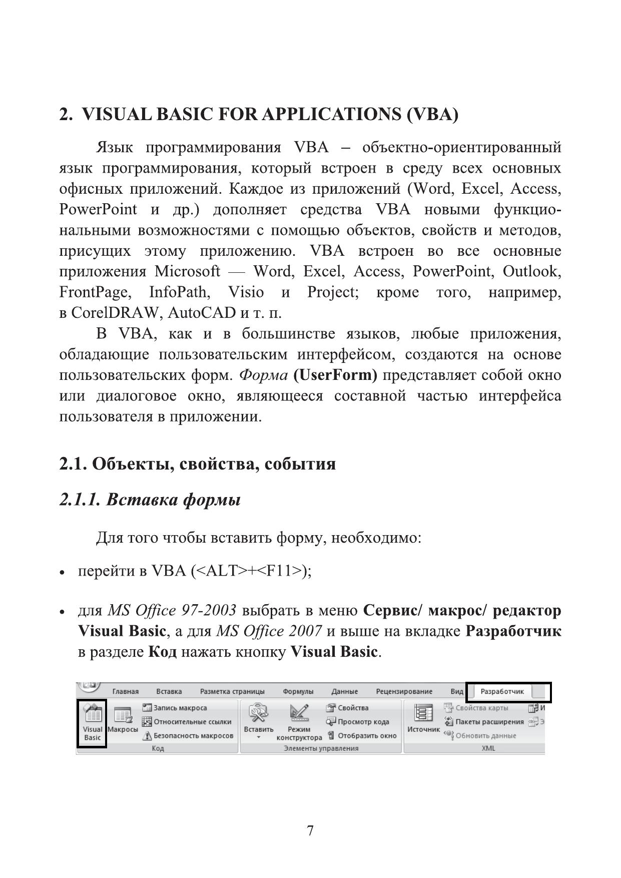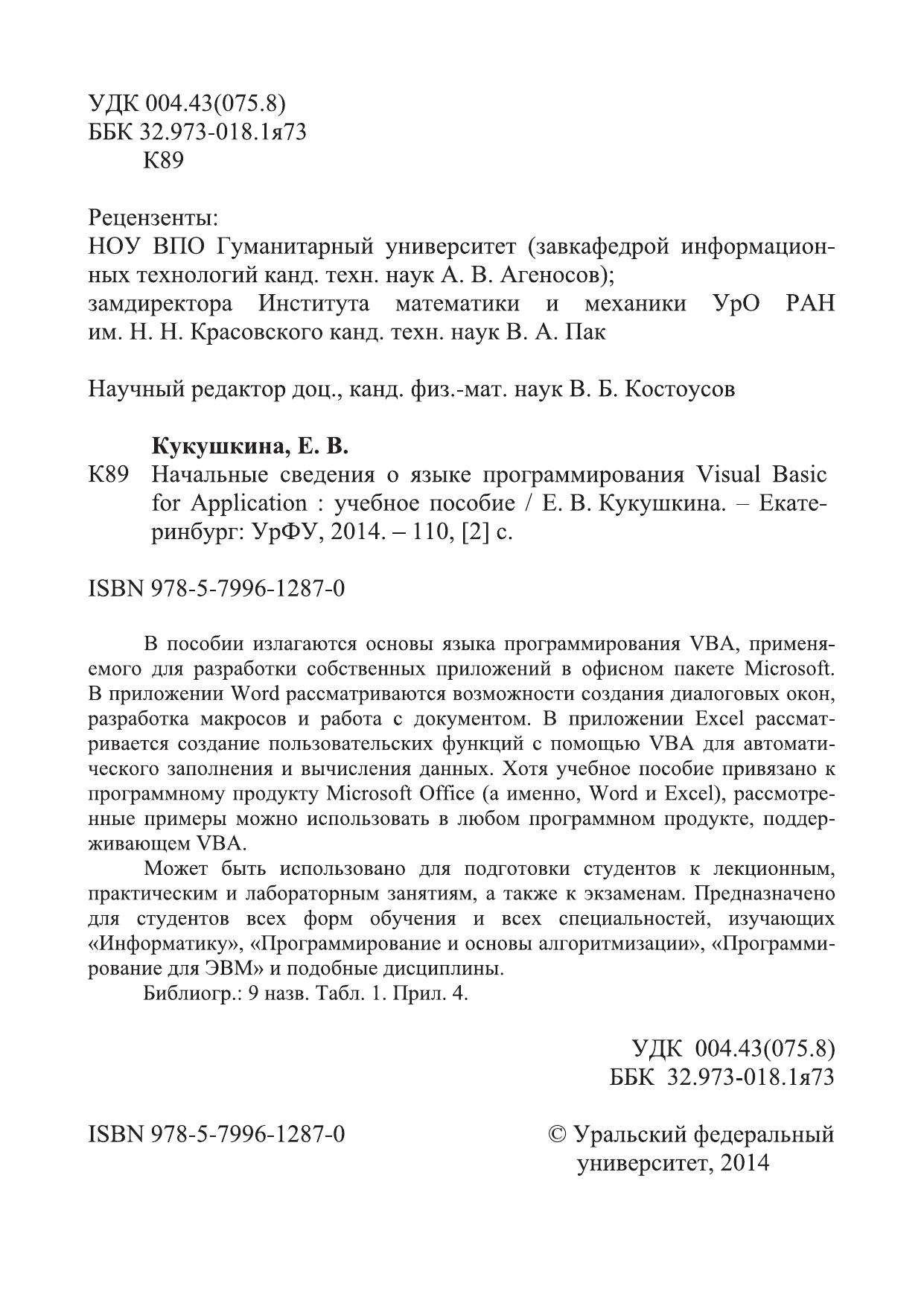 В пособии излагаются основы языка программирования VBA, применяемого для разработки собственных приложений в офисном пакете Microsoft. В приложении Word рассматриваются возможности создания диалоговых окон, разработка макросов и работа с документом. В приложении Excel рассматривается создание пользовательских функций с помощью VBA для автоматического заполнения и вычисления данных. Хотя учебное пособие привязано к программному продукту Microsoft Office (а именно, Word и Excel), рассмотренные примеры можно использовать в любом программном продукте, поддерживающем VBA. Может быть использовано для подготовки студентов к лекционным, практическим и лабораторным занятиям, а также к экзаменам. Предназначено для студентов всех форм обучения и всех специальностей, изучающих «Информатику», «Программирование и основы алгоритмизации», «Программирование для ЭВМ» и подобные дисциплины.