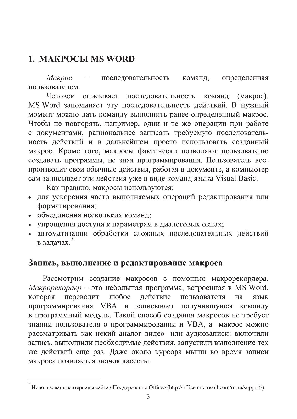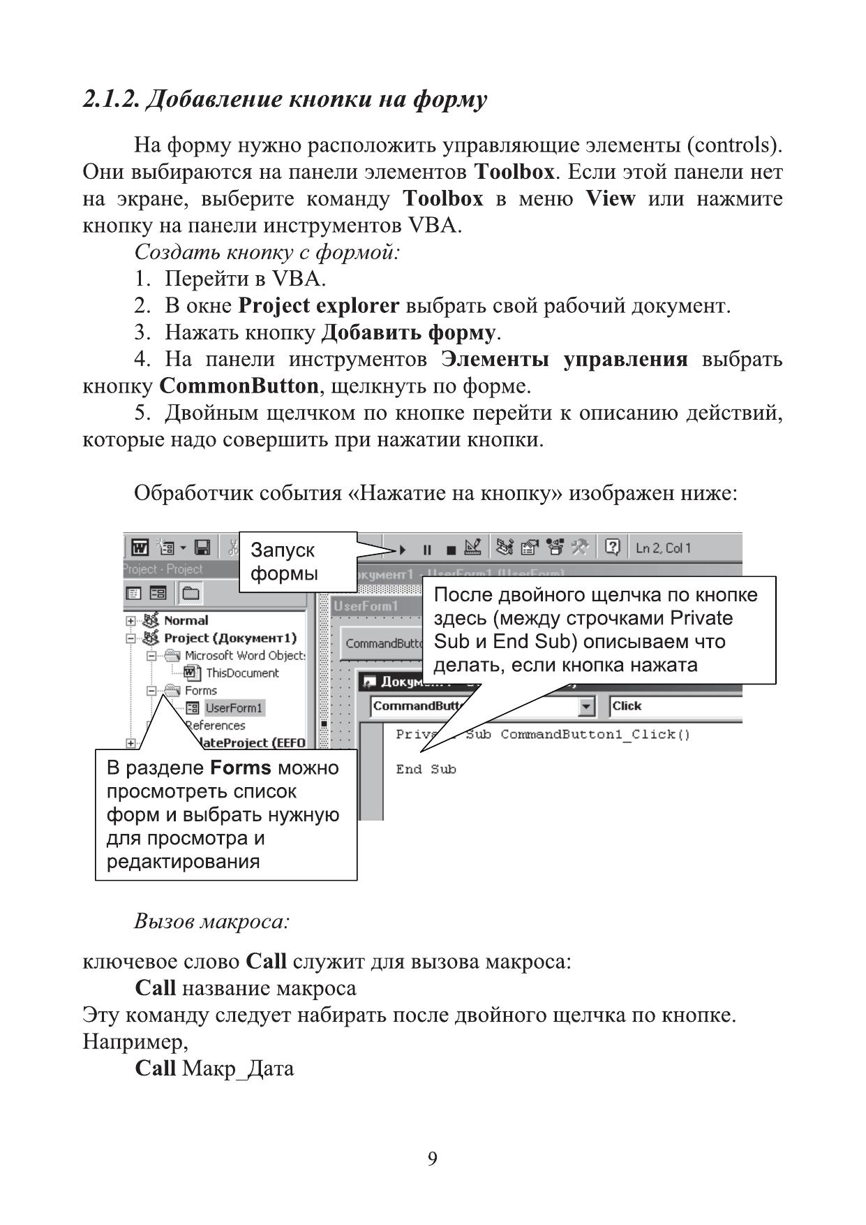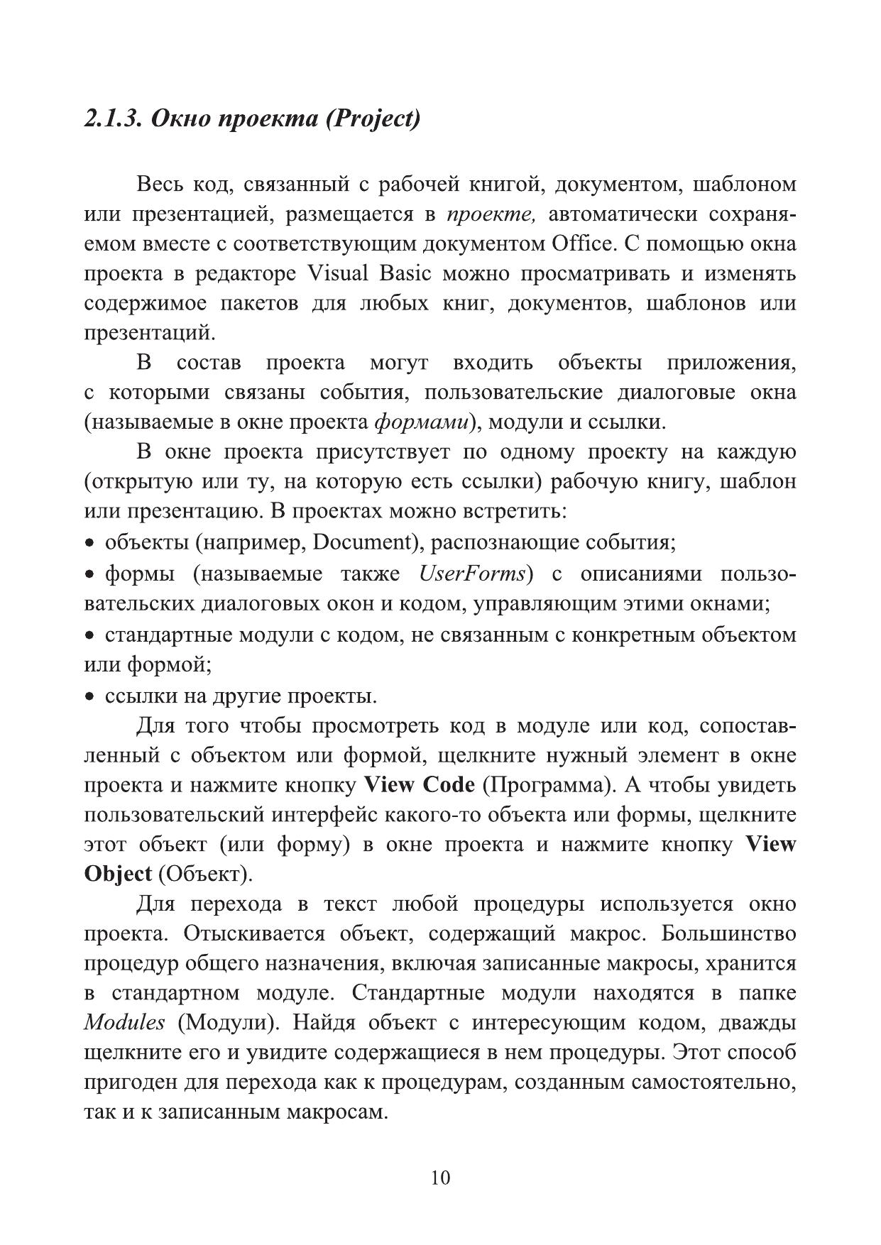В пособии излагаются основы языка программирования VBA, применяемого для разработки собственных приложений в офисном пакете Microsoft. В приложении Word рассматриваются возможности создания диалоговых окон, разработка макросов и работа с документом. В приложении Excel рассматривается создание пользовательских функций с помощью VBA для автоматического заполнения и вычисления данных. Хотя учебное пособие привязано к программному продукту Microsoft Office (а именно, Word и Excel), рассмотренные примеры можно использовать в любом программном продукте, поддерживающем VBA. Может быть использовано для подготовки студентов к лекционным, практическим и лабораторным занятиям, а также к экзаменам. Предназначено для студентов всех форм обучения и всех специальностей, изучающих «Информатику», «Программирование и основы алгоритмизации», «Программирование для ЭВМ» и подобные дисциплины.