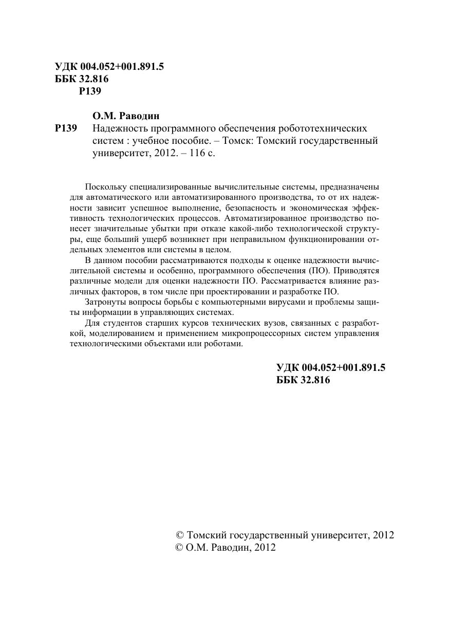 Поскольку специализированные вычислительные системы, предназначены для автоматического или автоматизированного производства, то от их надежности зависит успешное выполнение, безопасность и экономическая эффективность технологических процессов. Автоматизированное производство понесет значительные убытки при отказе какой-либо технологической структуры, еще больший ущерб возникнет при неправильном функционировании отдельных элементов или системы в целом. В данном пособии рассматриваются подходы к оценке надежности вычислительной системы и особенно, программного обеспечения (ПО). Приводятся различные модели для оценки надежности ПО. Рассматривается влияние раз- личных факторов, в том числе при проектировании и разработке ПО. Затронуты вопросы борьбы с компьютерными вирусами и проблемы защиты информации в управляющих системах. Для студентов старших курсов технических вузов, связанных с разработкой, моделированием и применением микропроцессорных систем управления технологическими объектами или роботами