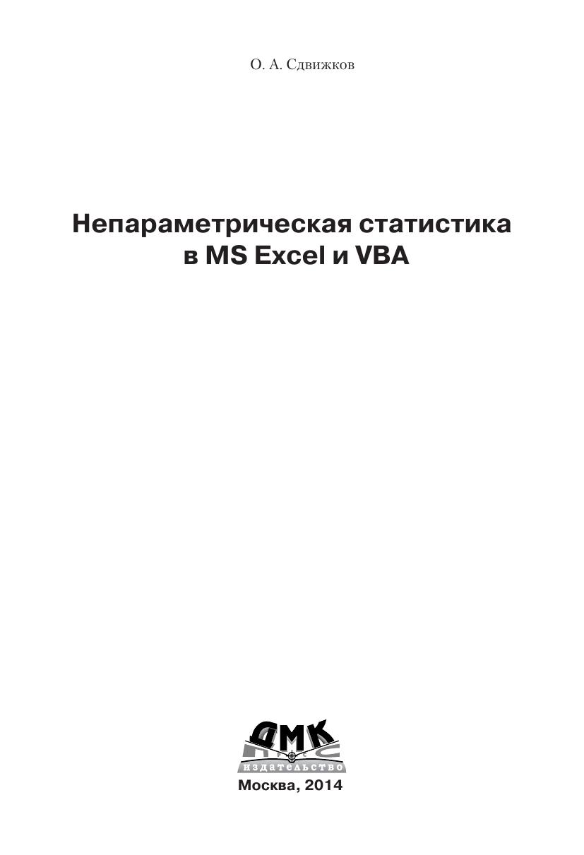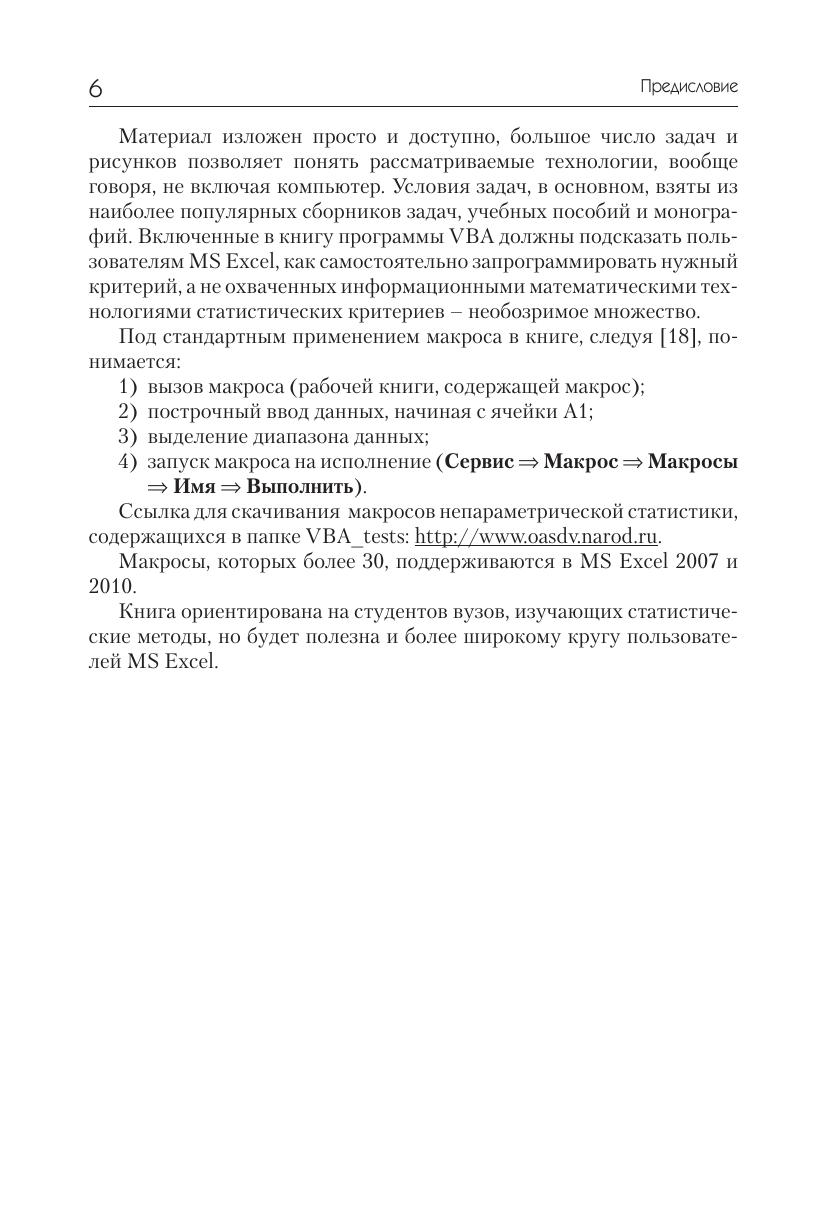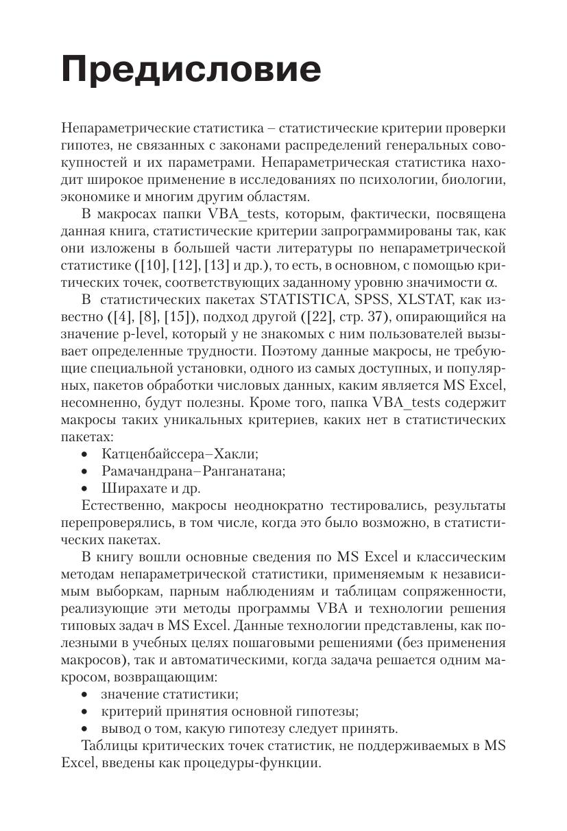 В книгу вошли основные сведения по MS Excel и классическим методам непараметрической статистики, применяемым к независимым выборкам, парным наблюдениям и таблицам сопряженности, реализующие эти методы программы VBA и технологии решения типовых задач в MS Excel. Данные технологии представлены, как пошаговыми решениями (без применения макросов), так и автоматическими, когда задача решается одним макросом, возвращающим значение статистики, критерий принятия основной гипотезы и вывод о том, какую гипо тезу следует принять. Книга ориентирована на студентов вузов, изучающих статистические методы, но будет полезна и более широкому кругу пользователей MS Excel.