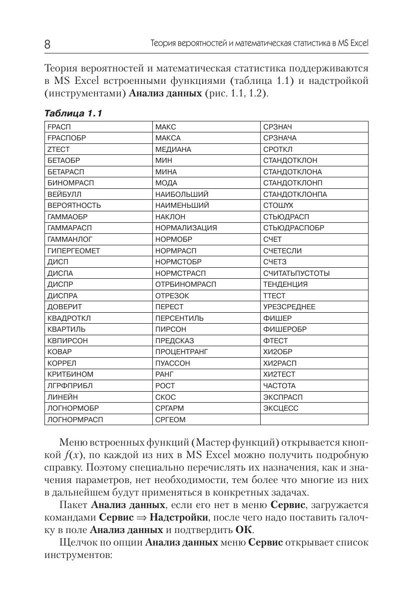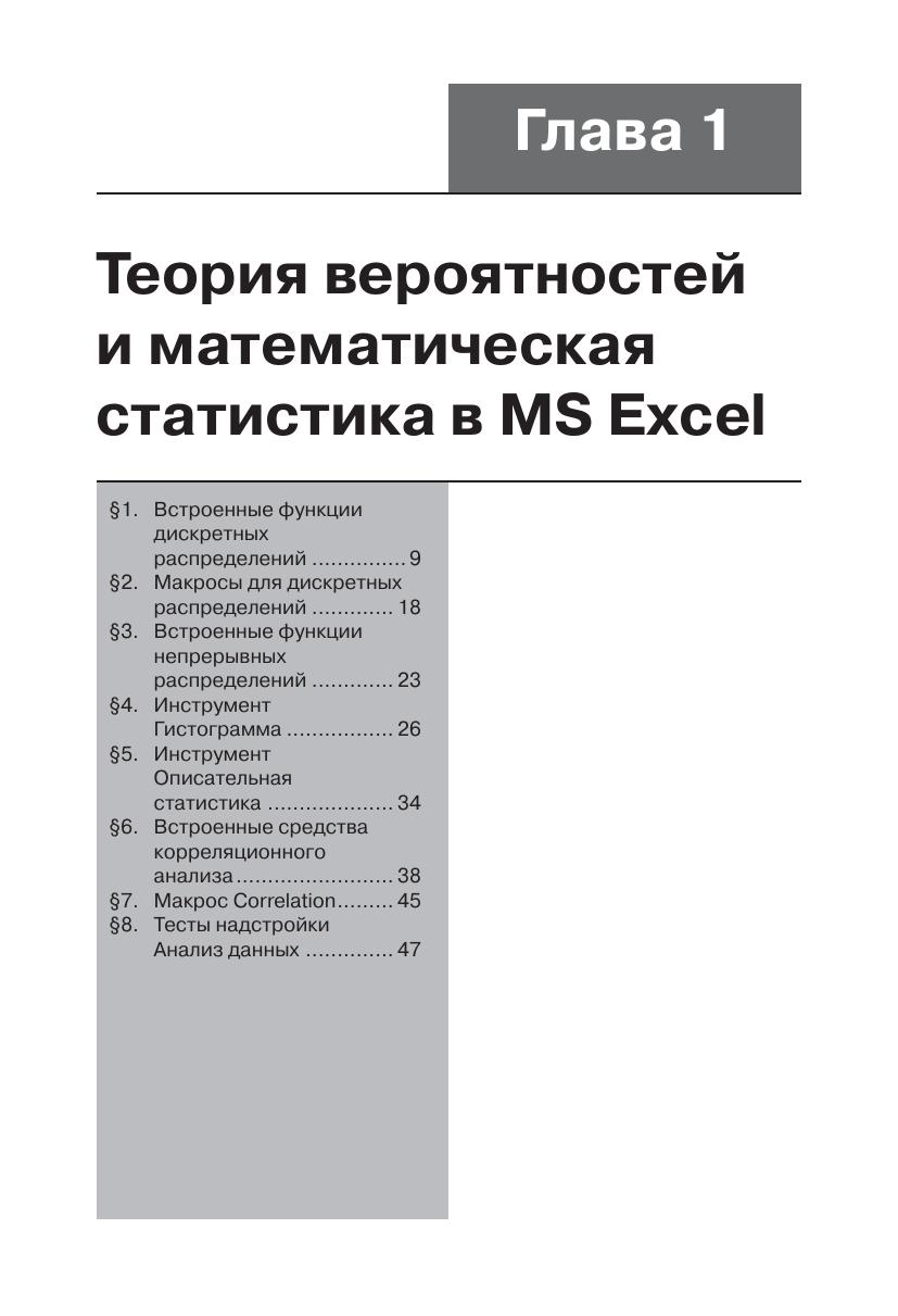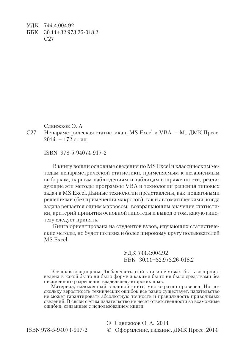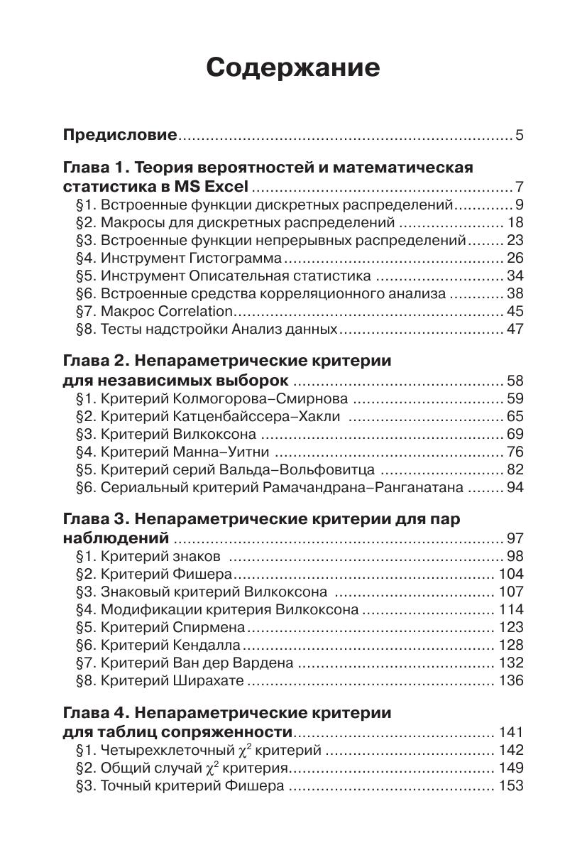 В книгу вошли основные сведения по MS Excel и классическим методам непараметрической статистики, применяемым к независимым выборкам, парным наблюдениям и таблицам сопряженности, реализующие эти методы программы VBA и технологии решения типовых задач в MS Excel. Данные технологии представлены, как пошаговыми решениями (без применения макросов), так и автоматическими, когда задача решается одним макросом, возвращающим значение статистики, критерий принятия основной гипотезы и вывод о том, какую гипо тезу следует принять. Книга ориентирована на студентов вузов, изучающих статистические методы, но будет полезна и более широкому кругу пользователей MS Excel.