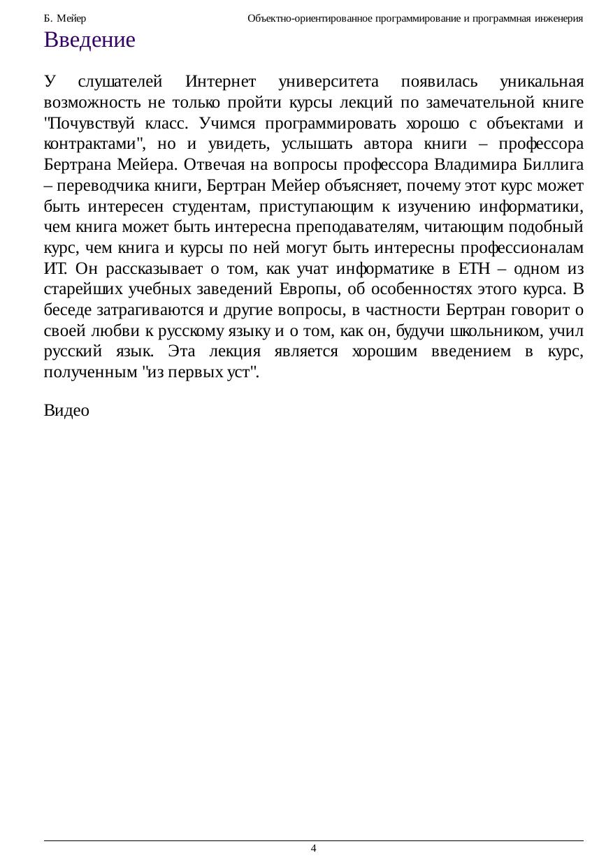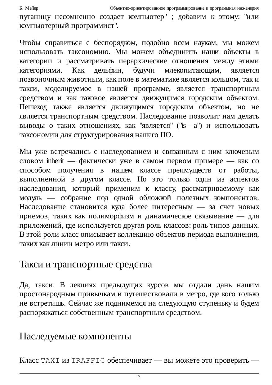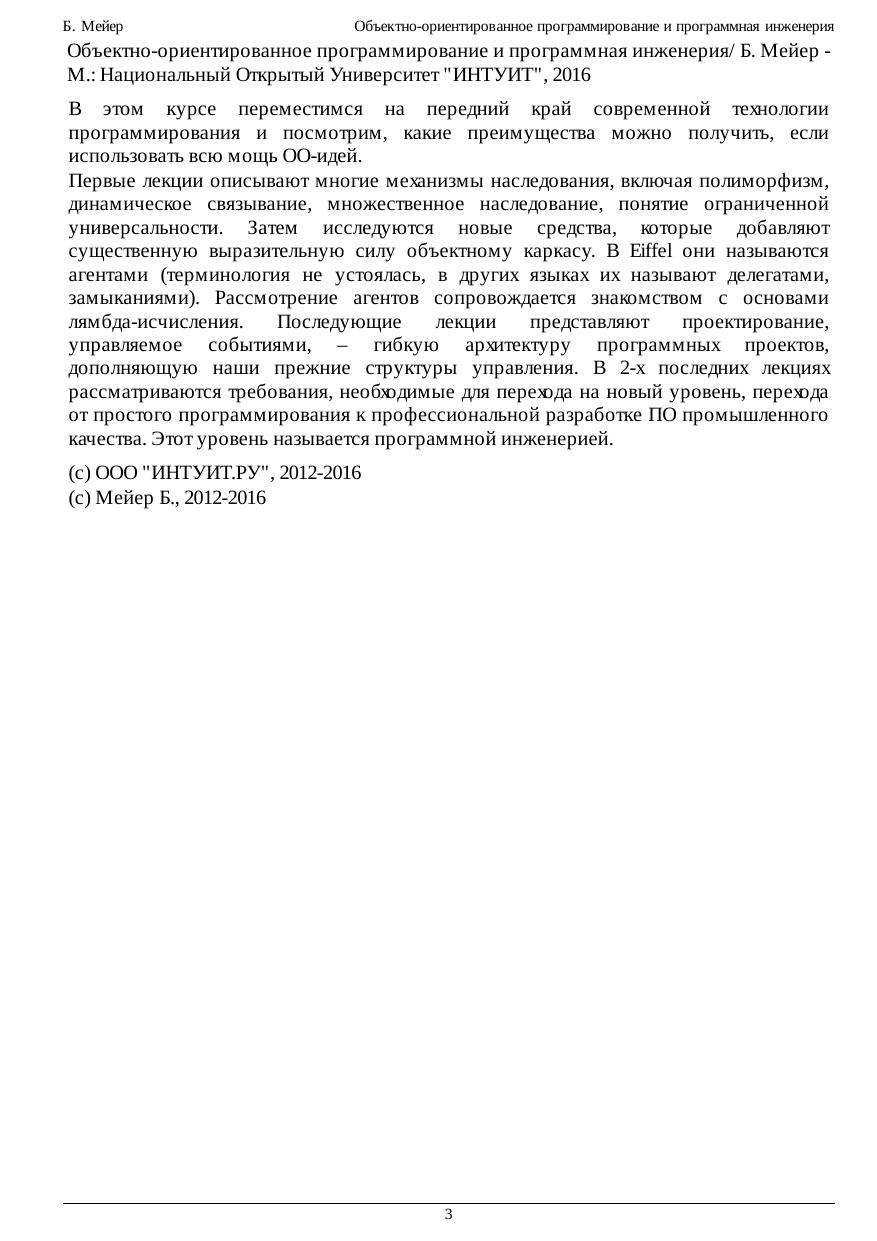 В этом курсе переместимся на передний край современной технологии программирования и посмотрим, какие преимущества можно получить, если использовать всю мощь ОО-идей. Первые лекции описывают многие механизмы наследования, включая полиморфизм, динамическое связывание, множественное наследование, понятие ограниченной универсальности. Затем исследуются новые средства, которые добавляют существенную выразительную силу объектному каркасу. В Eiffel они называются агентами (терминология не устоялась, в других языках их называют делегатами, замыканиями). Рассмотрение агентов сопровождается знакомством с основами лямбда-исчисления. Последующие лекции представляют проектирование,