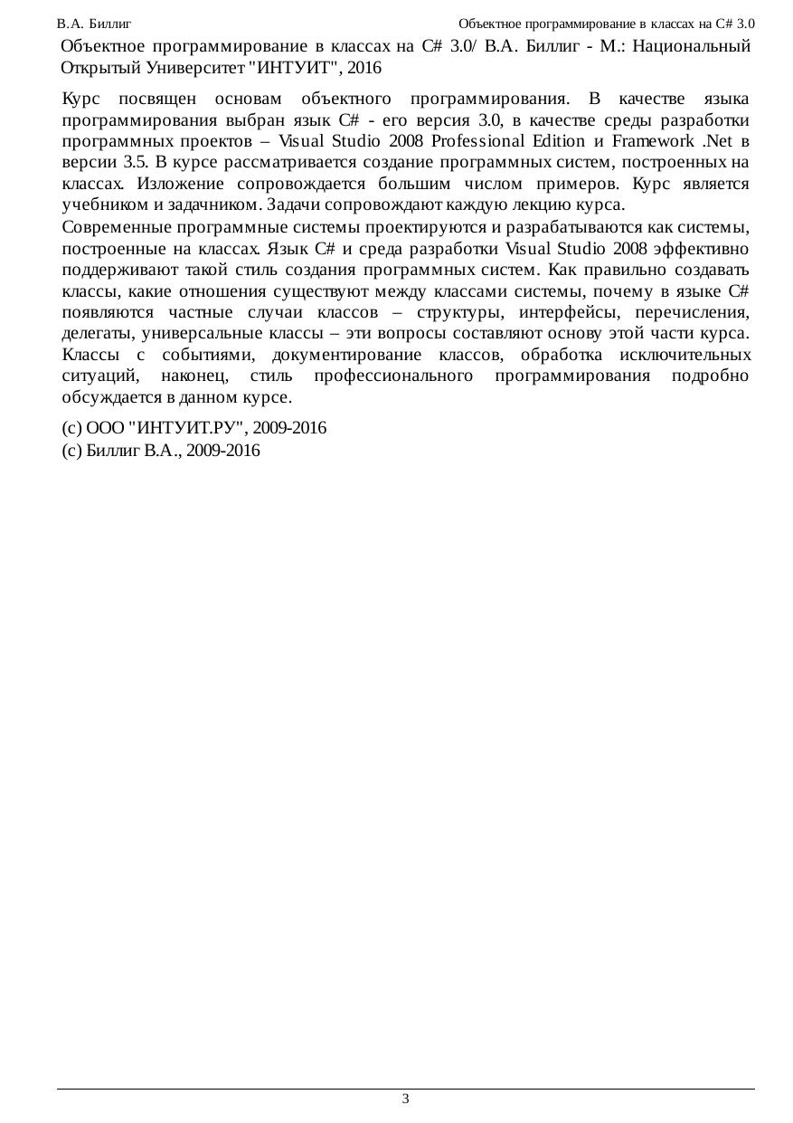 Курс посвящен основам объектного программирования. В качестве языка программирования выбран язык C# - его версия 3.0, в качестве среды разработки программных проектов – Visual Studio 2008 Professional Edition и Framework .Net в версии 3.5. В курсе рассматривается создание программных систем, построенных на классах. Изложение сопровождается большим числом примеров. Курс является учебником и задачником. Задачи сопровождают каждую лекцию курса. Современные программные системы проектируются и разрабатываются как системы, построенные на классах. Язык С# и среда разработки Visual Studio 2008 эффективно поддерживают такой стиль создания программных систем. Как правильно создавать классы, какие отношения существуют между классами системы, почему в языке С# появляются частные случаи классов – структуры, интерфейсы, перечисления, делегаты, универсальные классы – эти вопросы составляют основу этой части курса. Классы с событиями, документирование классов, обработка исключительных ситуаций, наконец, стиль профессионального программирования подробно обсуждается в данном курсе.