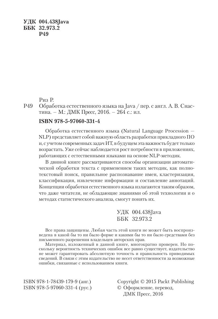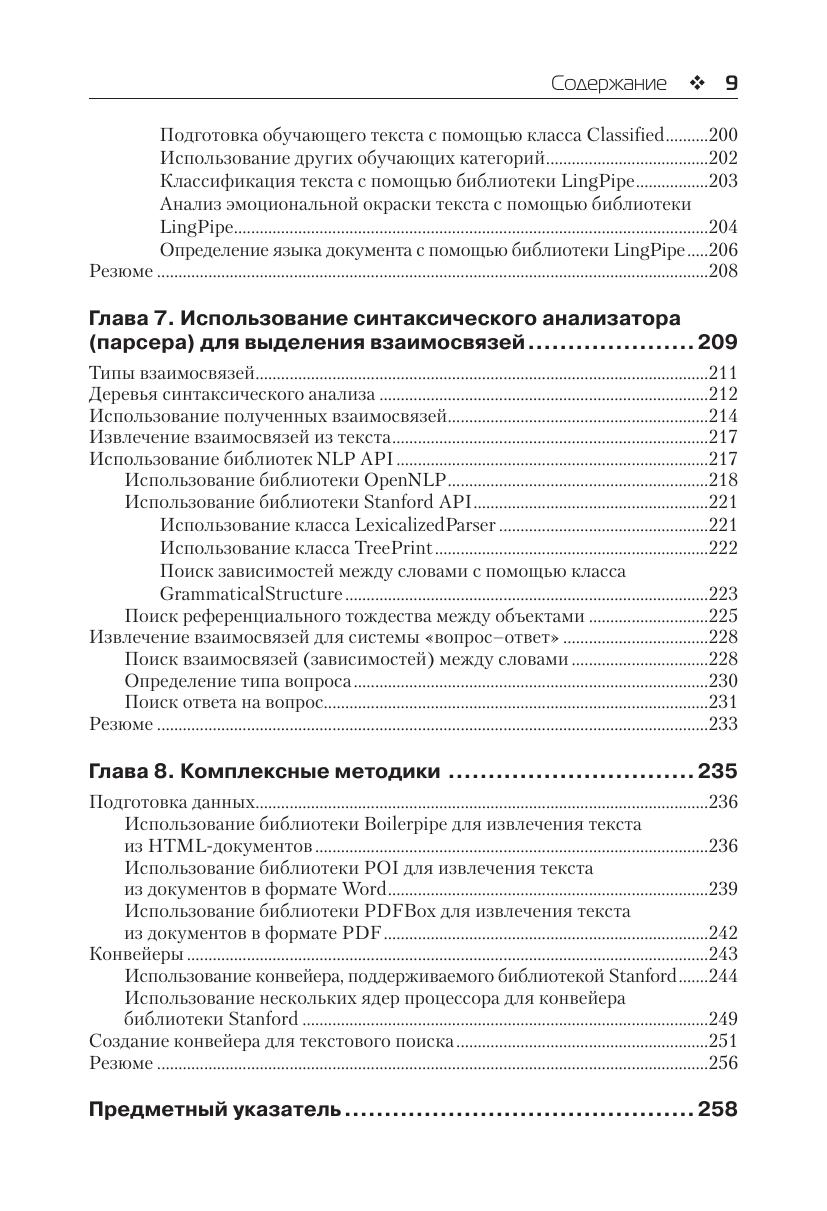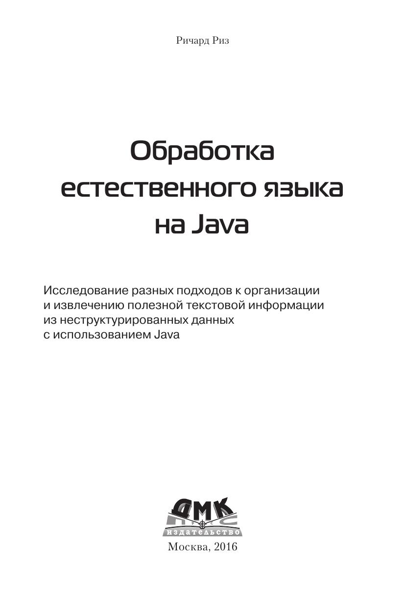 Обработка естественного языка (Natural Language Procession — NLP) представляет собой важную область разработки прикладного ПО и, с учетом современных задач ИТ, в будущем эта важность будет только возрастать. Уже сейчас наблюдается рост потребности в приложениях, работающих с естественными языками на основе NLPметодик. В двнной книге рассматриваются способы организации автомати ческой обработки текста с применением таких методик, как полнотекстовый поиск, правильное распознавание имен, кластеризация, классификация, извлечение информации и составление аннотаций. Концепции обработки естественного языка излагаются таким образом, что даже читатели, не обладающие знаниями об этой технологии и о методах статистического анализа, смогут понять их.