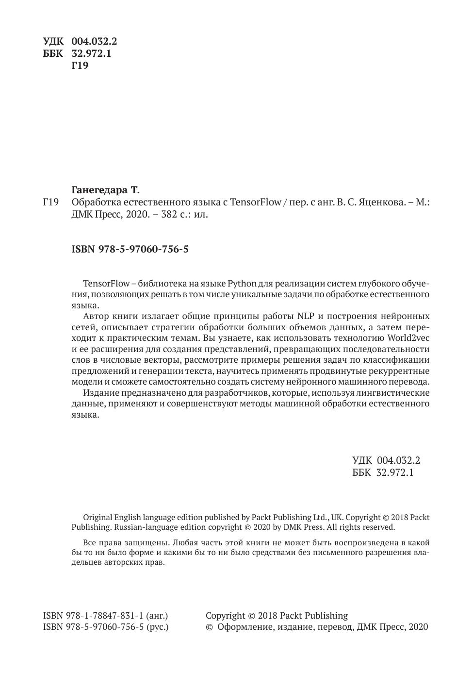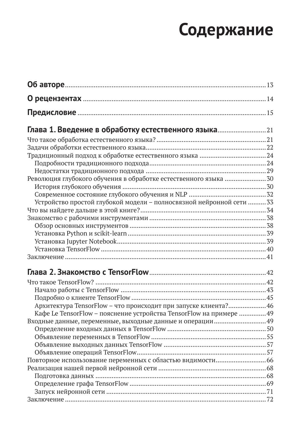 Обработка естественного языка применяется в различных приложениях машинного обучения, а TensorFlow является важнейшей библиотекой для реализации систем глубокого обучения на практике. Эта книга знакомит читателя с методами обработки естественного языка и содержит практическое руководство по работе с TensorFlow, предоставляя мощный инструмент для работы с огромными объемами неструктурированных данных и решения уникальных задач по обработке естественного языка.