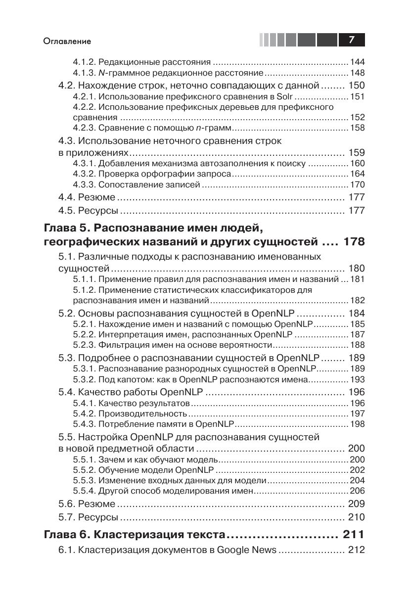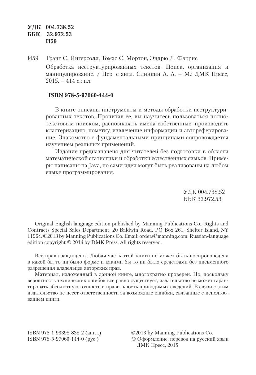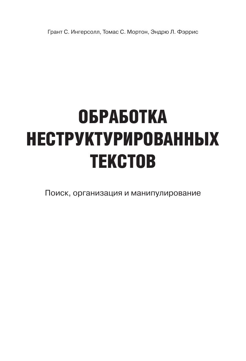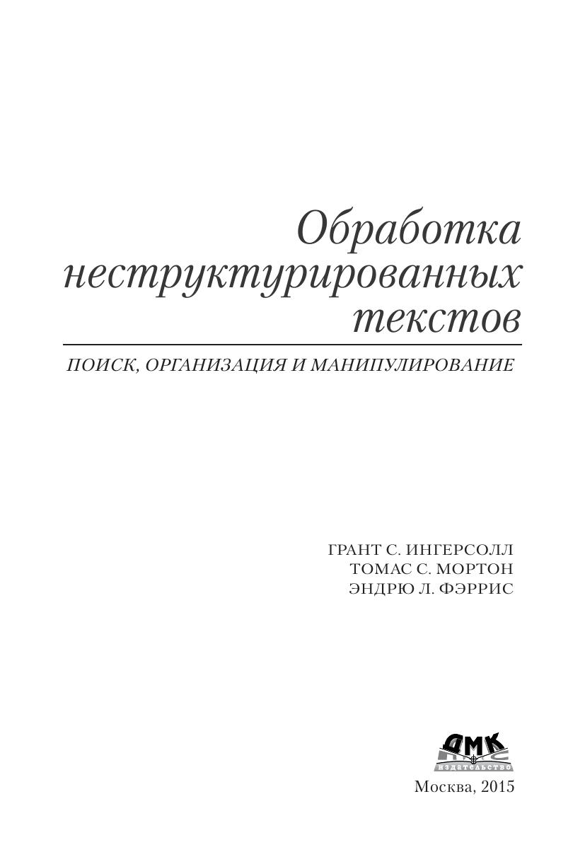 В книге описаны инструменты и методы обработки неструктурированных текстов. Прочитав ее, вы научитесь пользоваться полнотекстовым поиском, распознавать имена собственные, производить кластеризацию, пометку, извлечение информации и автореферирование. Знакомство с фундаментальными принципами сопровождается изучением реальных применений. Издание предназначено для читателей без подготовки в области математической статистики и обработки естественных языков. Примеры написаны на Java, но сами идеи могут быть реализованы на любом языке программирования
