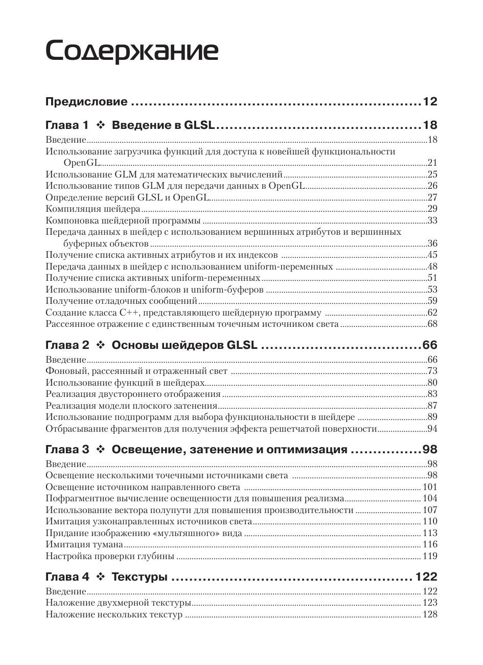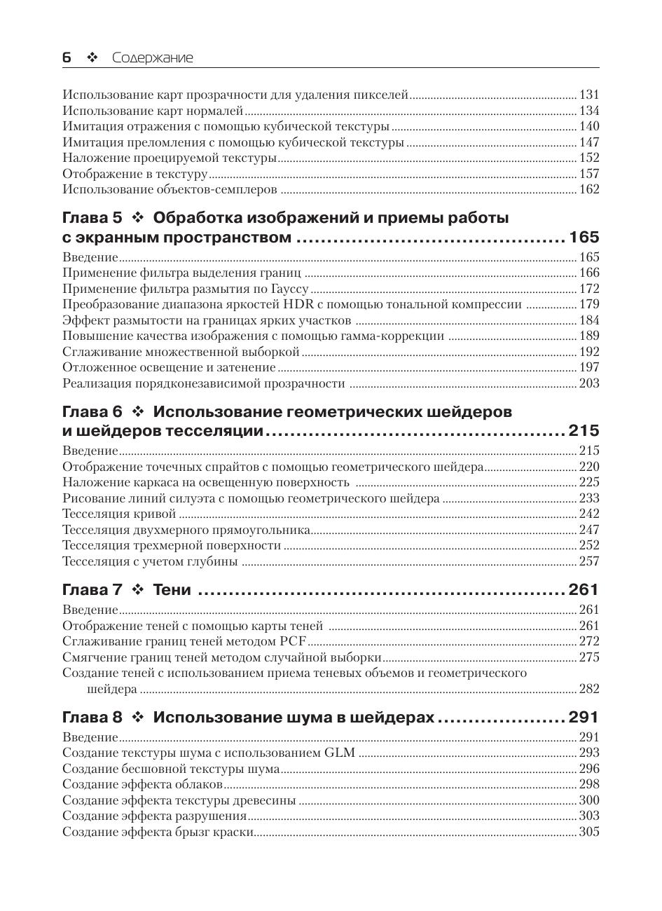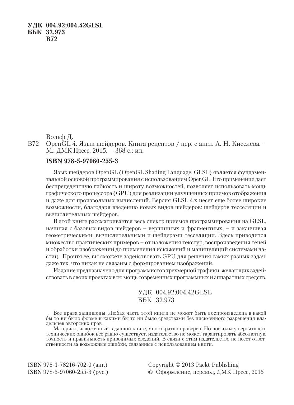 Язык шейдеров OpenGL (OpenGL Shading Language, GLSL) является фундаментальной основой программирования с использованием OpenGL. Его применение дает беспрецедентную гибкость и широту возможностей, позволяет использовать мощь графического процессора (GPU) для реализации улучшенных приемов отображения и даже для произвольных вычислений. Версия GLSL 4.x несет еще более широкие возможности, благодаря введению новых видов шейдеров: шейдеров тесселяции и вычислительных шейдеров. В этой книге рассматривается весь спектр приемов программирования на GLSL, начиная с базовых видов шейдеров – вершинных и фрагментных, – и заканчивая геометрическими, вычислительными и шейдерами тесселяции. Здесь приводится множество практических примеров – от наложения текстур, воспроизведения теней и обработки изображений до применения искажений и манипуляций системами частиц. Прочтя ее, вы сможете задействовать GPU для решения самых разных задач, даже тех, что никак не связаны с формированием изображений. Издание предназначено для программистов трехмерной графики, желающих задействовать в своих проектах всю мощь современных программных и аппаратных средств