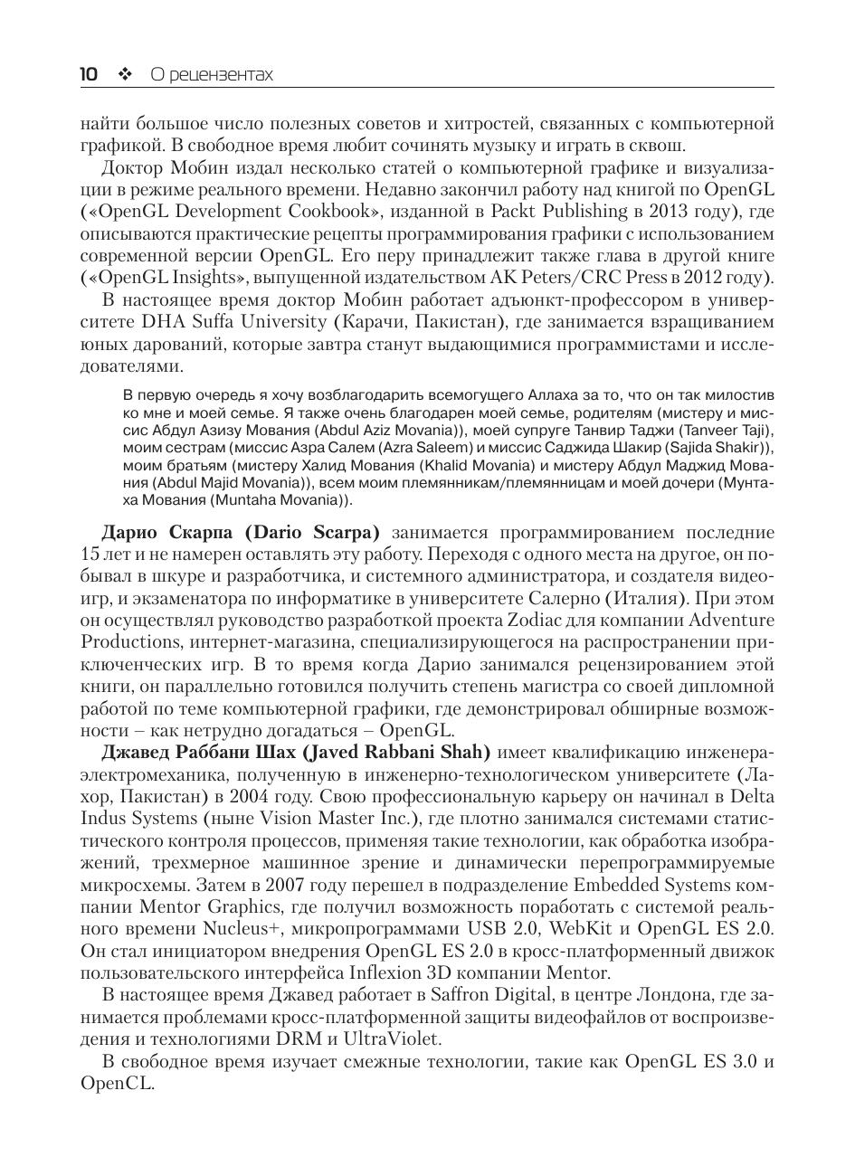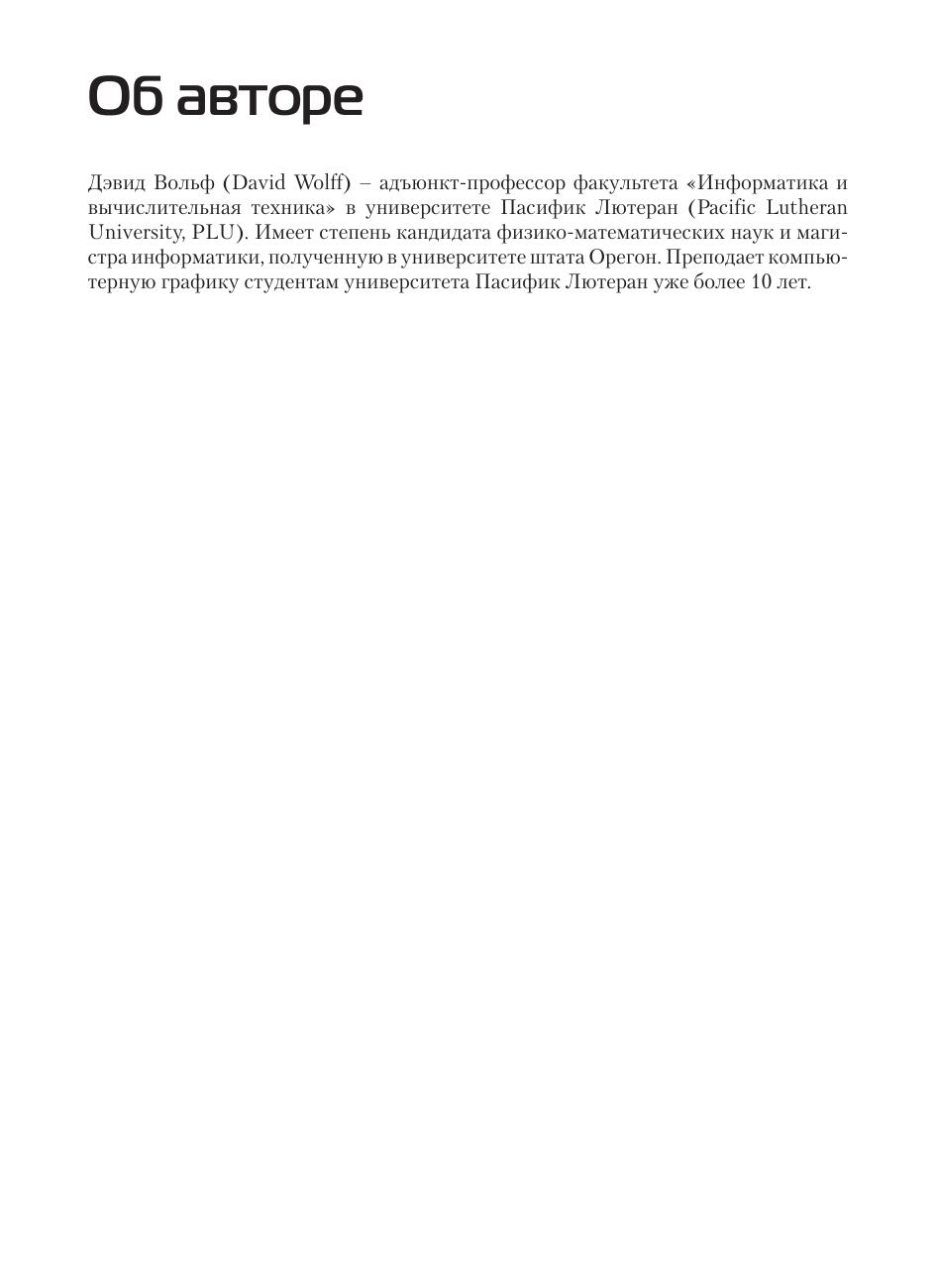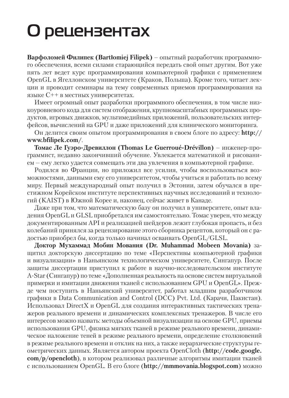 Язык шейдеров OpenGL (OpenGL Shading Language, GLSL) является фундаментальной основой программирования с использованием OpenGL. Его применение дает беспрецедентную гибкость и широту возможностей, позволяет использовать мощь графического процессора (GPU) для реализации улучшенных приемов отображения и даже для произвольных вычислений. Версия GLSL 4.x несет еще более широкие возможности, благодаря введению новых видов шейдеров: шейдеров тесселяции и вычислительных шейдеров. В этой книге рассматривается весь спектр приемов программирования на GLSL, начиная с базовых видов шейдеров – вершинных и фрагментных, – и заканчивая геометрическими, вычислительными и шейдерами тесселяции. Здесь приводится множество практических примеров – от наложения текстур, воспроизведения теней и обработки изображений до применения искажений и манипуляций системами частиц. Прочтя ее, вы сможете задействовать GPU для решения самых разных задач, даже тех, что никак не связаны с формированием изображений. Издание предназначено для программистов трехмерной графики, желающих задействовать в своих проектах всю мощь современных программных и аппаратных средств