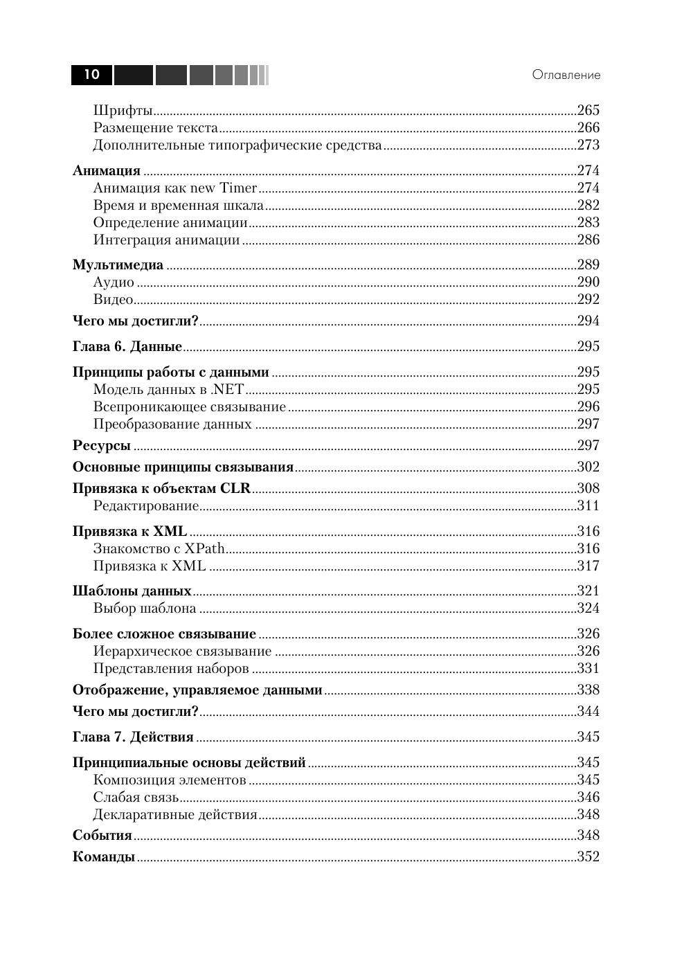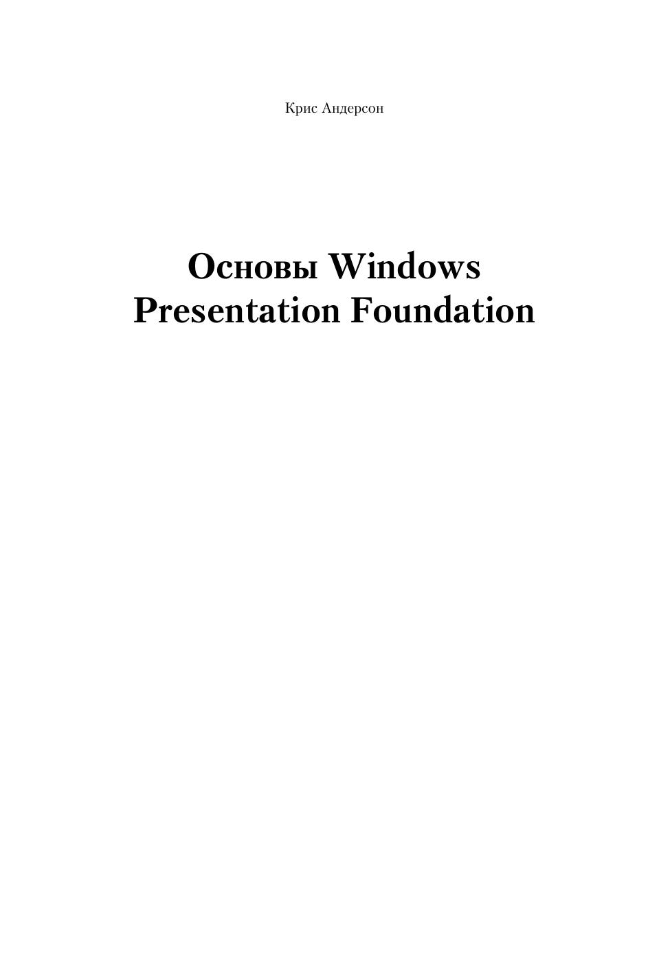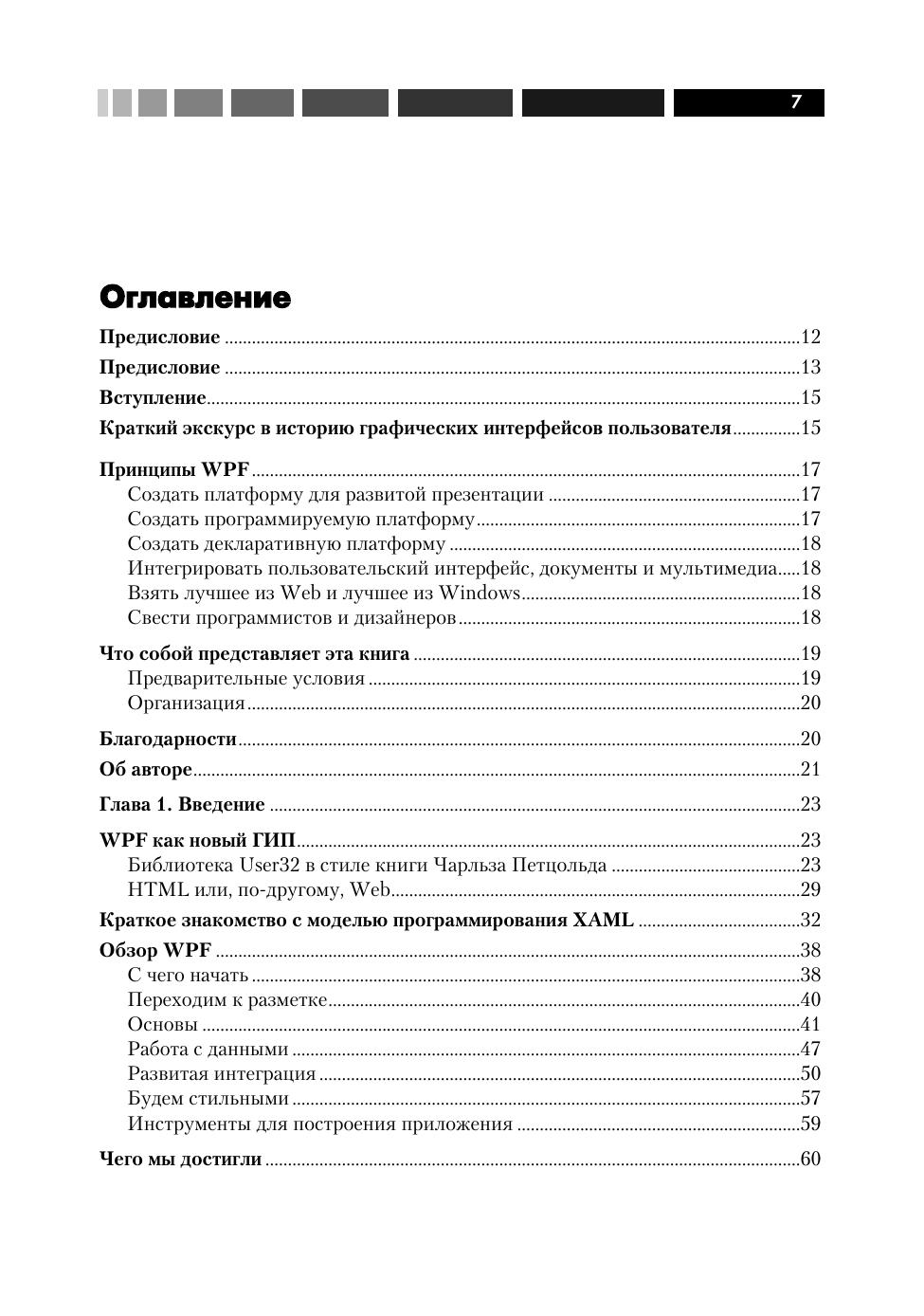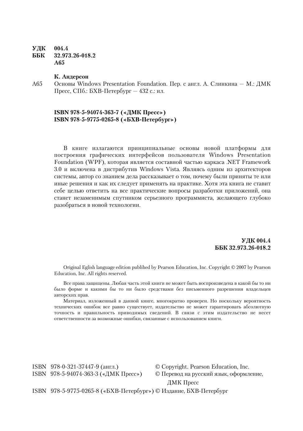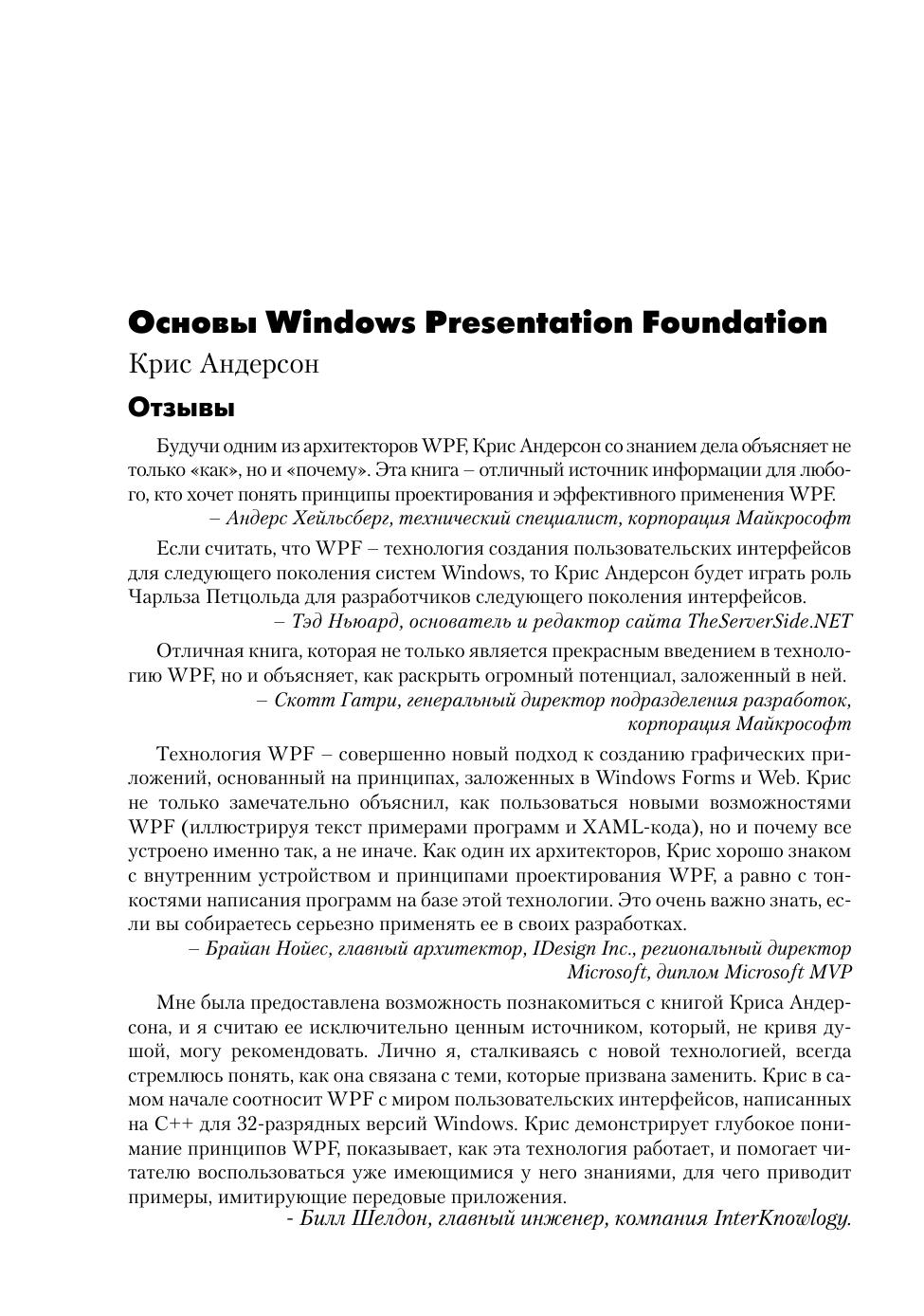 В книге излагаются принципиальные основы новой платформы для построения графических интерфейсов пользователя Windows Presentation Foundation (WPF), которая является составной частью каркаса .NET Framework 3.0 и включена в дистрибутив Windows Vista. Являясь одним из архитекторов системы, автор со знанием дела рассказывает о том, почему были приняты те или иные решения и как их следует применять на практике. Хотя эта книга не ставит себе целью ответить на все практические вопросы разработки приложений, она станет незаменимым спутником серьезного программиста, желающего глубоко разобраться в новой технологии.