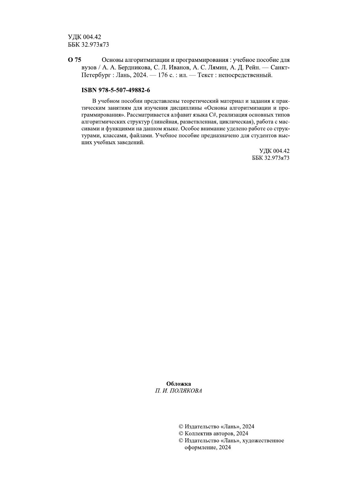 В учебном пособии представлены теоретический материал и задания к практическим занятиям для изучения дисциплины «Основы алгоритмизации и программирования». Рассматривается алфавит языка С#, реализация основных типов алгоритмических структур (линейная, разветвленная, циклическая), работа с массивами и функциями на данном языке. Особое внимание уделено работе со структурами, классами, файлами. Учебное пособие предназначено для студентов высших учебных заведений.
