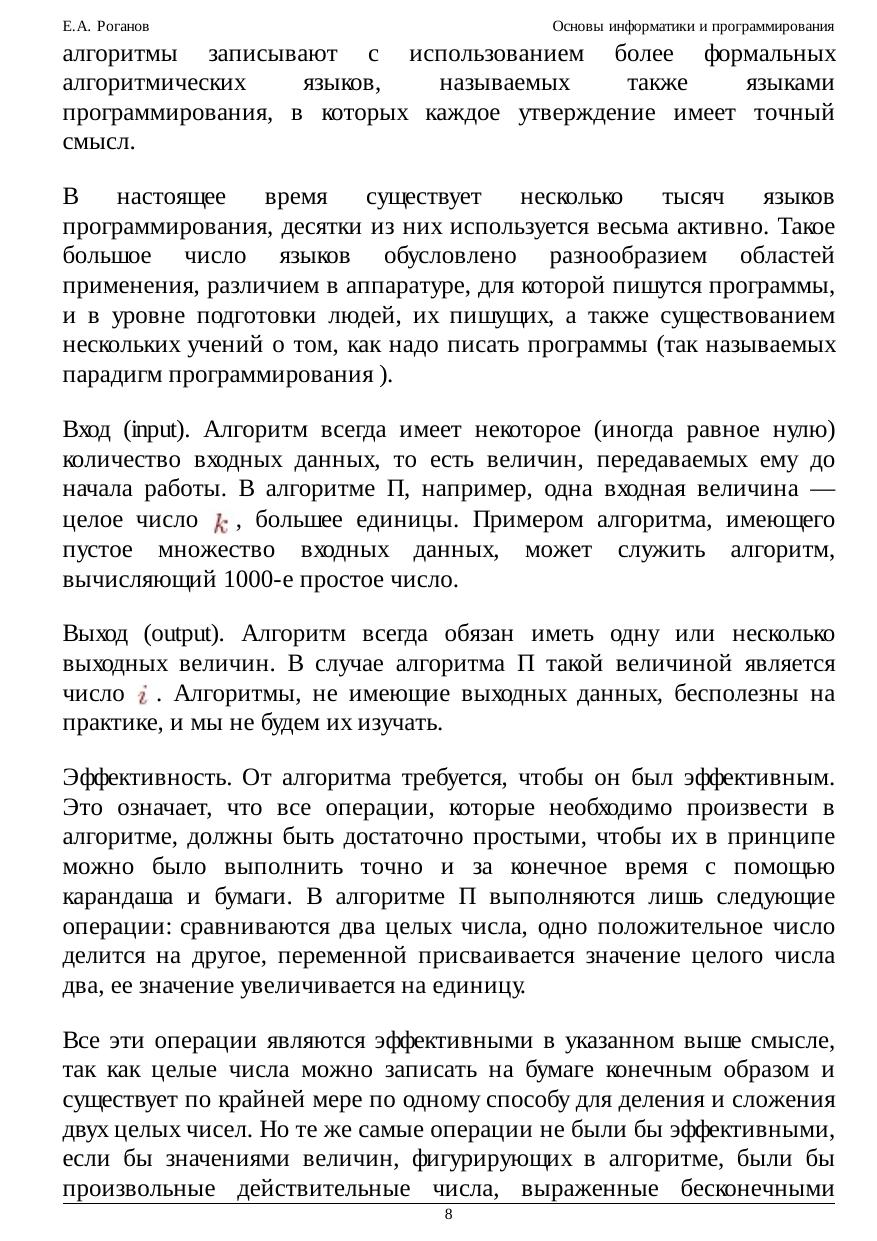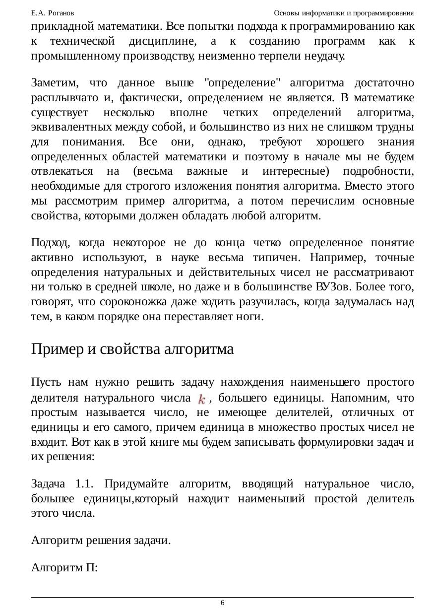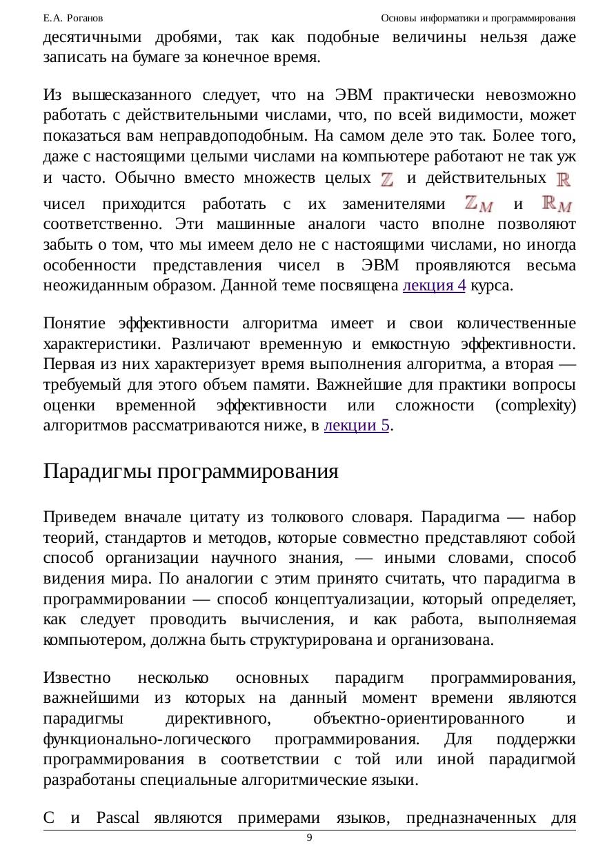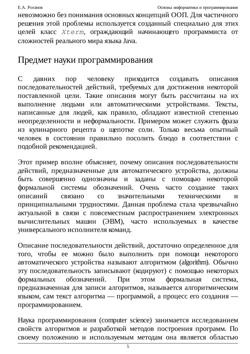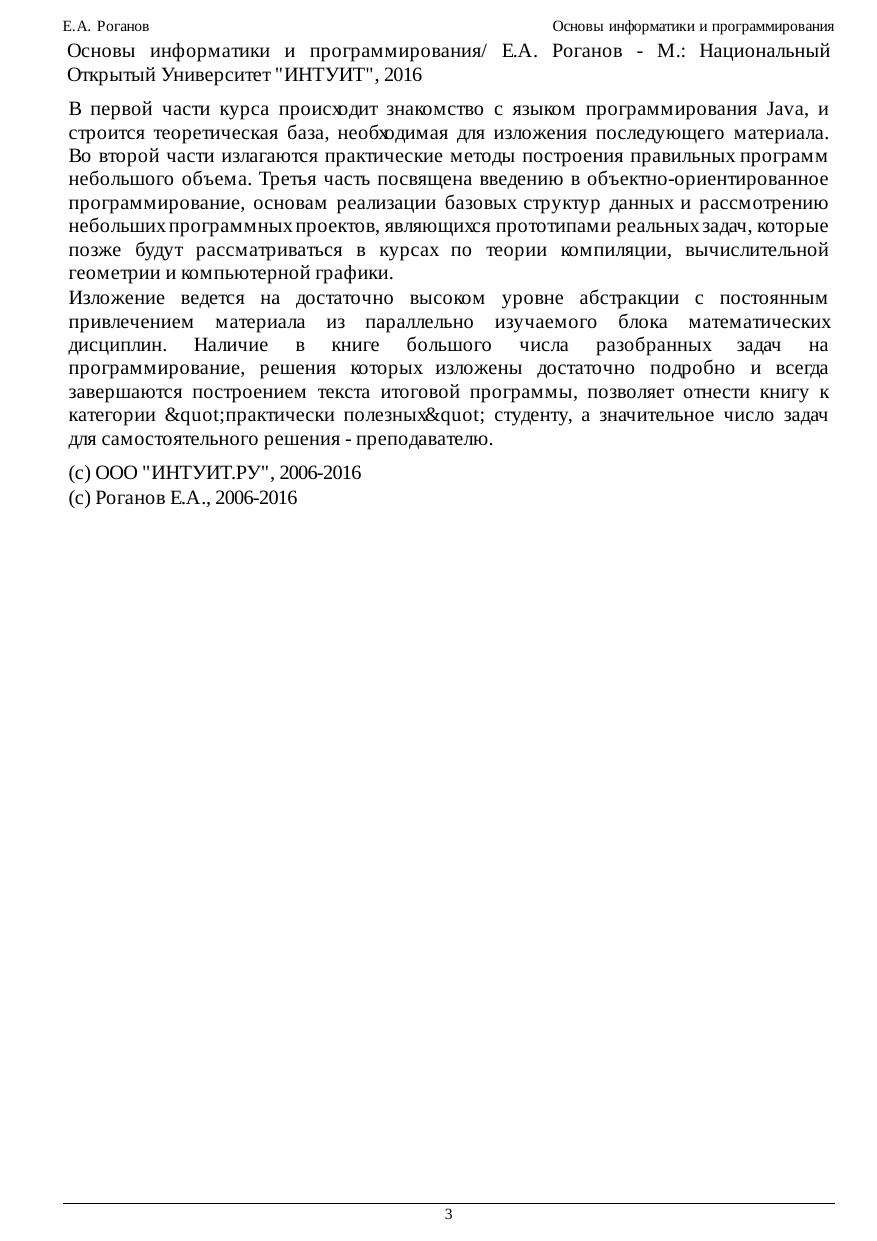 небольшого объема. Третья часть посвящена введению в объектно-ориентированное программирование, основам реализации базовых структур данных и рассмотрению небольших программных проектов, являющихся прототипами реальных задач, которые позже будут рассматриваться в курсах по теории компиляции, вычислительной геометрии и компьютерной графики. Изложение ведется на достаточно высоком уровне абстракции с постоянным привлечением материала из параллельно изучаемого блока математических дисциплин. Наличие в книге большого числа разобранных задач на программирование, решения которых изложены достаточно подробно и всегда завершаются построением текста итоговой программы, позволяет отнести книгу к категории "практически полезных" студенту, а значительное число задач для самостоятельного решения - преподавателю.