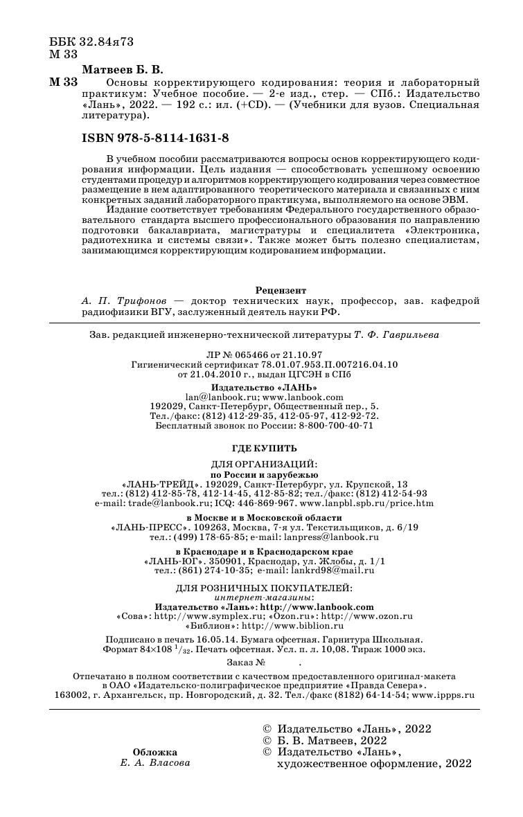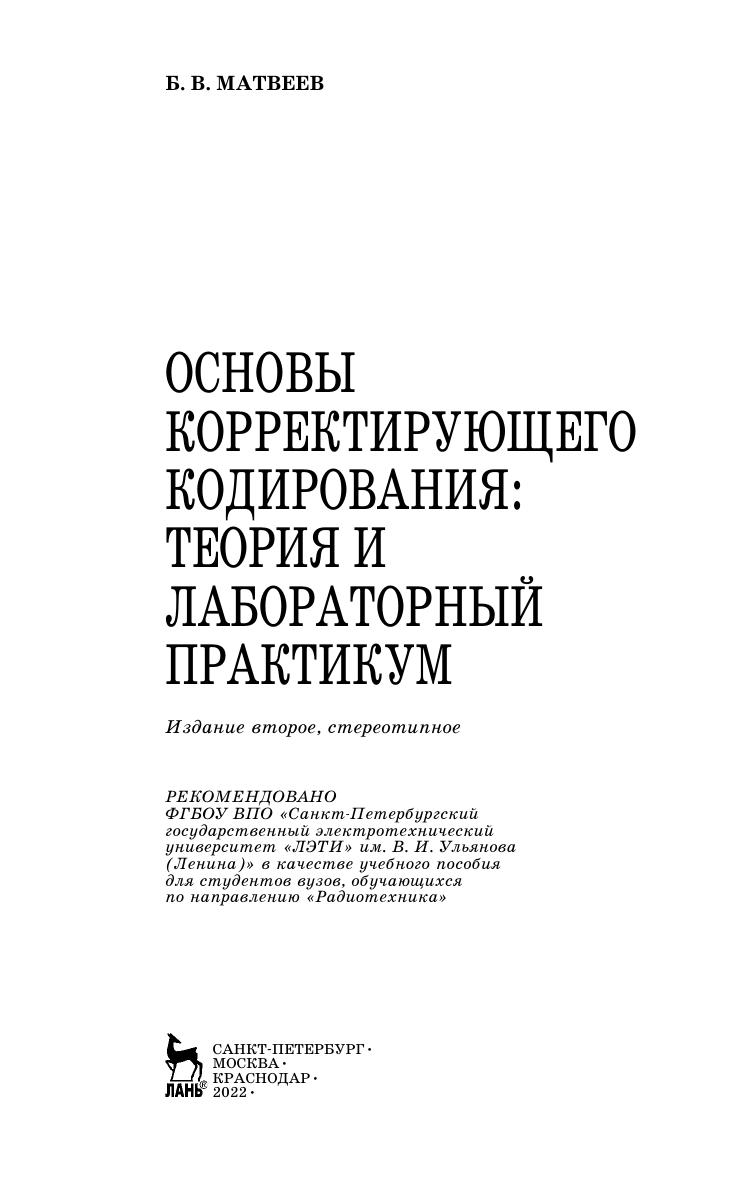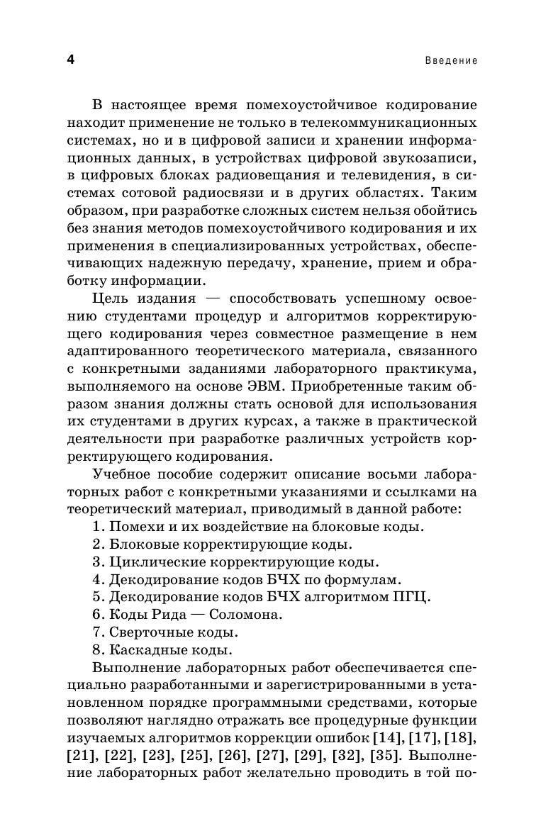 В учебном пособии рассматриваются вопросы основ корректирующего кодирования информации. Цель издания — способствовать успешному освоению студентами процедур и алгоритмов корректирующего кодирования через совместное размещение в нем адаптированного теоретического материала и связанных с ним конкретных заданий лабораторного практикума, выполняемого на основе ЭВМ. Издание соответствует требованиям Федерального государственного образовательного стандарта высшего профессионального образования по направлению подготовки бакалавриата, магистратуры и специалитета «Электроника, радиотехника и системы связи». Также может быть полезно специалистам, занимающимся корректирующим кодированием информации.