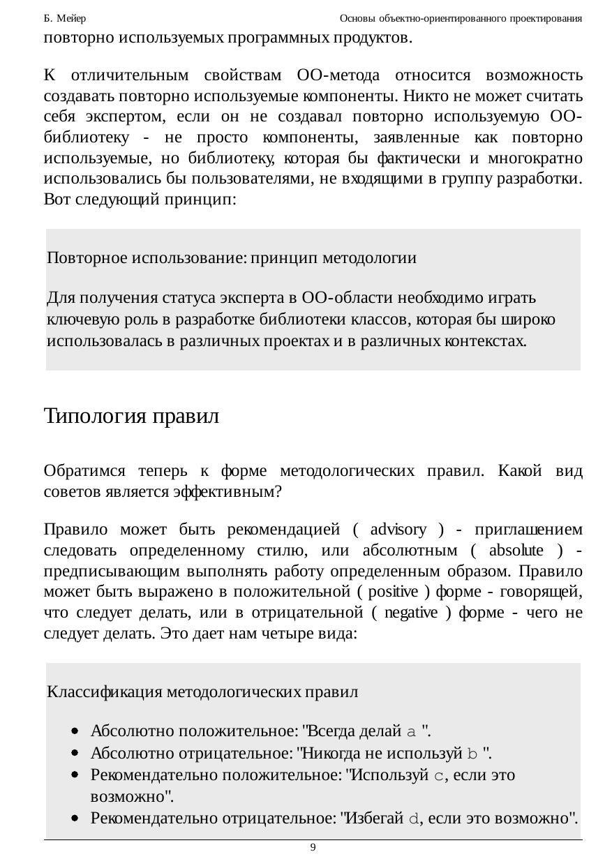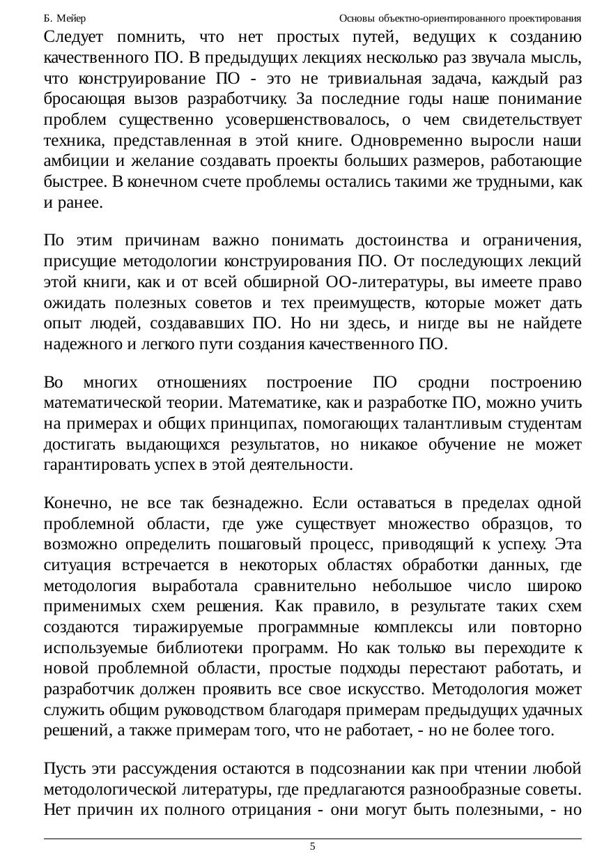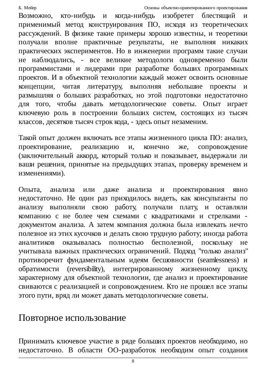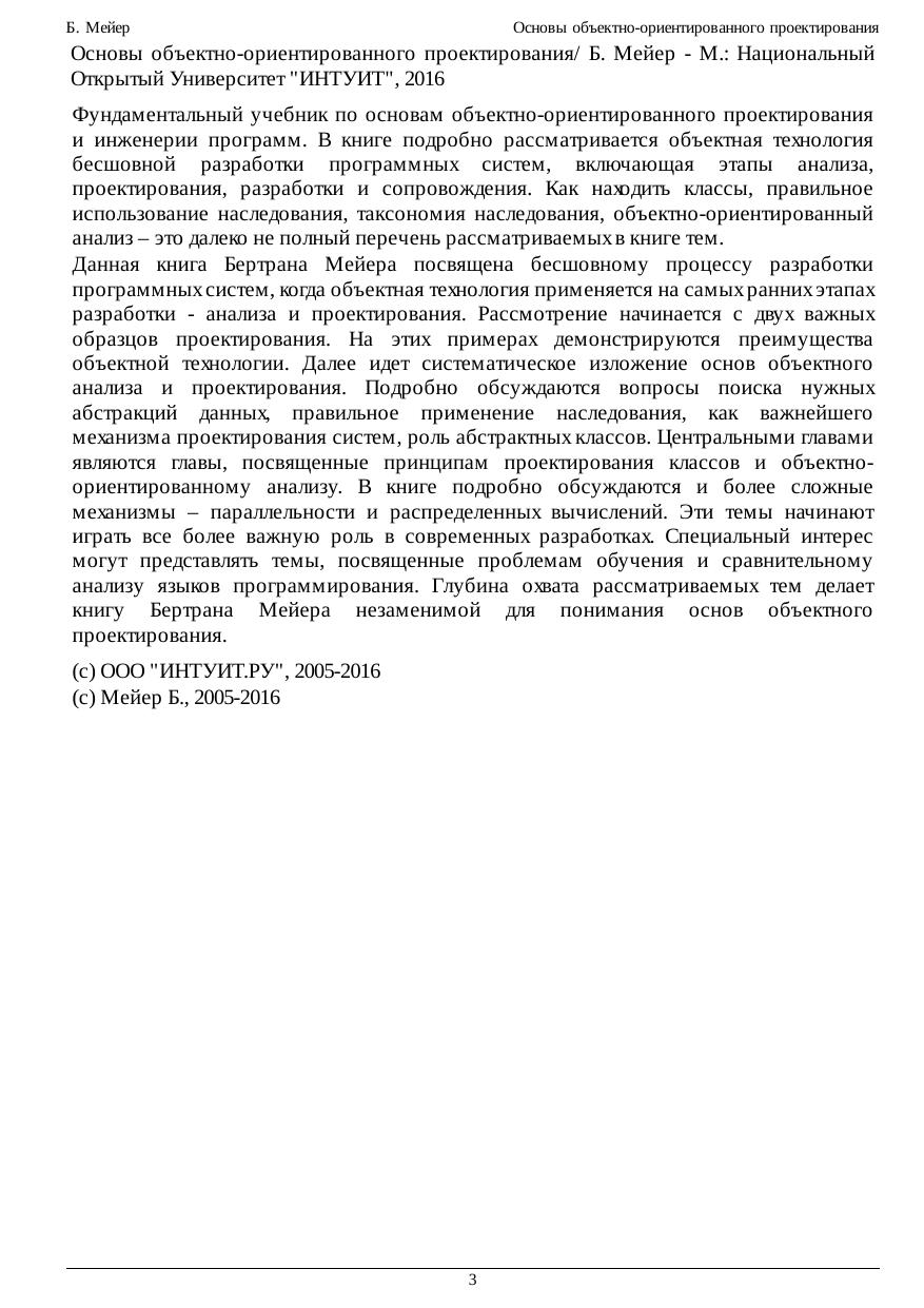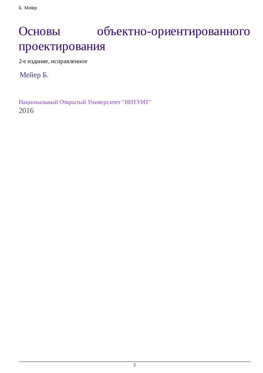 проектирования, разработки и сопровождения. Как находить классы, правильное использование наследования, таксономия наследования, объектно-ориентированный анализ – это далеко не полный перечень рассматриваемых в книге тем. Данная книга Бертрана Мейера посвящена бесшовному процессу разработки программных систем, когда объектная технология применяется на самых ранних этапах разработки - анализа и проектирования. Рассмотрение начинается с двух важных образцов проектирования. На этих примерах демонстрируются преимущества объектной технологии. Далее идет систематическое изложение основ объектного анализа и проектирования. Подробно обсуждаются вопросы поиска нужных абстракций данных, правильное применение наследования, как важнейшего механизма проектирования систем, роль абстрактных классов. Центральными главами являются главы, посвященные принципам проектирования классов и объектно- ориентированному анализу. В книге подробно обсуждаются и более сложные механизмы – параллельности и распределенных вычислений. Эти темы начинают играть все более важную роль в современных разработках. Специальный интерес могут представлять темы, посвященные проблемам обучения и сравнительному анализу языков программирования. Глубина охвата рассматриваемых тем делает книгу Бертрана Мейера незаменимой для понимания основ объектного проектирования.