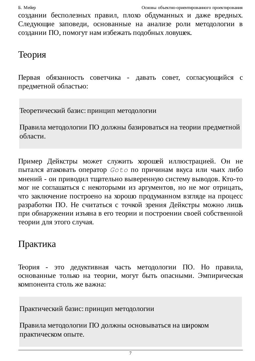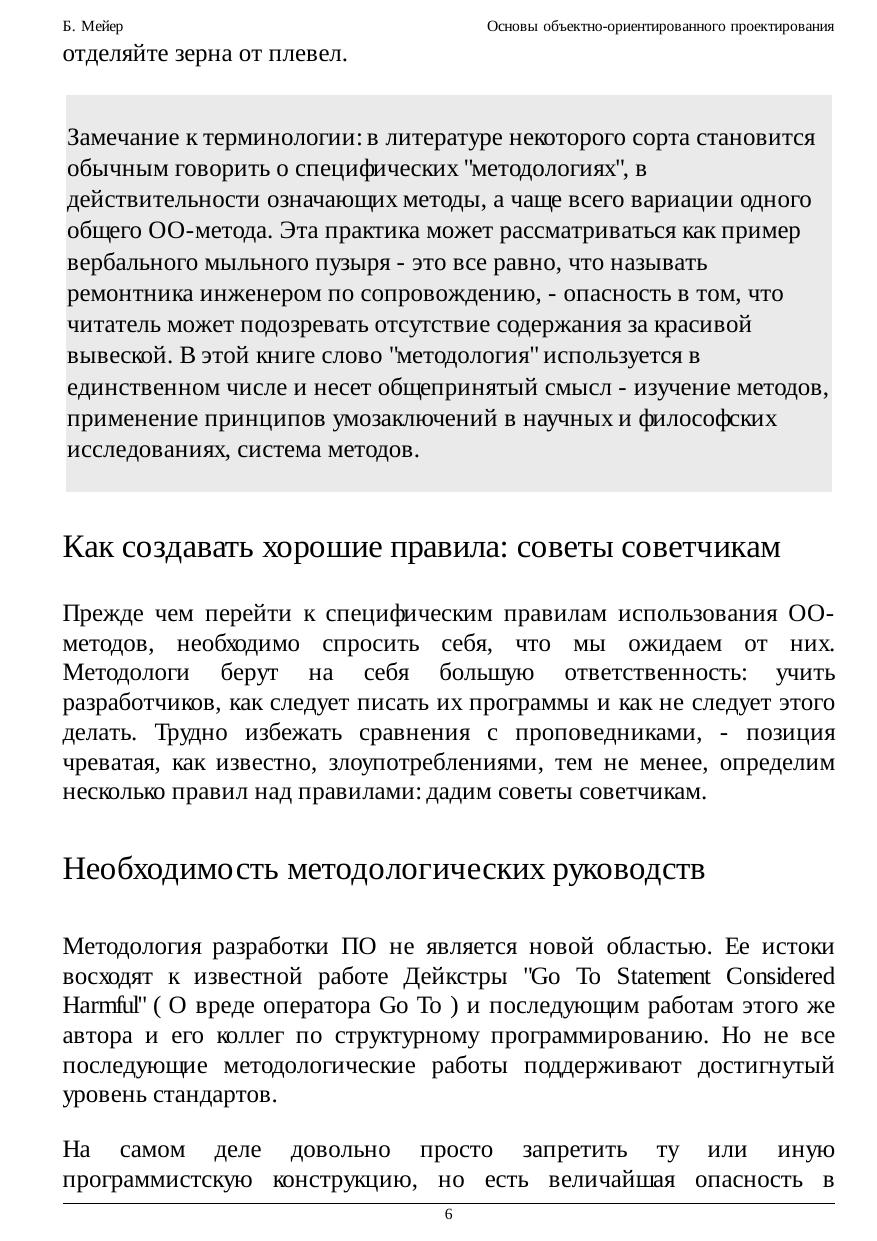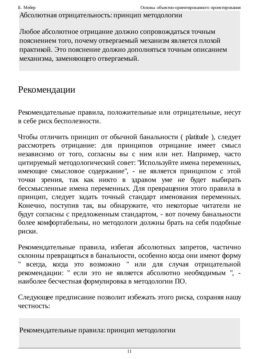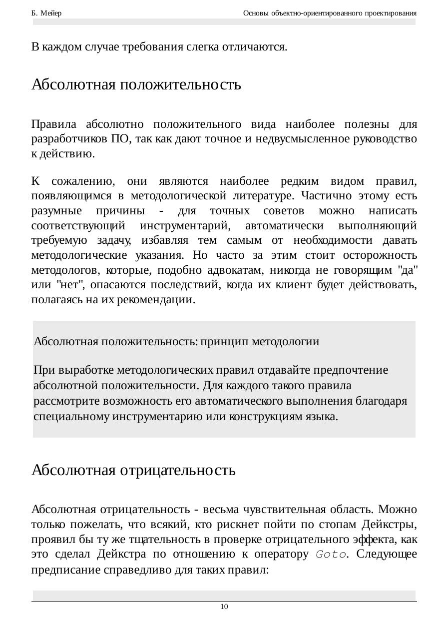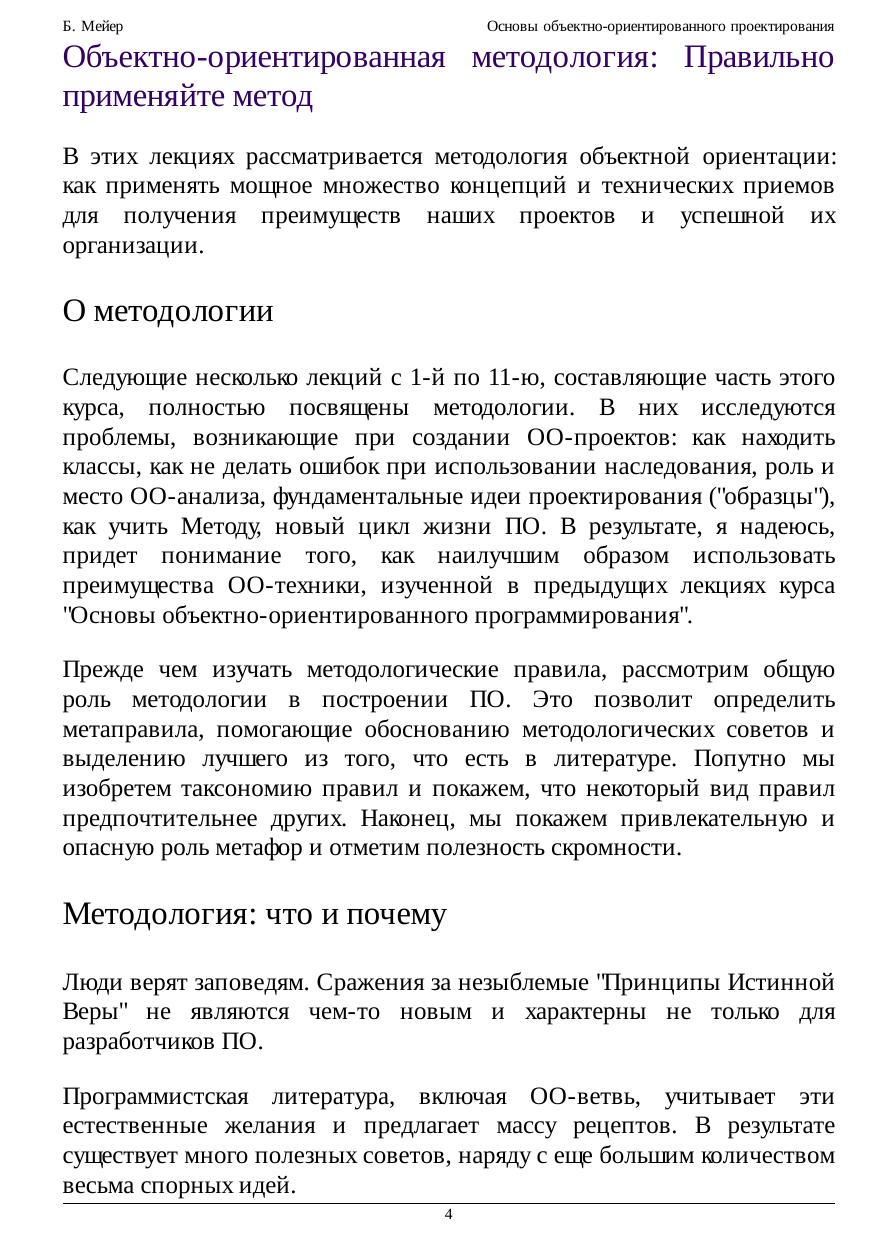 проектирования, разработки и сопровождения. Как находить классы, правильное использование наследования, таксономия наследования, объектно-ориентированный анализ – это далеко не полный перечень рассматриваемых в книге тем. Данная книга Бертрана Мейера посвящена бесшовному процессу разработки программных систем, когда объектная технология применяется на самых ранних этапах разработки - анализа и проектирования. Рассмотрение начинается с двух важных образцов проектирования. На этих примерах демонстрируются преимущества объектной технологии. Далее идет систематическое изложение основ объектного анализа и проектирования. Подробно обсуждаются вопросы поиска нужных абстракций данных, правильное применение наследования, как важнейшего механизма проектирования систем, роль абстрактных классов. Центральными главами являются главы, посвященные принципам проектирования классов и объектно- ориентированному анализу. В книге подробно обсуждаются и более сложные механизмы – параллельности и распределенных вычислений. Эти темы начинают играть все более важную роль в современных разработках. Специальный интерес могут представлять темы, посвященные проблемам обучения и сравнительному анализу языков программирования. Глубина охвата рассматриваемых тем делает книгу Бертрана Мейера незаменимой для понимания основ объектного проектирования.