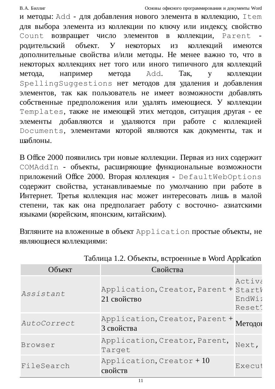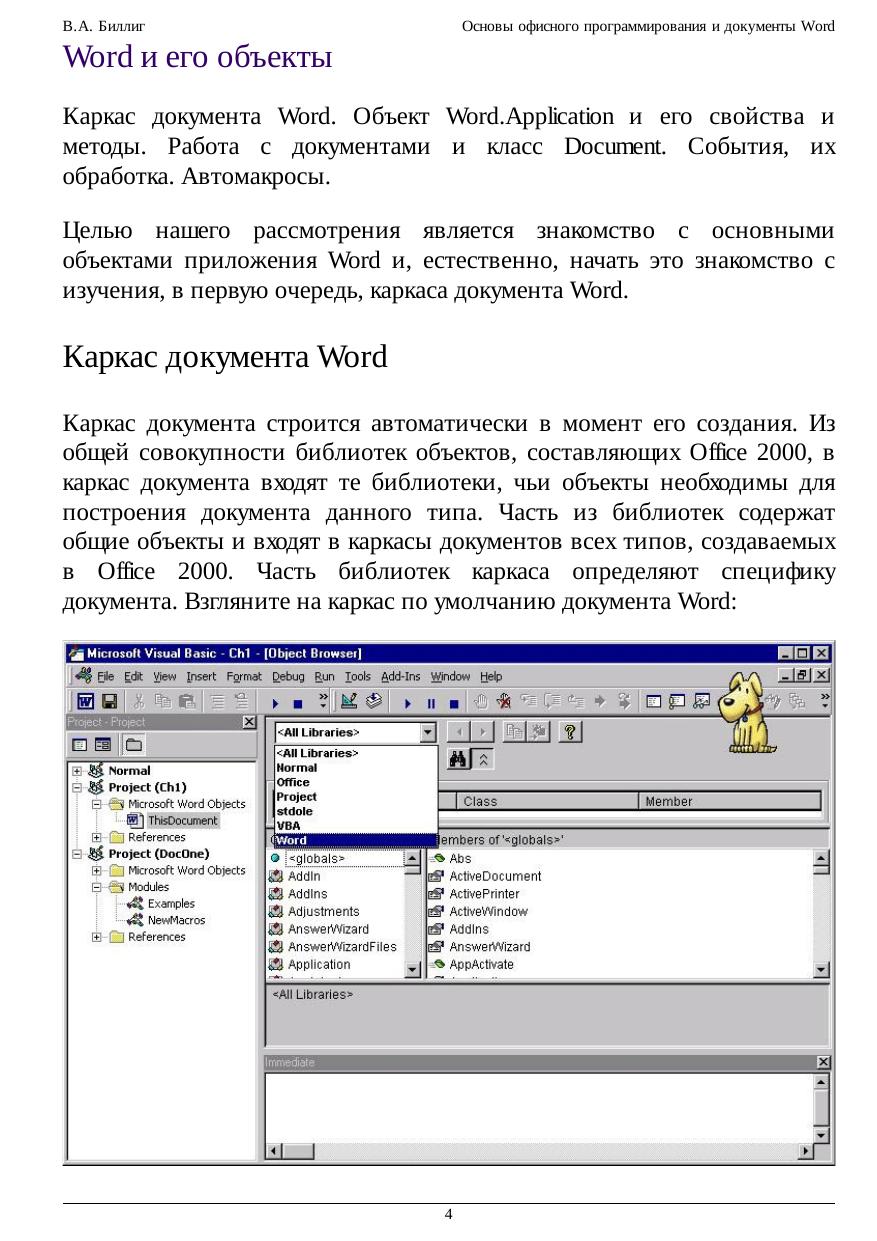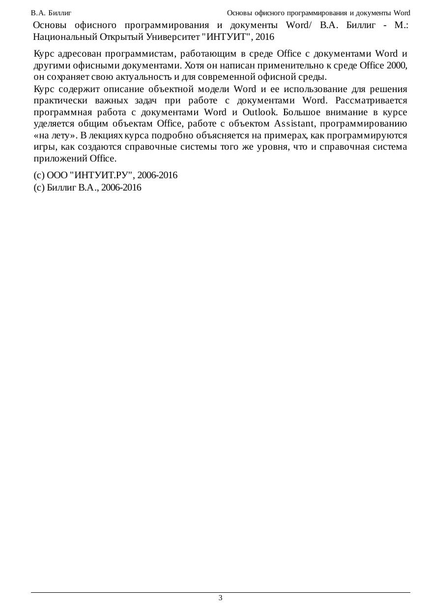 Курс адресован программистам, работающим в среде Office с документами Word и другими офисными документами. Хотя он написан применительно к среде Office 2000, он сохраняет свою актуальность и для современной офисной среды. Курс содержит описание объектной модели Word и ее использование для решения практически важных задач при работе с документами Word. Рассматривается программная работа с документами Word и Outlook. Большое внимание в курсе уделяется общим объектам Office, работе с объектом Assistant, программированию «на лету». В лекциях курса подробно объясняется на примерах, как программируются игры, как создаются справочные системы того же уровня, что и справочная система