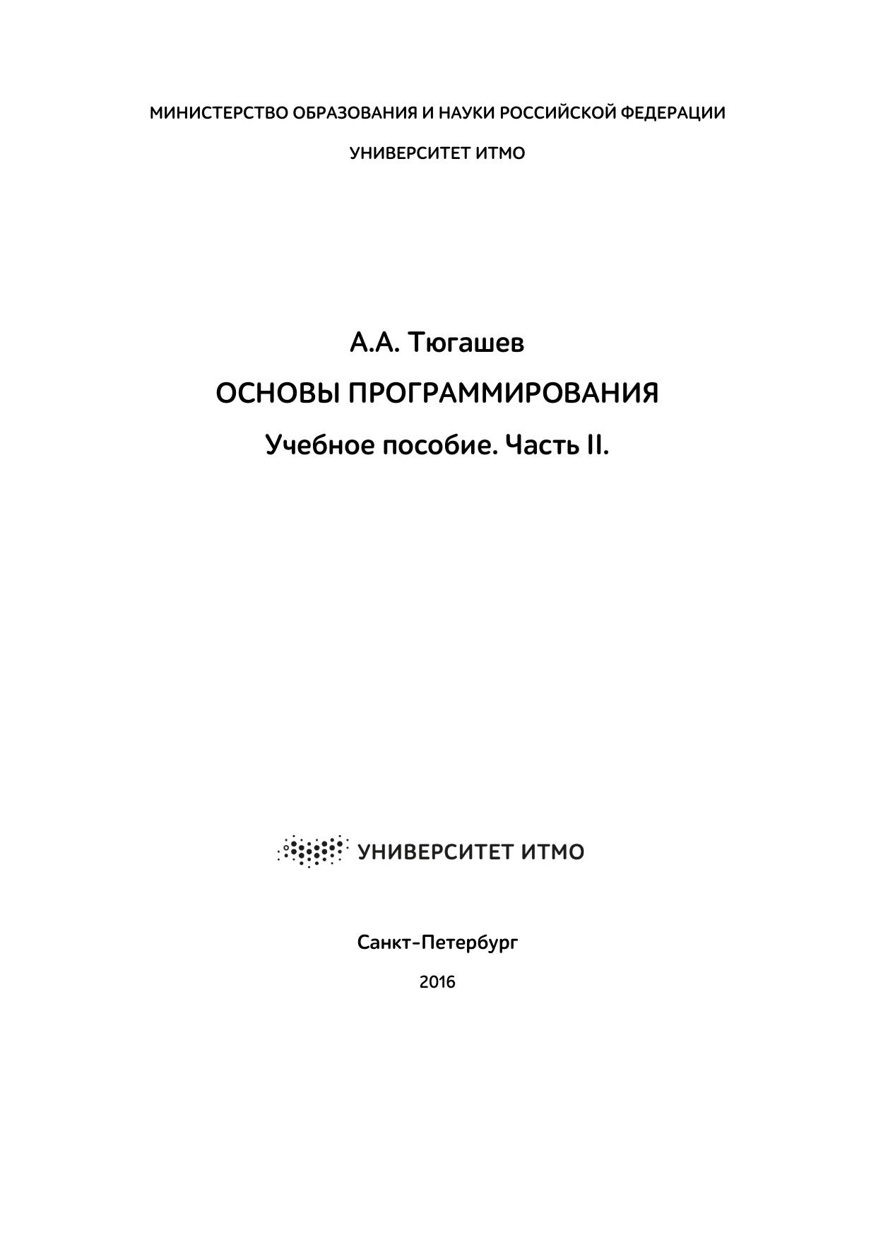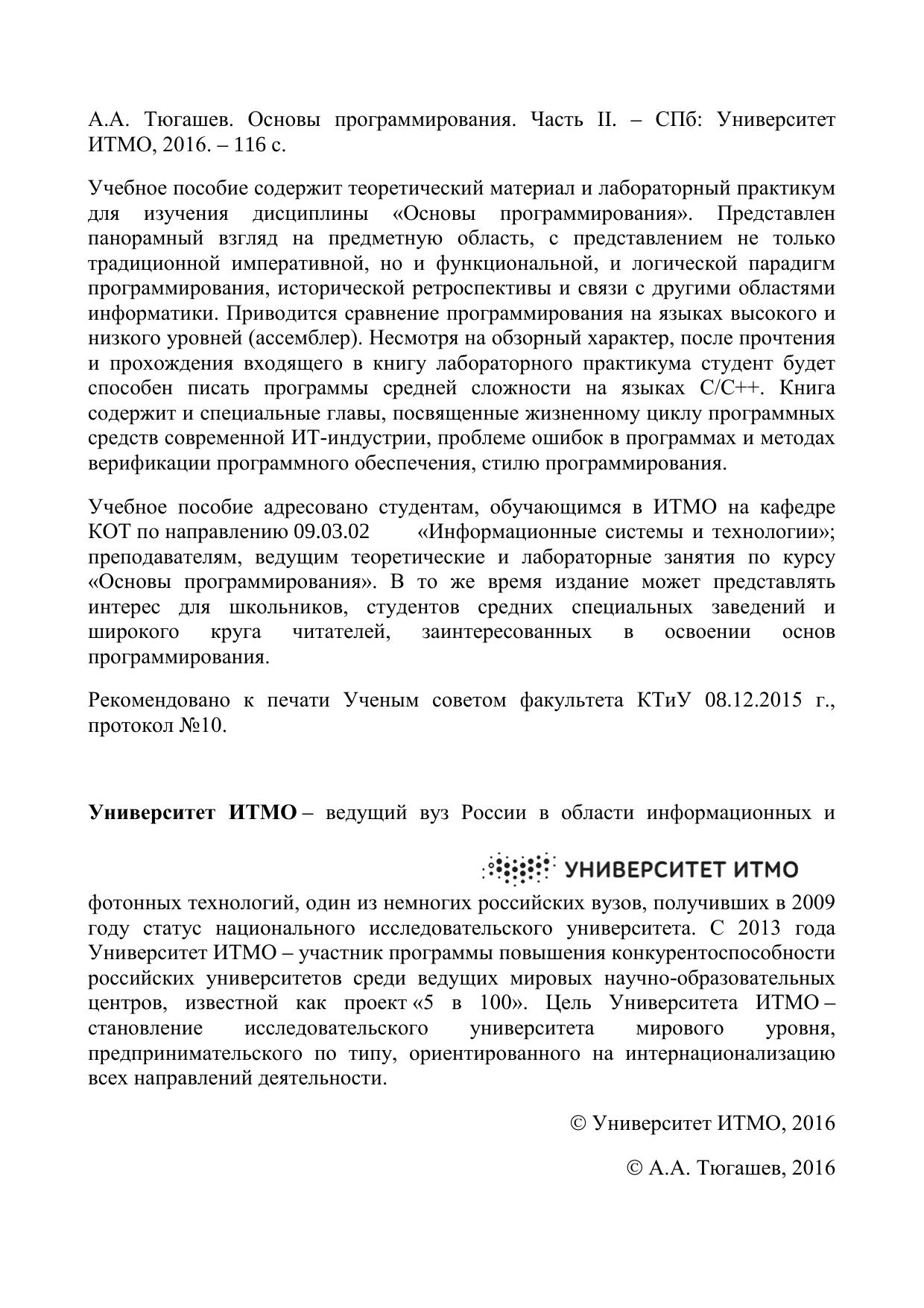 Учебное пособие адресовано студентам, обучающимся в ИТМО на кафедре КОТ по направлению 09.03.02 «Информационные системы и технологии»; преподавателям, ведущим теоретические и лабораторные занятия по курсу «Основы программирования». В то же время издание может представлять интерес для школьников, студентов средних специальных заведений и широкого круга читателей, заинтересованных в освоении основ программирования.
