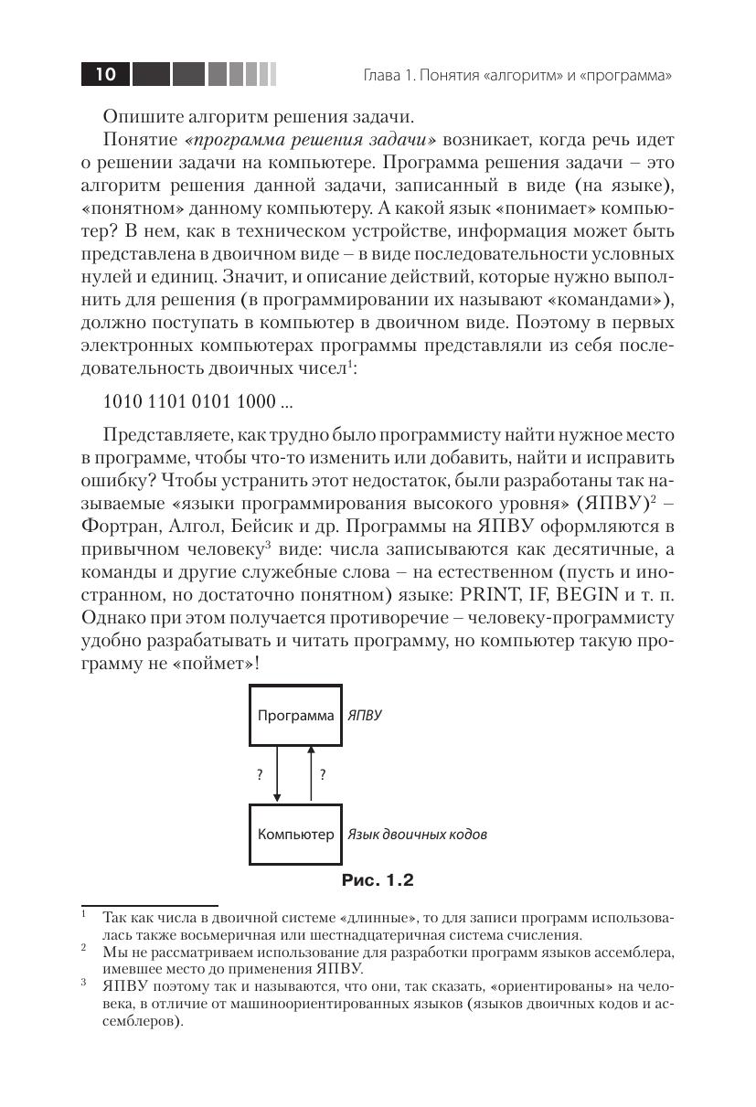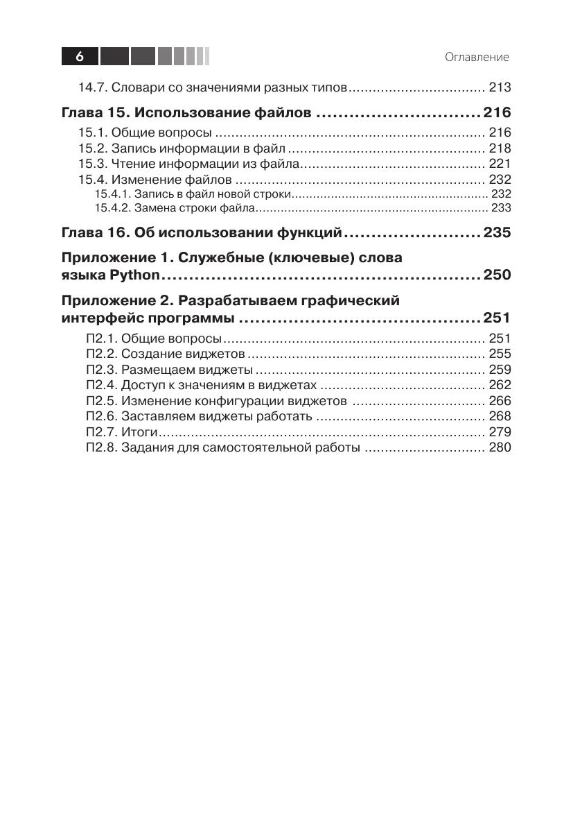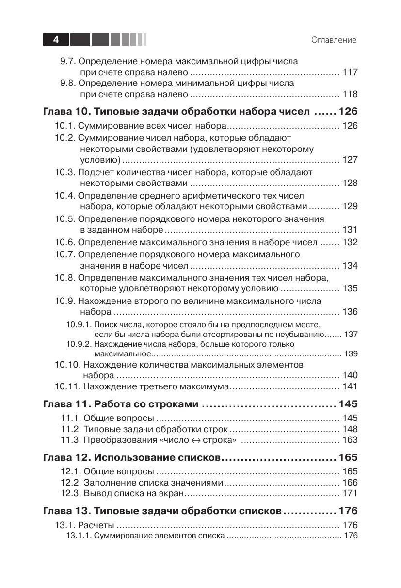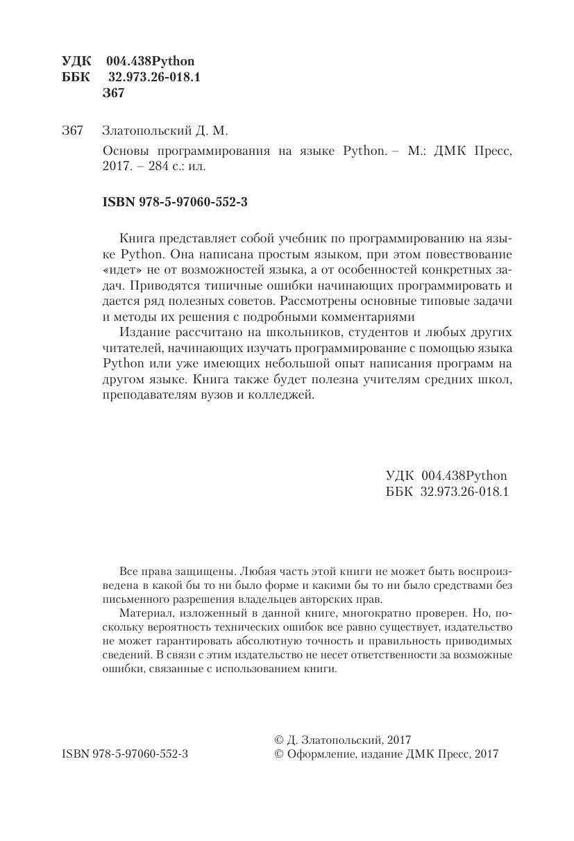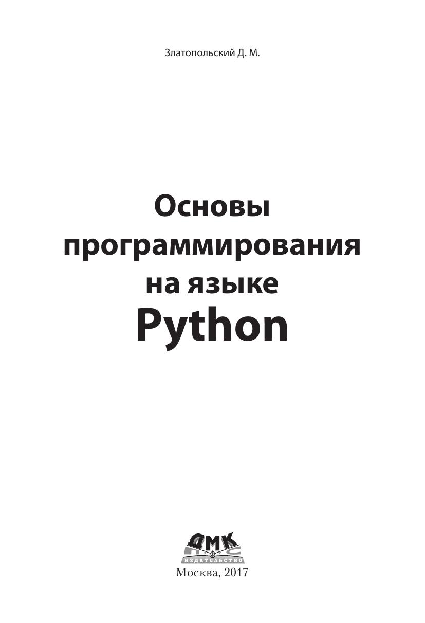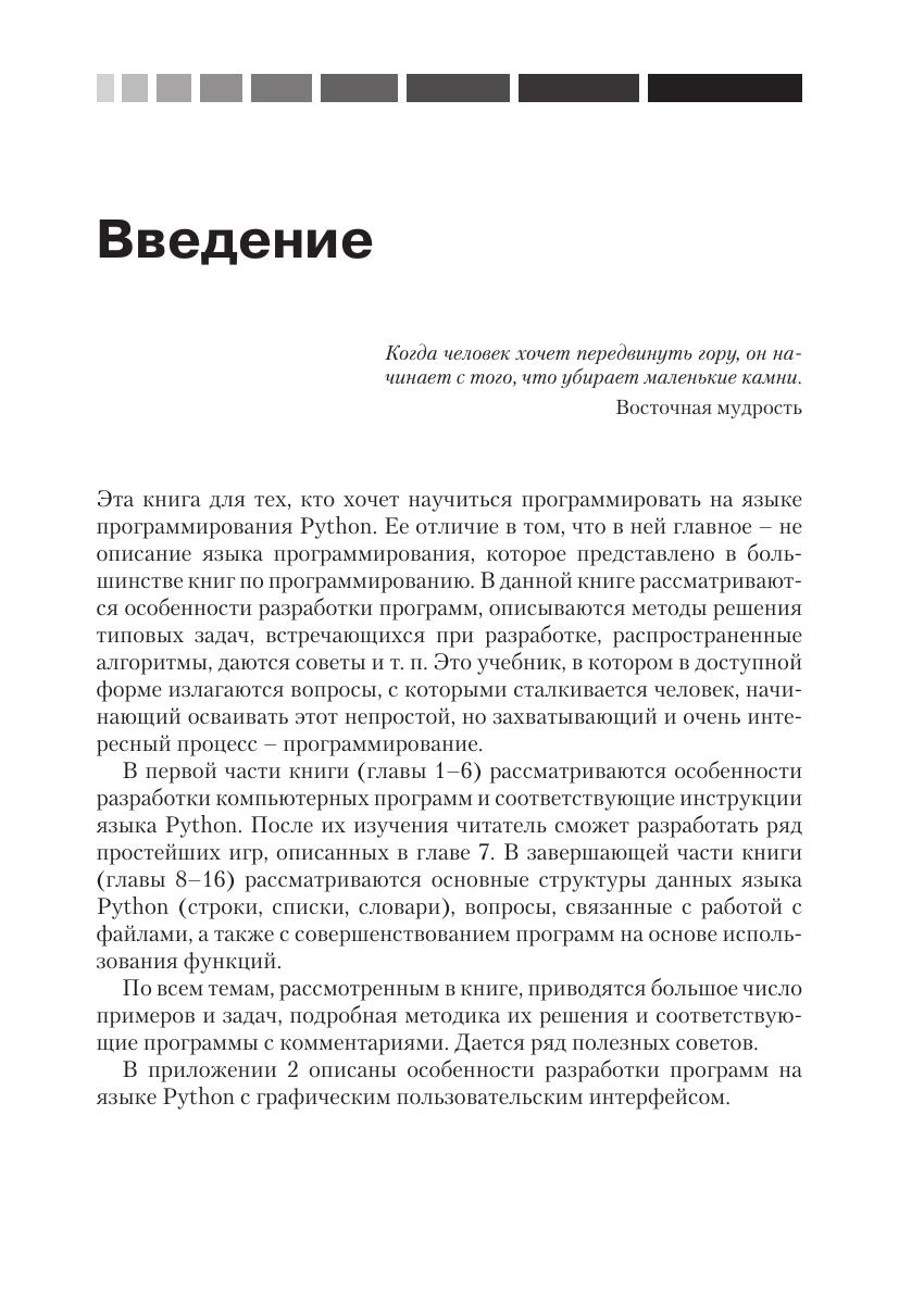 Книга представляет собой учебник по программированию на языке Python. Она написана простым языком, при этом повествование «идет» не от возможностей языка, а от особенностей конкретных задач. Приводятся типичные ошибки начинающих программировать и дается ряд полезных советов. Рассмотрены основные типовые задачи и методы их решения с подробными комментариями Издание рассчитано на школьников, студентов и любых других читателей, начинающих изучать программирование с помощью языка Python или уже имеющих небольшой опыт написания программ на другом языке. Книга также будет полезна учителям средних школ, преподавателям вузов и колледжей.
