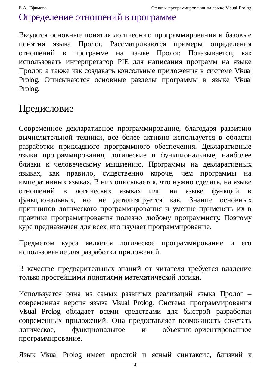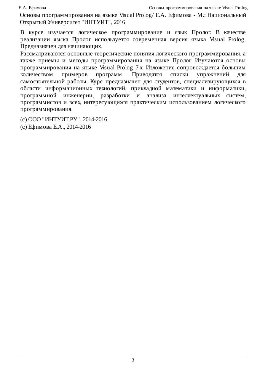 В курсе изучается логическое программирование и язык Пролог. В качестве реализации языка Пролог используется современная версия языка Visual Prolog. Предназначен для начинающих. Рассматриваются основные теоретические понятия логического программирования, а также приемы и методы программирования на языке Пролог. Изучаются основы программирования на языке Visual Prolog 7.x. Изложение сопровождается большим количеством примеров программ. Приводятся списки упражнений для самостоятельной работы. Курс предназначен для студентов, специализирующихся в области информационных технологий, прикладной математики и информатики, программной инженерии, разработки и анализа интеллектуальных систем, программистов и всех, интересующихся практическим использованием логического программирования.