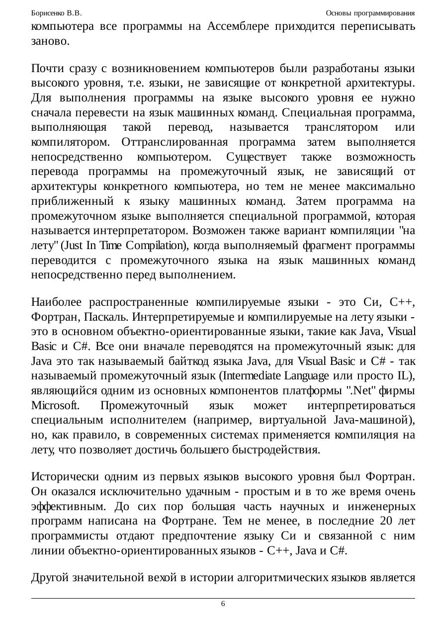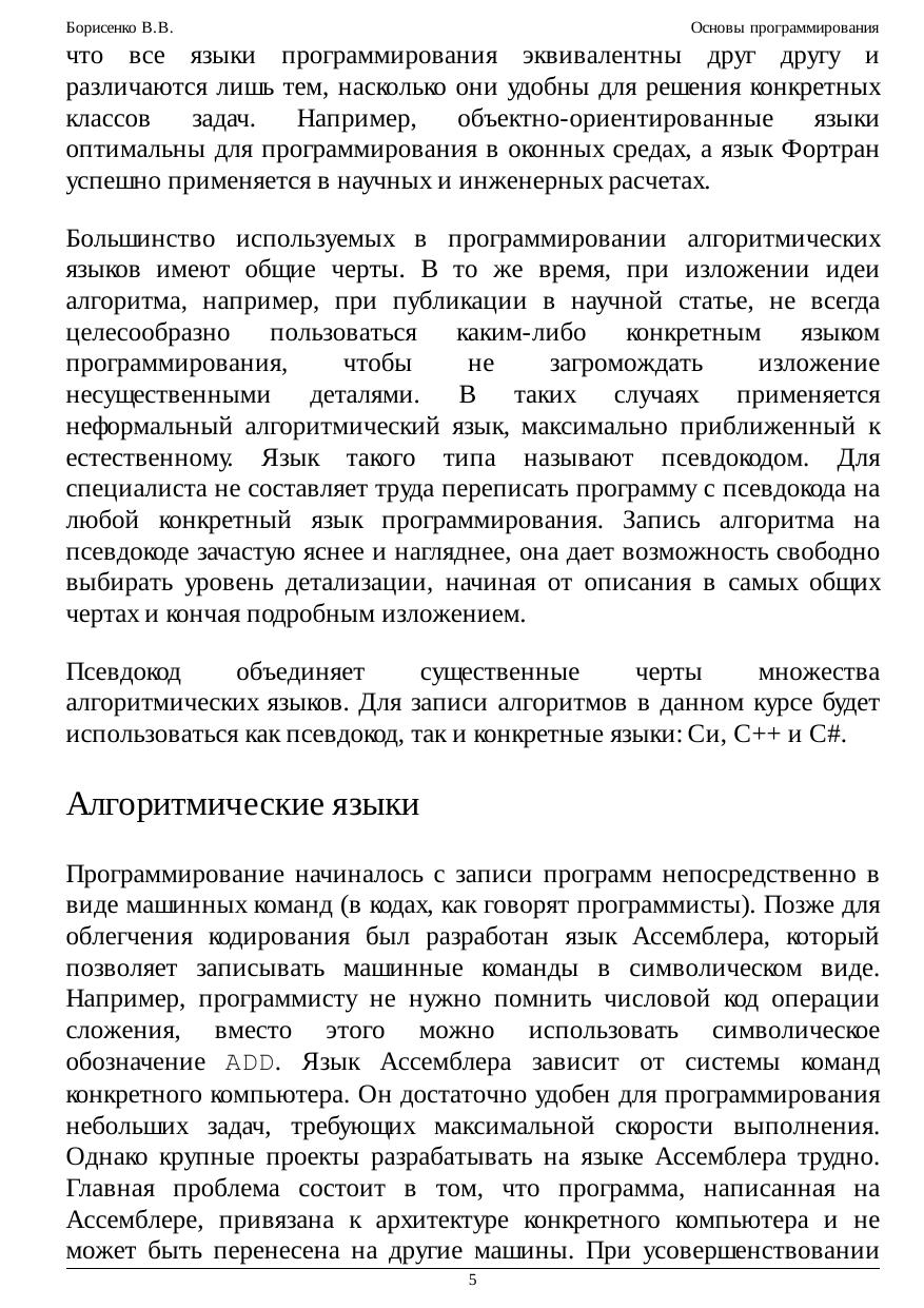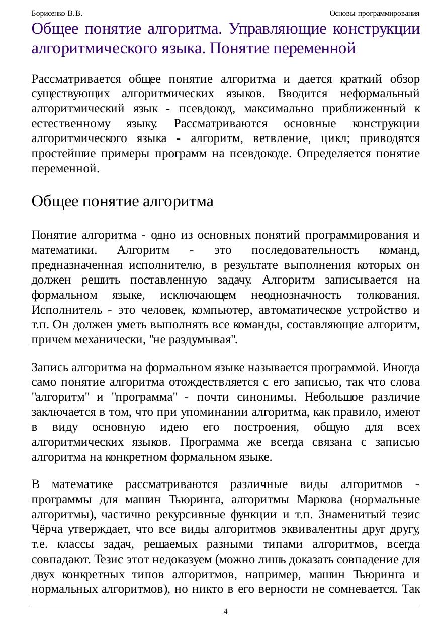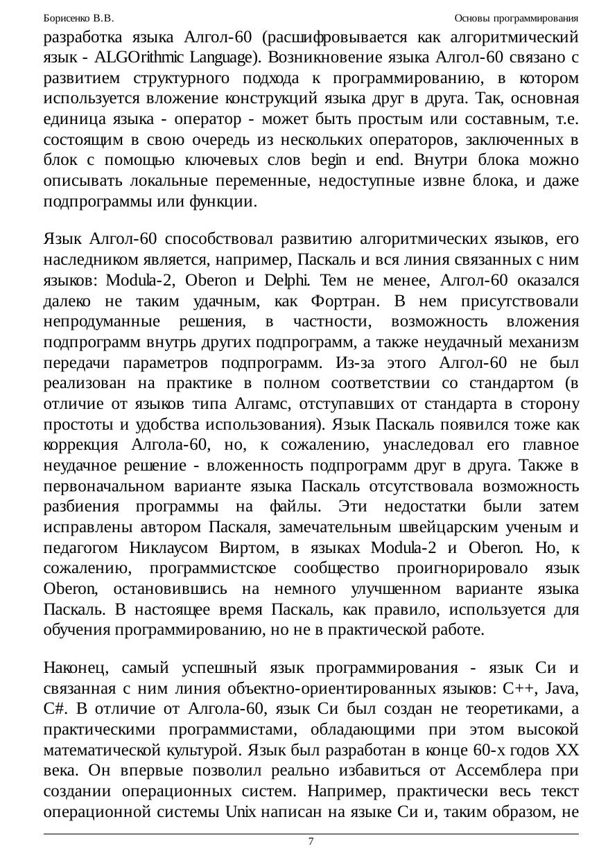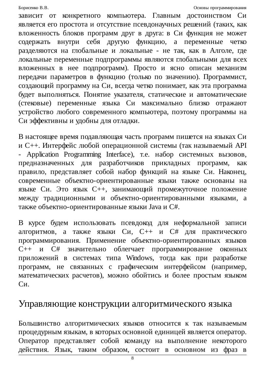 Курс предназначен для обучения основам программирования. Рассматриваются основные понятия программирования - алгоритма, исполнителя, алгоритмического языка, переменной, основные типы данных, управляющие конструкции алгоритмического языка и т.п. Излагаются общие приемы программирования, основанные на применении математики, такие, как вычисление функций на последовательностях с помощью применения теории индуктивных функций и схема построения цикла с помощью инварианта. Рассматриваются общие принципы устройства и работы компьютера, типичные команды и регистры процессора, методы адресации, способы вызова функций и передачи параметров и т.п. Приводятся примеры записи программ как на виртуальном Ассемблере RTL, так и на Ассемблере процессора Intel 80386. Кратко рассмотрены аппаратные средства поддержки многозадачности. Значительная часть курса посвящена основам языка Си. Помимо основ языка, в ней приведено много примеров реализации алгоритмов на Си, таких как вычисление корня функции, приведение матрицы к ступенчатому виду методом Гаусса, работа с файлами и текстами и т.п. Последние лекции посвящены структурам данных и их реализациям. Рассматриваются структуры последовательного и прямого доступа, такие как стек, очередь, список, дерево, множество и нагруженное множество, а также их непрерывные и ссылочные реализации. Значительное место уделено реализациям множества с помощью бинарного поиска, на базе сбалансированнных деревьев и с помощью хеш-функции. Курс полезен студентам и преподавателям ВУЗов