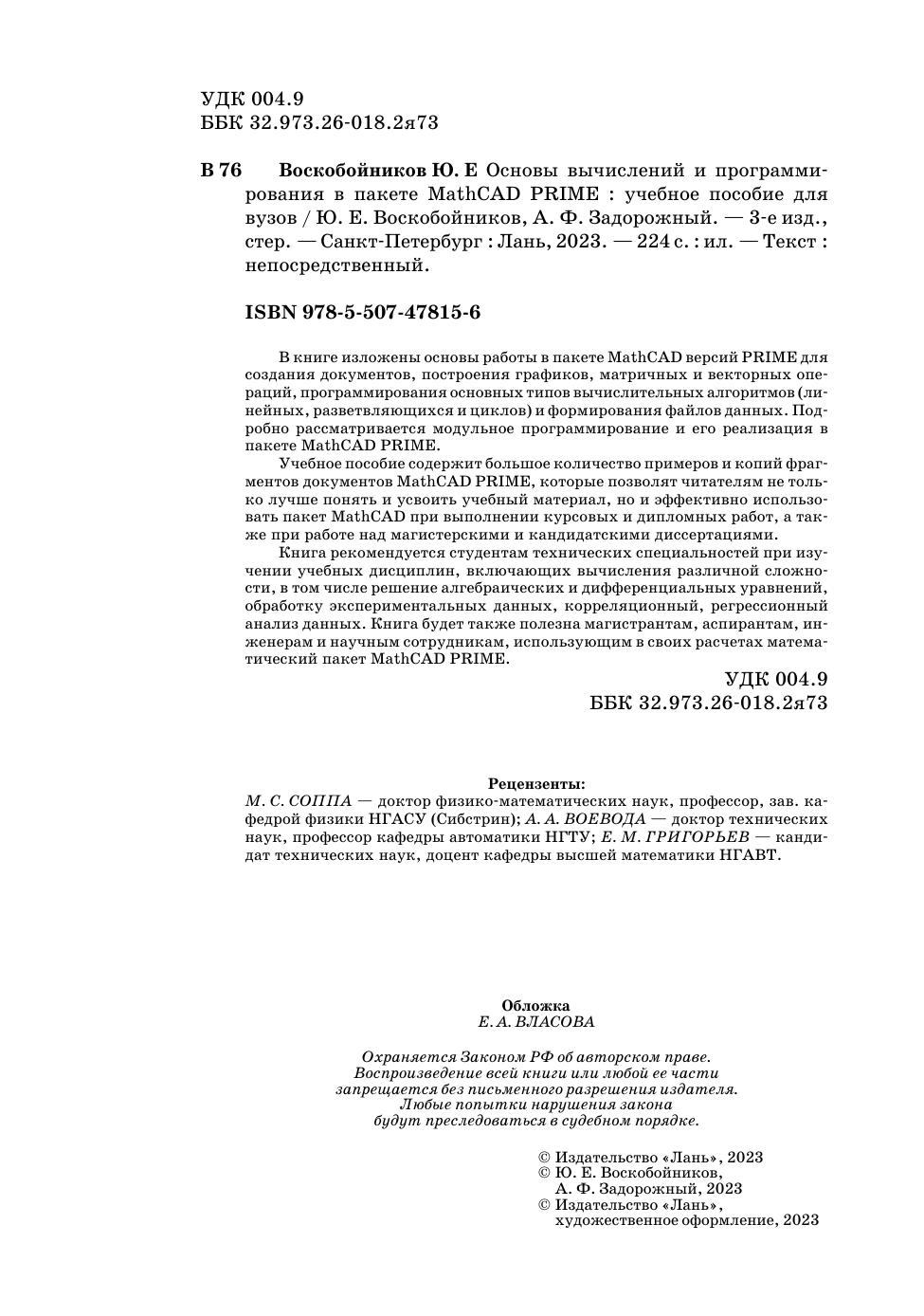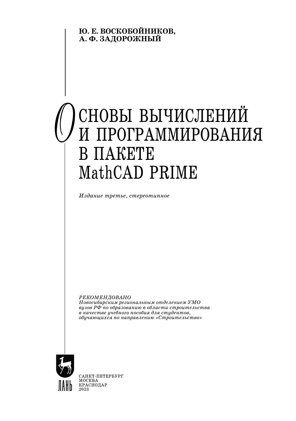 Гриф УМО, для ВПО. В книге изложены основы работы в пакете MathCAD версий Prime для создания документов, построения графиков, матричных и векторных операций, программирования основных типов вычислительных алгоритмов (линейных, разветвляющихся и циклов) и формирования файлов данных. Подробно рассматривается модульное программирование и его реализация в пакете MathCAD PRIME. Учебное пособие содержит большое количество примеров и копий фрагментов документов MathCAD PRIME, которые позволят читателям не только лучше понять и усвоить учебный материал, но и эффективно использовать пакет MathCAD при выполнении курсовых и дипломных работ, а также при работе над магистерскими и кандидатскими диссертациями. Книга рекомендуется студентам технических специальностей при изучении учебных дисциплин, включающих вычисления различной сложности, в том числе решение алгебраических и дифференциальных уравнений, обработку экспериментальных данных, корреляционный, регрессионный анализ данных. Книга будет также полезна магистрантам, аспирантам, инженерам и научным сотрудникам, использующим в своих расчетах математический пакет MathCAD PRIME.