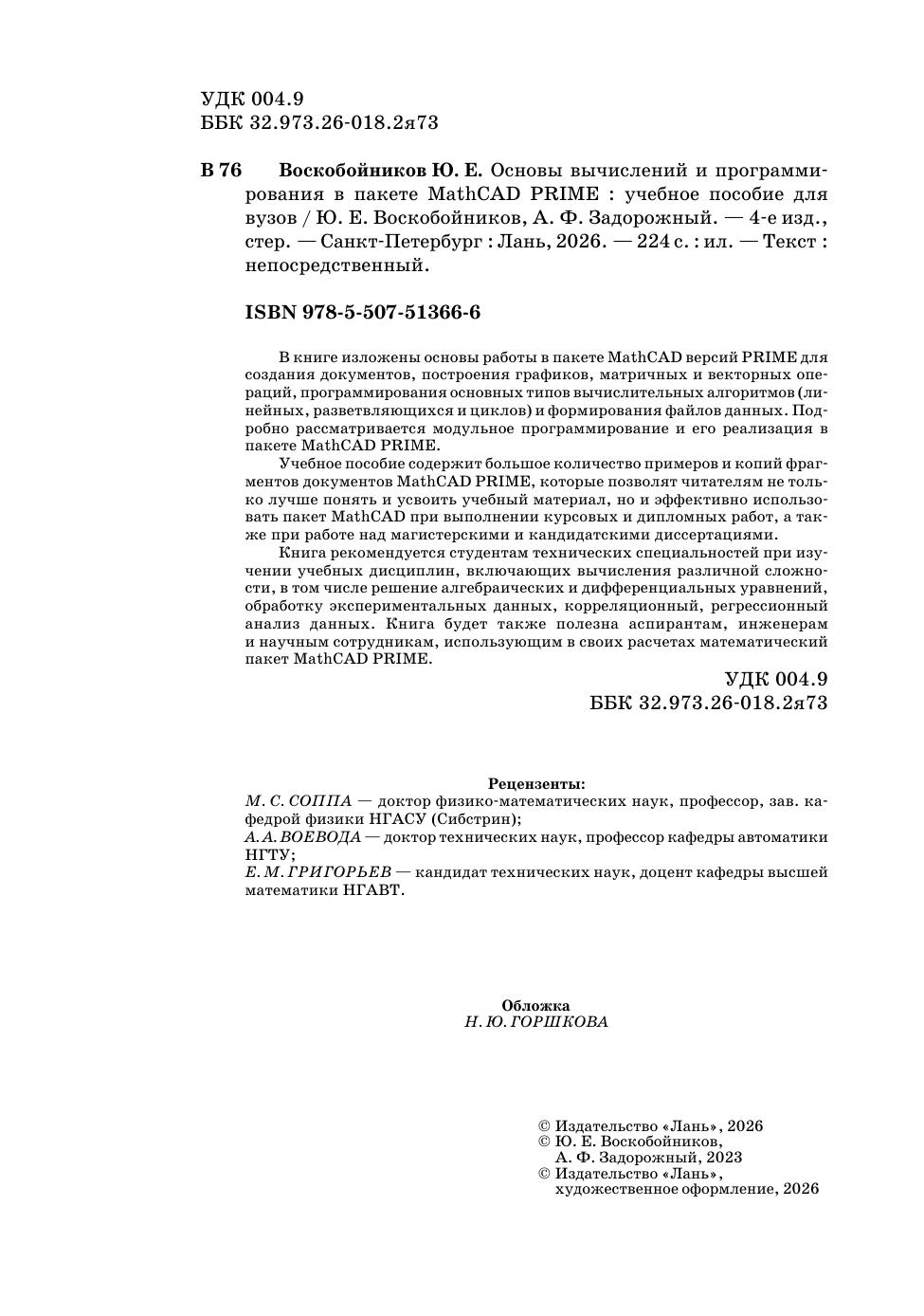 В книге изложены основы работы в пакете MathCAD версий Prime для создания документов, построения графиков, матричных и векторных операций, программирования основных типов вычислительных алгоритмов (линейных, разветвляющихся и циклов) и формирования файлов данных. Подробно рассматривается модульное программирование и его реализация в пакете MathCAD PRIME. Учебное пособие содержит большое количество примеров и копий фрагментов документов MathCAD PRIME, которые позволят читателям не только лучше понять и усвоить учебный материал, но и эффективно использовать пакет MathCAD при выполнении курсовых и дипломных работ, а также при работе над кандидатскими диссертациями. Книга рекомендуется студентам технических специальностей при изучении учебных дисциплин, включающих вычисления различной сложности, в том числе решение алгебраических и дифференциальных уравнений, обработку экспериментальных данных, корреляционный, регрессионный анализ данных. Книга будет также полезна аспирантам, инженерам и научным сотрудникам, использующим в своих расчетах математический пакет MathCAD PRIME.