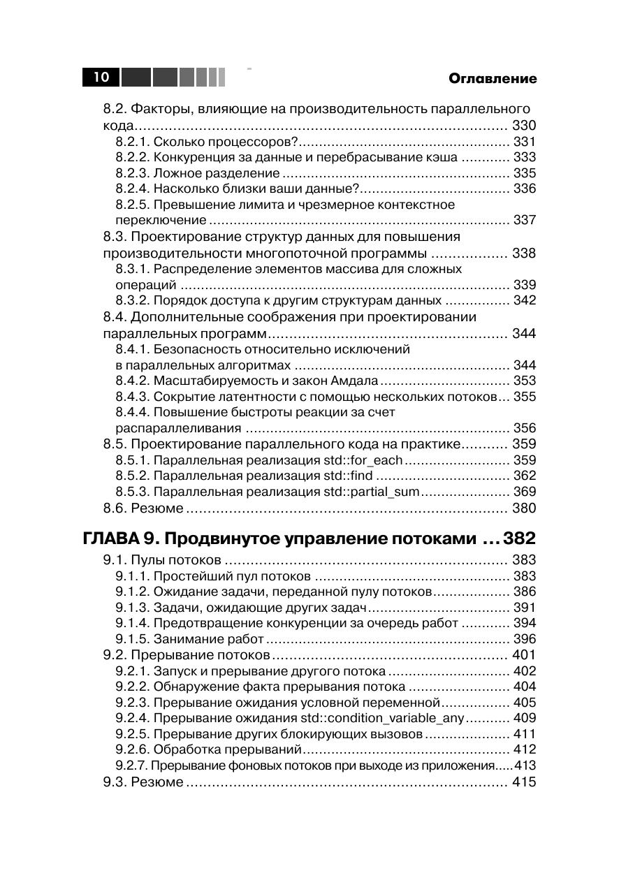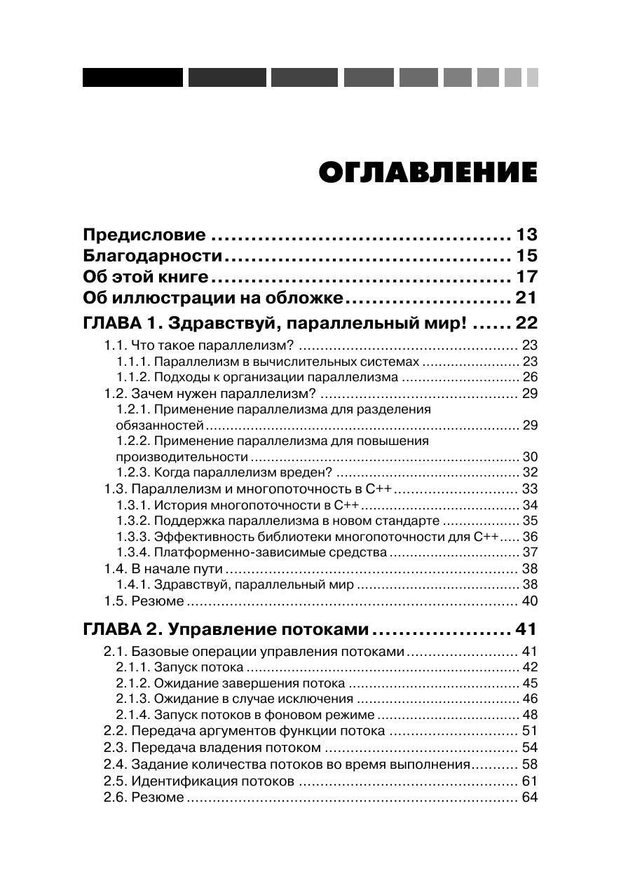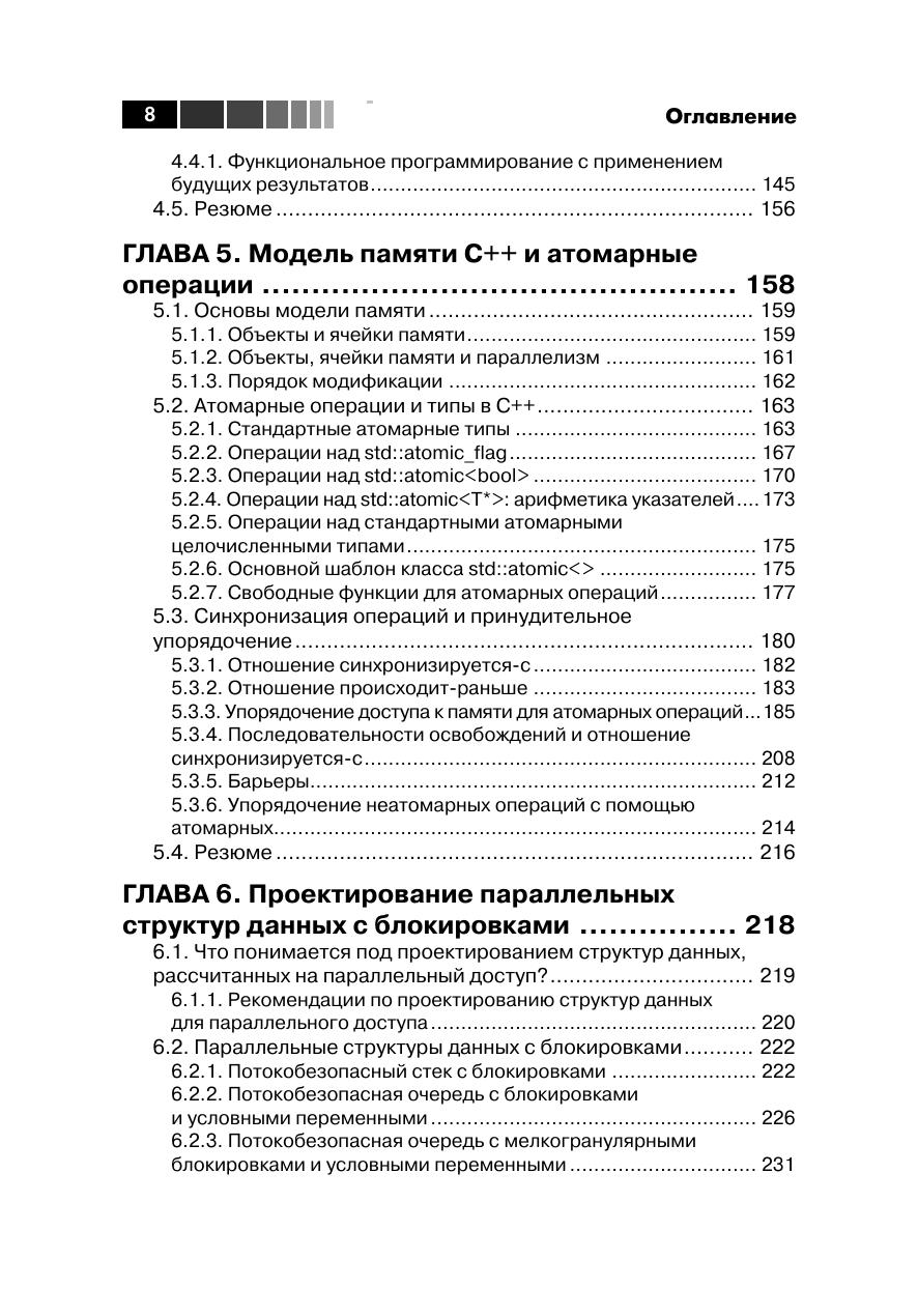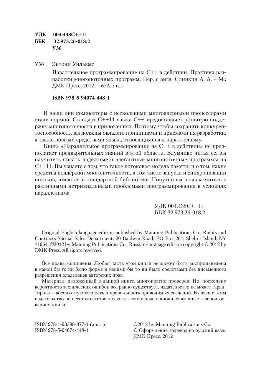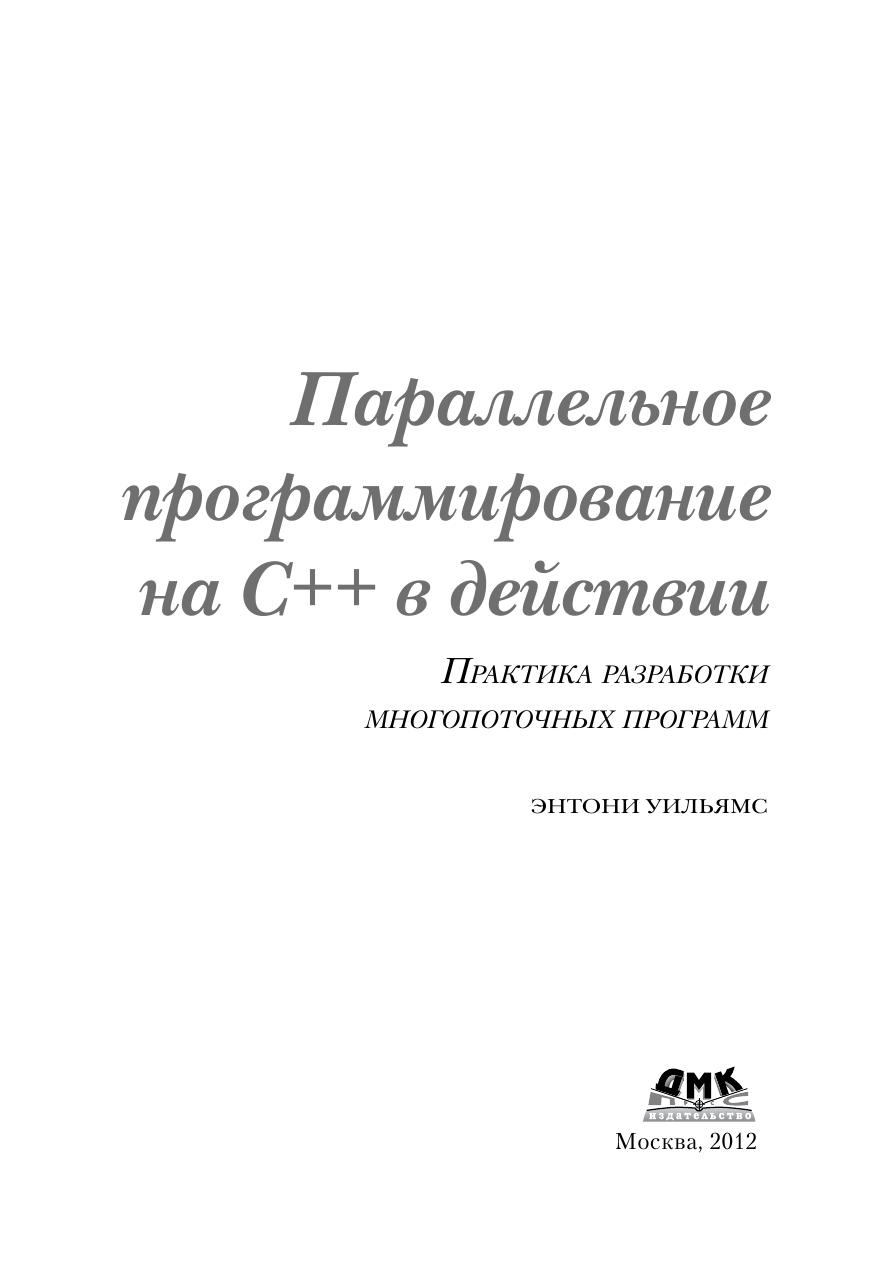 В наши дни компьютеры с несколькими многоядерными процессорами стали нормой. Стандарт C++11 языка C++ предоставляет развитую поддержку многопоточности в приложениях. Поэтому, чтобы сохранять конкурентоспособность, вы должны овладеть принципами и приемами их разработки, а также новыми средствами языка, относящимися к параллелизму. Книга «Параллельное программирование на С++ в действии» не предполагает предварительных знаний в этой области. Вдумчиво читая ее, вы научитесь писать надежные и элегантные многопоточные программы на C++11. Вы узнаете о том, что такое потоковая модель памяти, и о том, какие средства поддержки многопоточности, в том числе запуска и синхронизации потоков, имеются в стандартной библиотеке. Попутно вы познакомитесь сразличными нетривиальными проблемами программирования в условиях параллелизма.