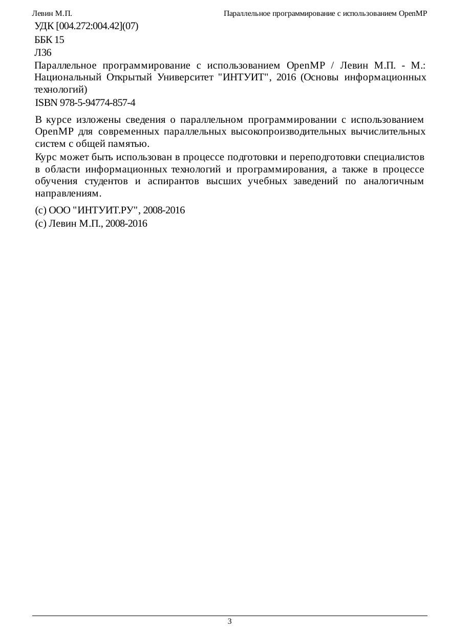 В курсе изложены сведения о параллельном программировании с использованием OpenMP для современных параллельных высокопроизводительных вычислительных систем с общей памятью. Курс может быть использован в процессе подготовки и переподготовки специалистов в области информационных технологий и программирования, а также в процессе обучения студентов и аспирантов высших учебных заведений по аналогичным направлениям.