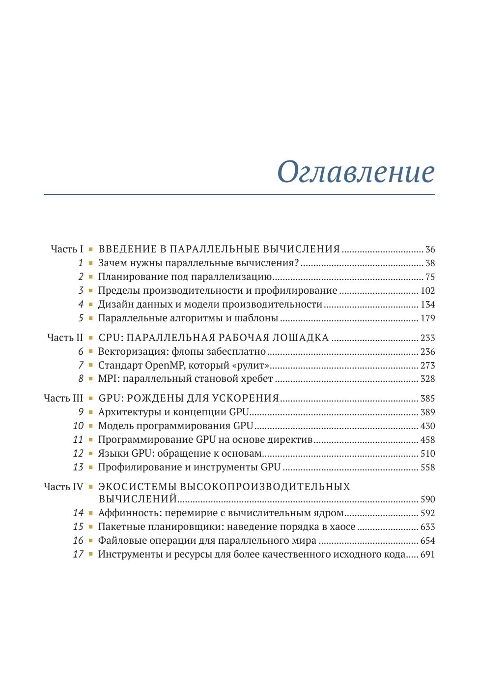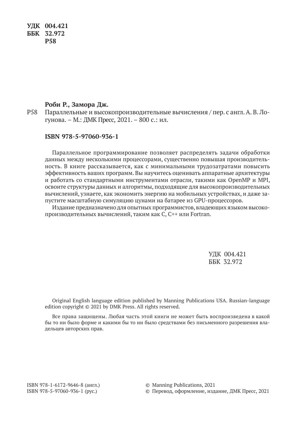 Параллельное программирование позволяет распределять задачи обработки данных между несколькими процессорами, существенно повышая производительность. В книге рассказывается, как с минимальными трудозатратами повысить эффективность ваших программ. Вы научитесь оценивать аппаратные архитектуры и работать со стандартными инструментами отрасли, такими как OpenMP и MPI, освоите структуры данных и алгоритмы, подходящие для высокопроизводительных вычислений, узнаете, как экономить энергию на наладонных устройствах, и даже запустите масштабную симуляцию цунами на батарее из GPU-процессоров.