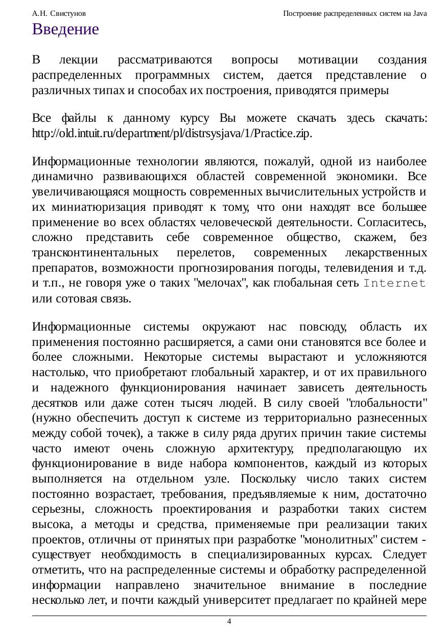 В этом курсе рассказывается о проблемах, cопровождающих разработку распределенных программных систем, и методах решения этих проблем. Все рассмотренные элементы технологии проиллюстрированы примерами, ознакомившись с которыми, читатели получат полное представление о методах разработки распределенных приложений на платформе J2EE. В рамках курса рассматривается ряд популярных способов разработки распределенных приложений с использованием технологии Java (API java.net, RMI, CORBA, Web-сервисы, JMS). Все рассматриваемые технологии и программные средства либо входят в стандартный комплект поставки J2SE, либо могут быть свободно загружены с сайтов компаний-разработчиков.