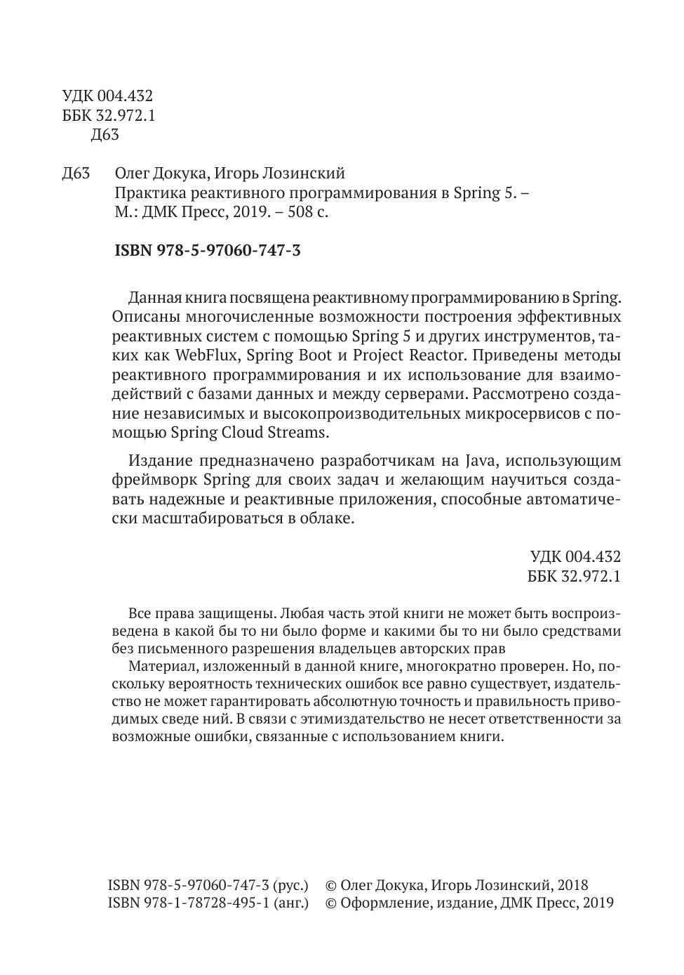 Издание адресовано разработчикам на Java, использующим фреймворк Spring для своих приложений и желающих научиться создавать надежные и реактивные приложения, способные автоматически масштабироваться в облаке. Знание основ распределенных систем и асинхронного программирования поможет вам лучше понять темы, охватываемые книгой.