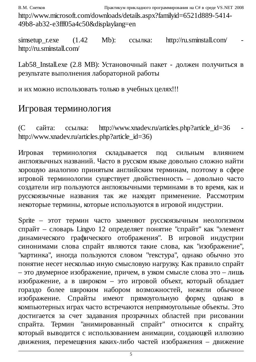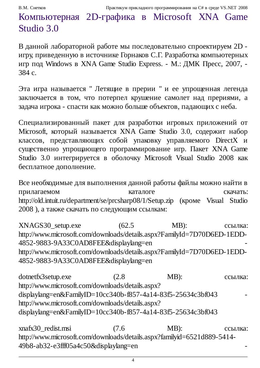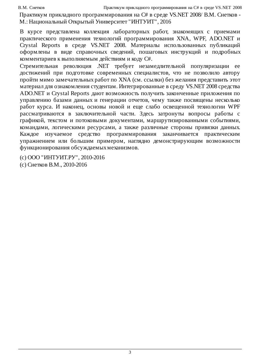 В курсе представлена коллекция лабораторных работ, знакомящих с приемами практического применения технологий программирования XNA, WPF, ADO.NET и Crystal Reports в среде VS.NET 2008. Материалы использованных публикаций оформлены в виде справочных сведений, пошаговых инструкций и подробных комментариев к выполняемым действиям и коду C#. Стремительная революция .NET требует незамедлительной популяризации ее достижений при подготовке современных специалистов, что не позволило автору пройти мимо замечательных работ по XNA (см. ссылки) без желания представить этот материал для ознакомления студентам. Интегрированные в среду VS.NET 2008 средства ADO.NET и Crystal Reports дают возможность получить законченные приложения по управлению базами данных и генерации отчетов, чему также посвящены несколько работ курса. И наконец, основы новой и еще слабо освещенной технологии WPF рассматриваются в заключительной части. Здесь затронуты вопросы работы с графикой, текстом и потоковыми документами, маршрутизированными событиями, командами, логическими ресурсами, а также различные стороны привязки данных. Каждое изучаемое средство программирования заканчивается практическим упражнением или большим примером, наглядно демонстрирующим возможности функционирования обсуждаемых механизмов.