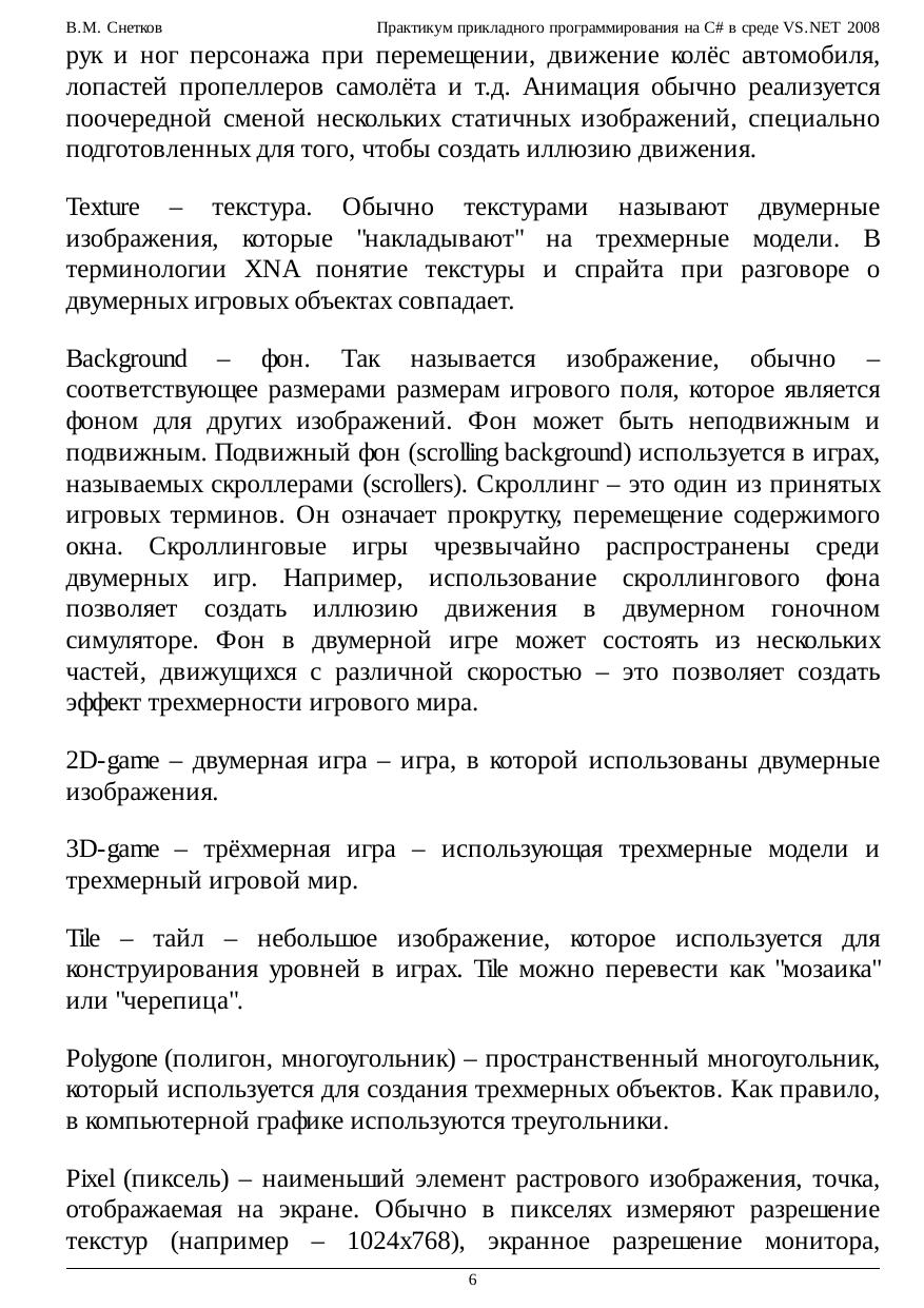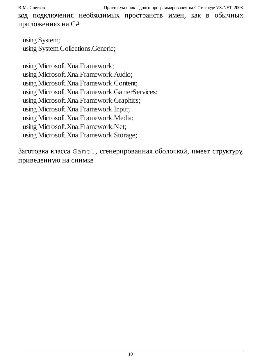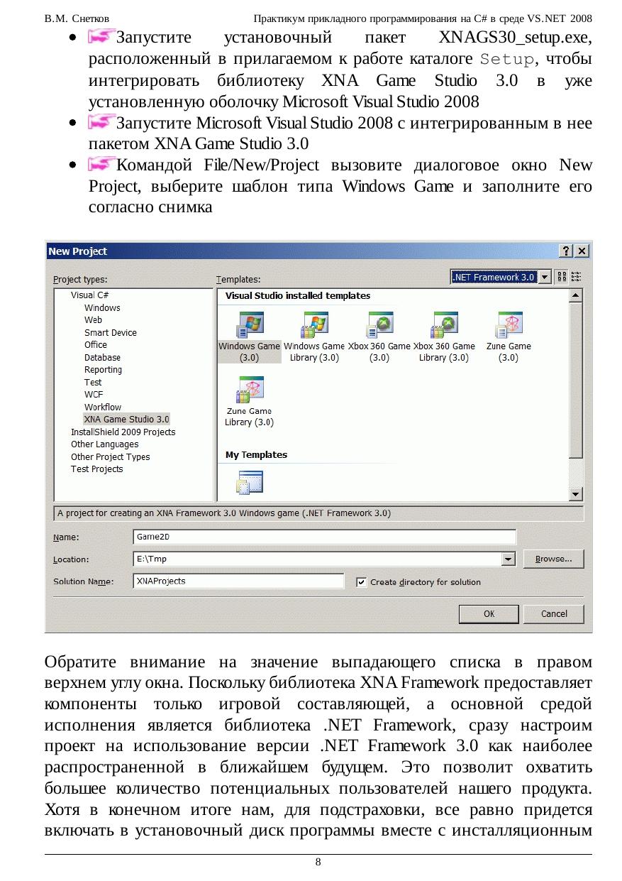 В курсе представлена коллекция лабораторных работ, знакомящих с приемами практического применения технологий программирования XNA, WPF, ADO.NET и Crystal Reports в среде VS.NET 2008. Материалы использованных публикаций оформлены в виде справочных сведений, пошаговых инструкций и подробных комментариев к выполняемым действиям и коду C#. Стремительная революция .NET требует незамедлительной популяризации ее достижений при подготовке современных специалистов, что не позволило автору пройти мимо замечательных работ по XNA (см. ссылки) без желания представить этот материал для ознакомления студентам. Интегрированные в среду VS.NET 2008 средства ADO.NET и Crystal Reports дают возможность получить законченные приложения по управлению базами данных и генерации отчетов, чему также посвящены несколько работ курса. И наконец, основы новой и еще слабо освещенной технологии WPF рассматриваются в заключительной части. Здесь затронуты вопросы работы с графикой, текстом и потоковыми документами, маршрутизированными событиями, командами, логическими ресурсами, а также различные стороны привязки данных. Каждое изучаемое средство программирования заканчивается практическим упражнением или большим примером, наглядно демонстрирующим возможности функционирования обсуждаемых механизмов.
